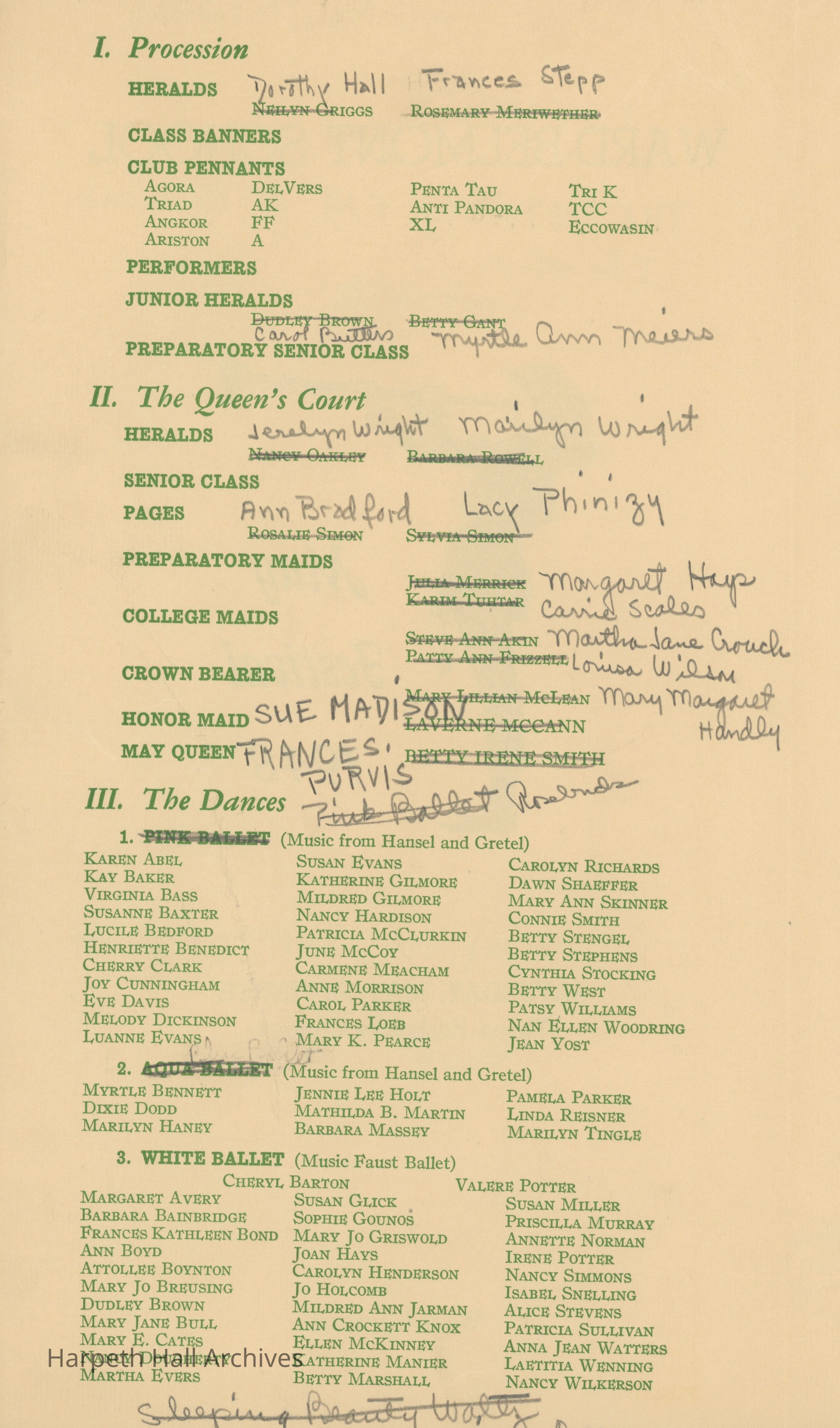 The annual May Day Festival was described as "the highlight of the social year at Ward-Belmont" (Milestones, 1945). The festivities involved dancing, processions, the crowning of the May Queen and her court, and the traditional May Pole Dance. The Lady of the Hall, Harpeth Hall's highest honor, evolved from the May Queen ceremony.Collection