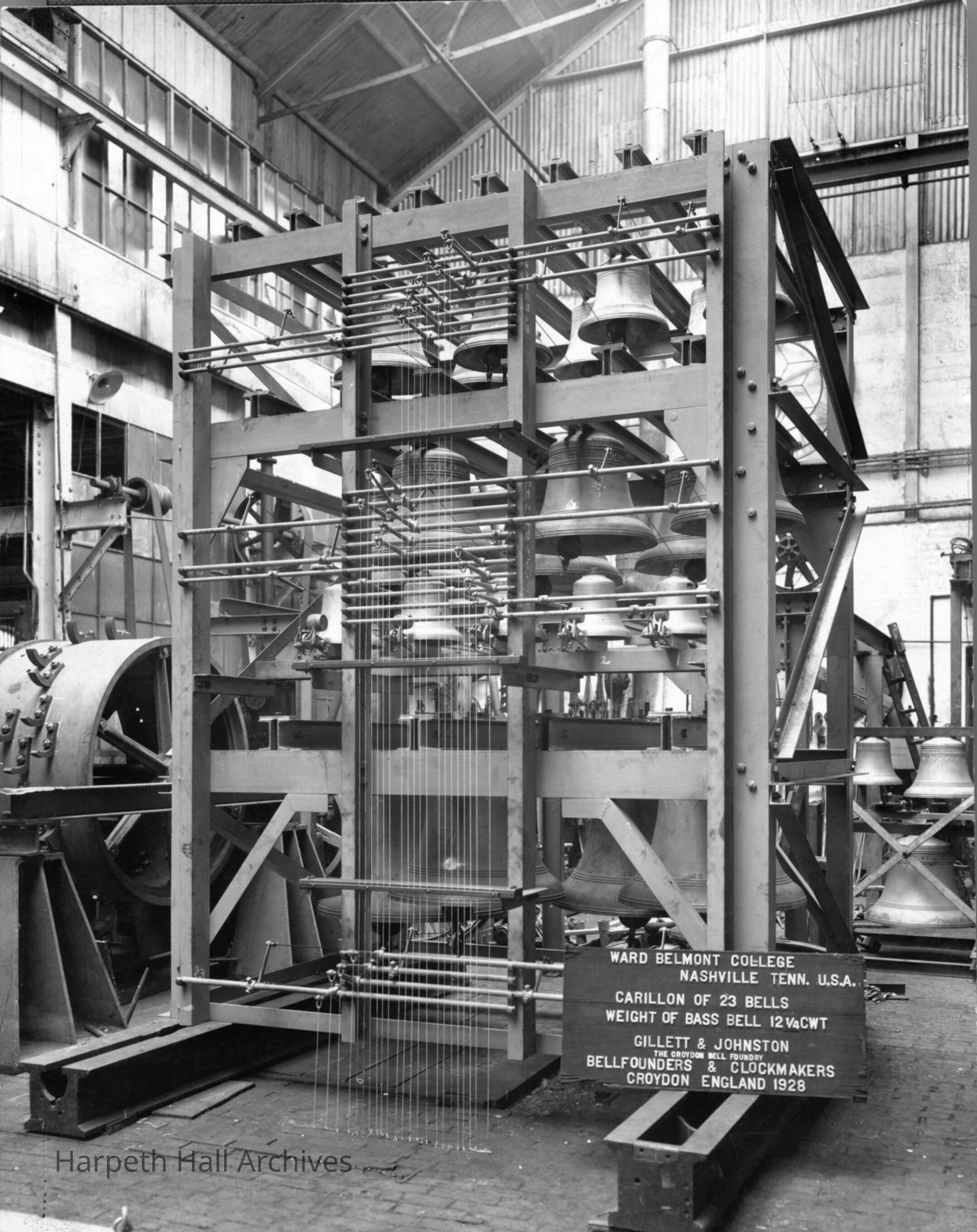 Picture of bells with sign that reads, "Ward Belmont College - Nashville Tenn. U.S.A. - Carillon of 23 bells - weight of bass bell 12 1/4 CWT - Gillett & Johnston - the Croydon Bell Foundrey - Bellfounders & clockmakers - Croydon England 1928.