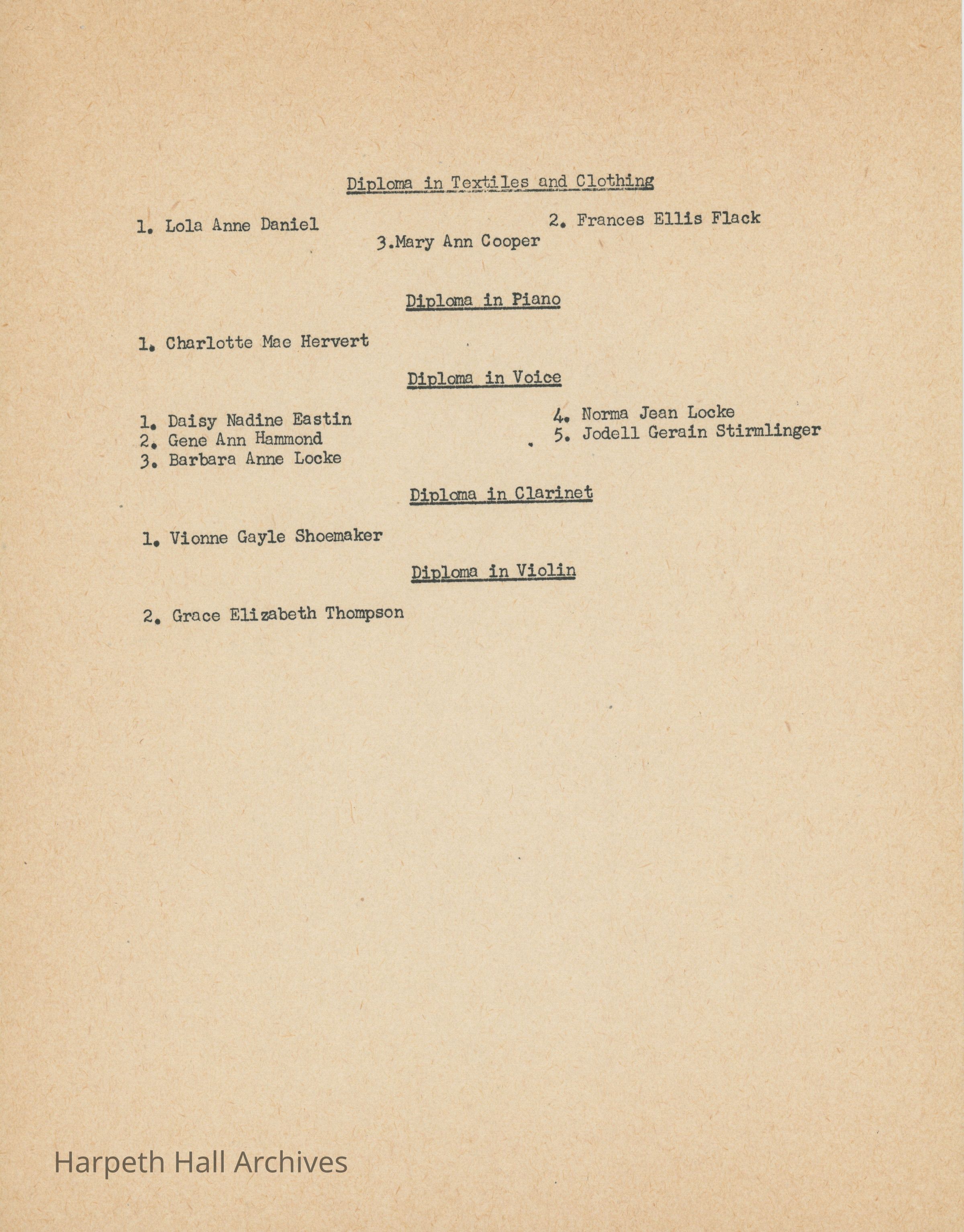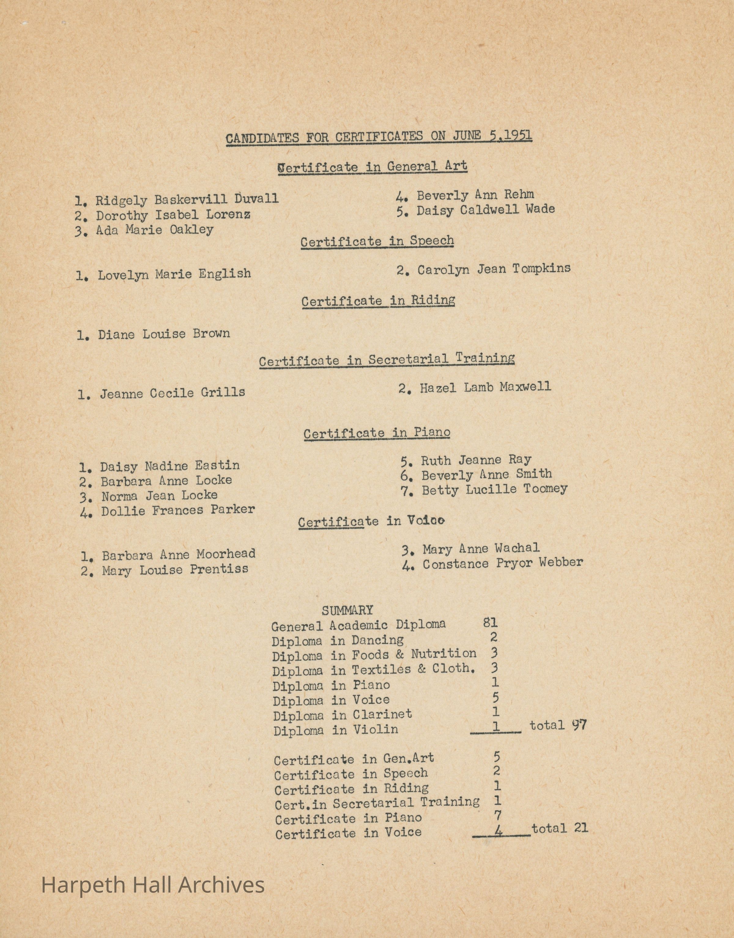 List of students receiving general academic diplomas, diplomas in dance, foods and nutrition, textiles and clothing, piano, violin, clarinet, and voice. A list of students receiving certificates in general art, speech, riding, secretarial training, piano, and violin are also included. A total of 97 girls received diplomas, and 21 received certificates.Collection