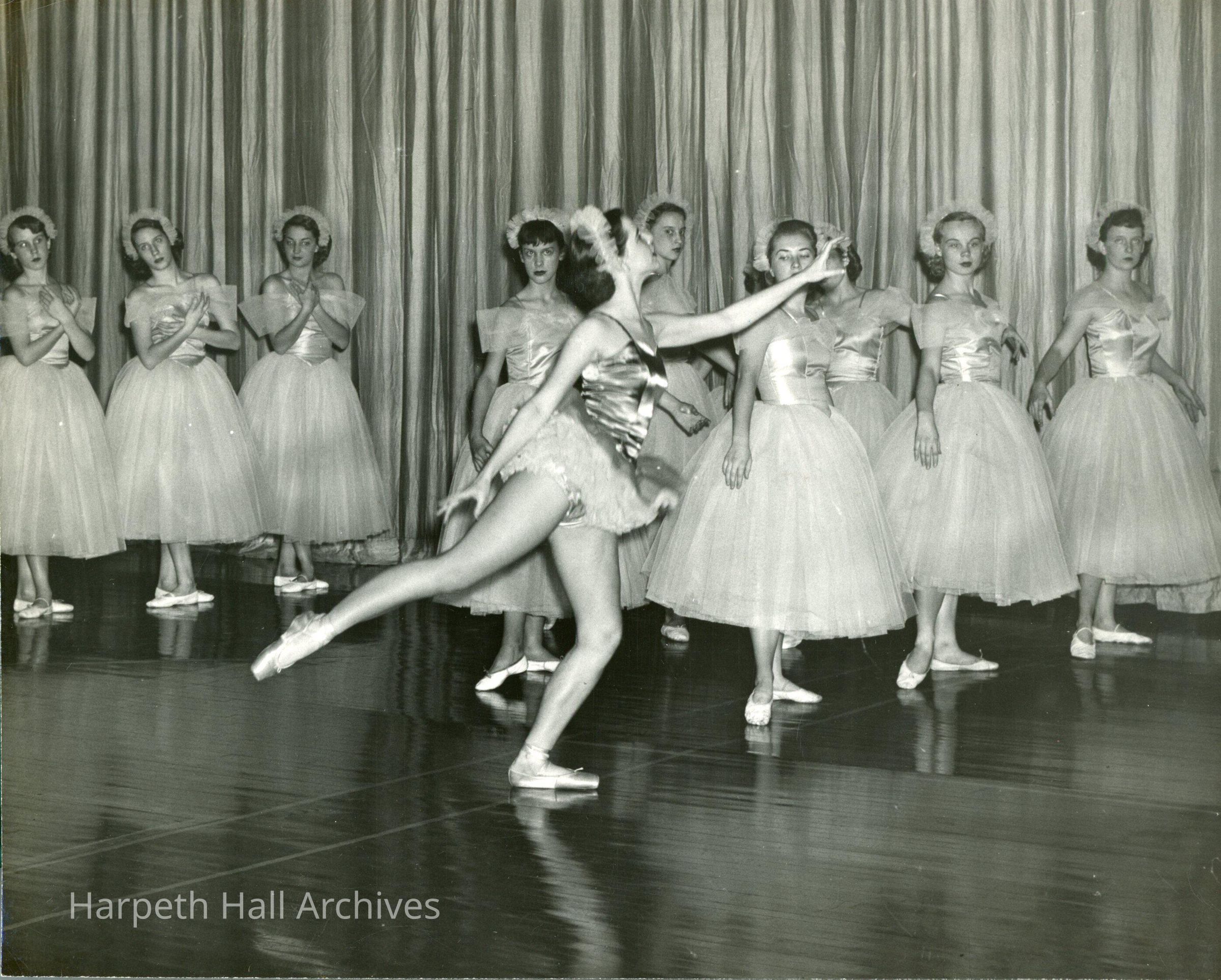 Unidentified ballet dancer with several dancers behind her. Possibly performing Swan Lake? Picture appears in "Celebrating Milestones" book, Chapter 1, page 19.