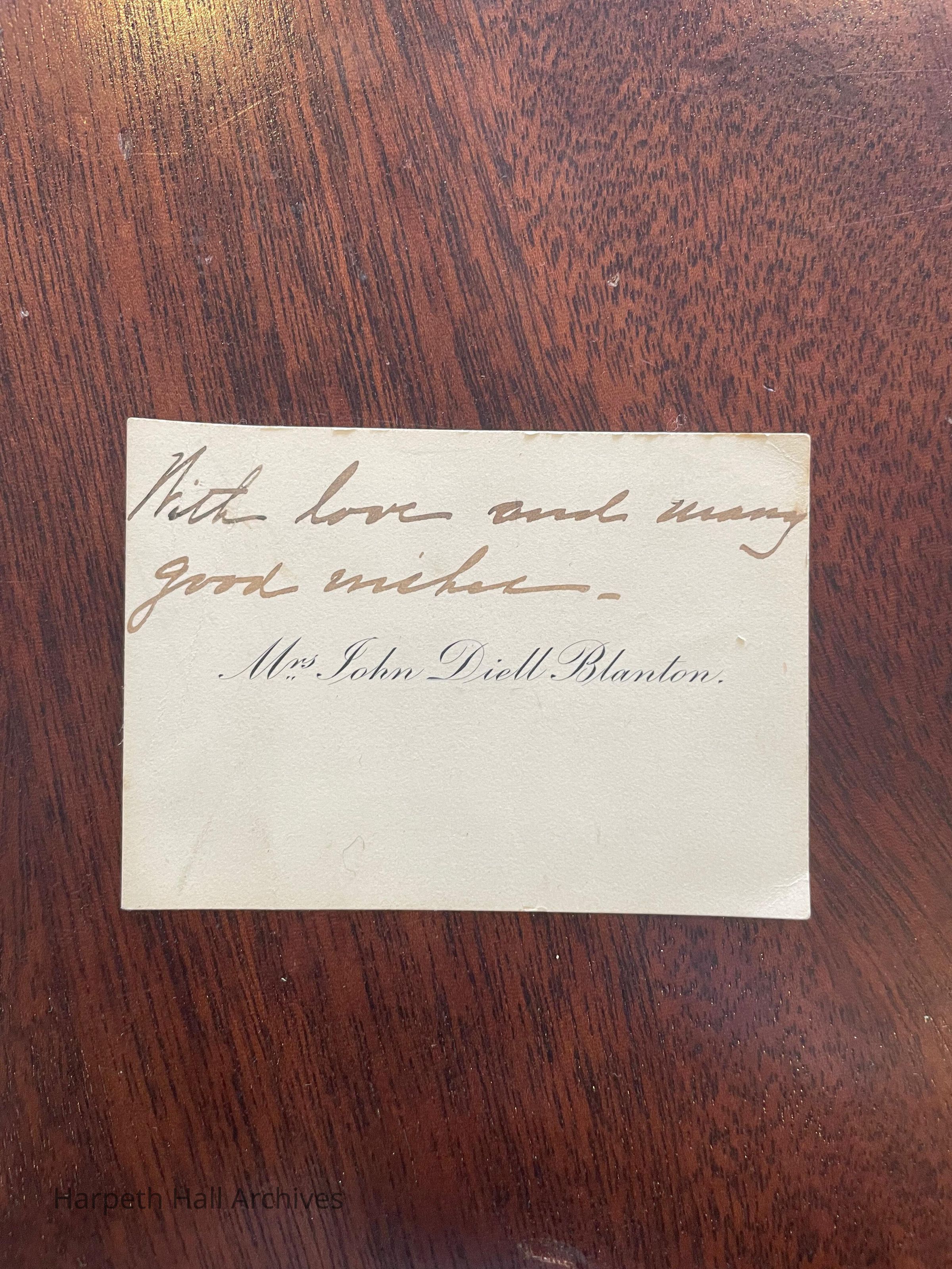 A name card for Mrs. Blanton with well wishes. "With love and many good wishes - Mrs. John Diell Blanton"Context