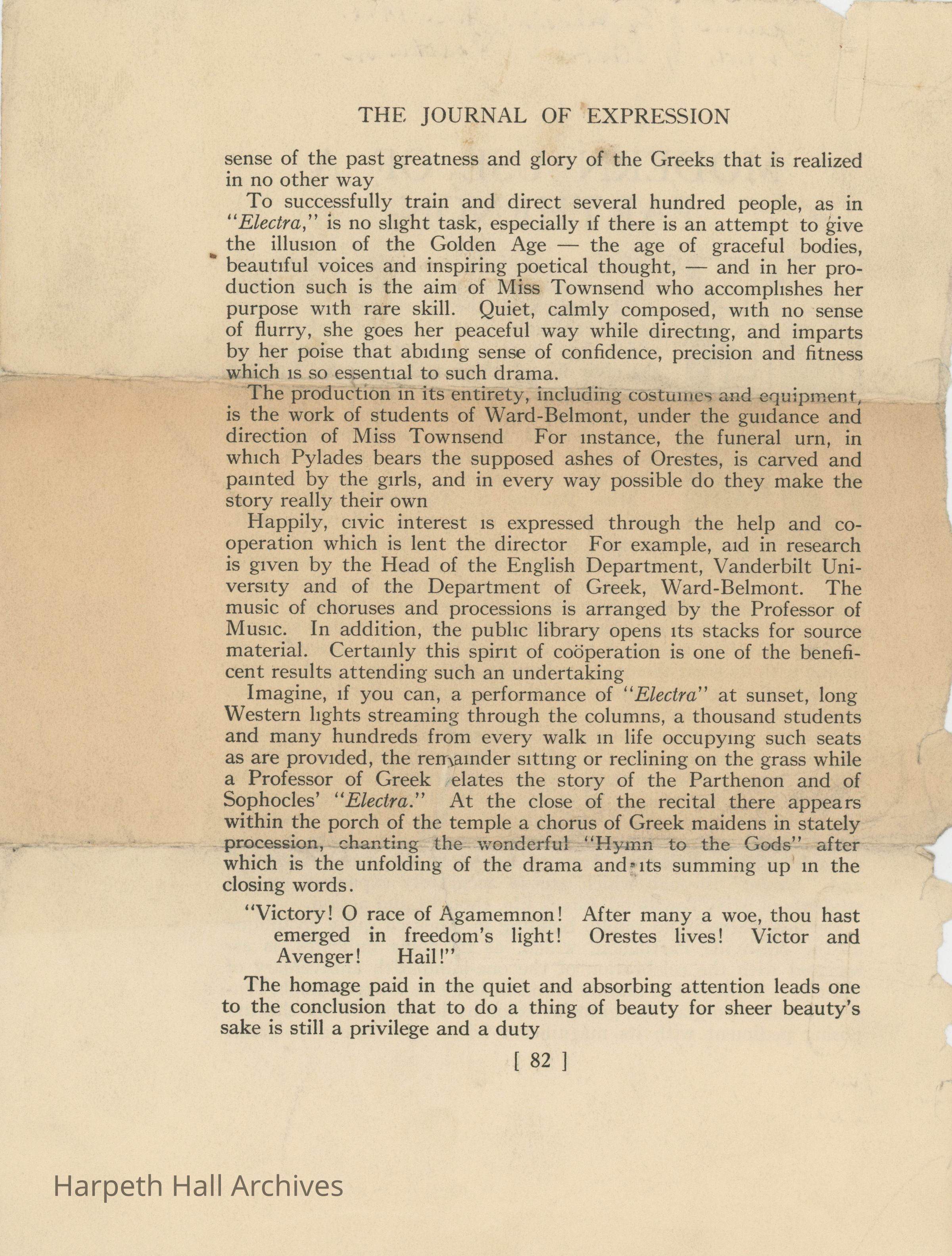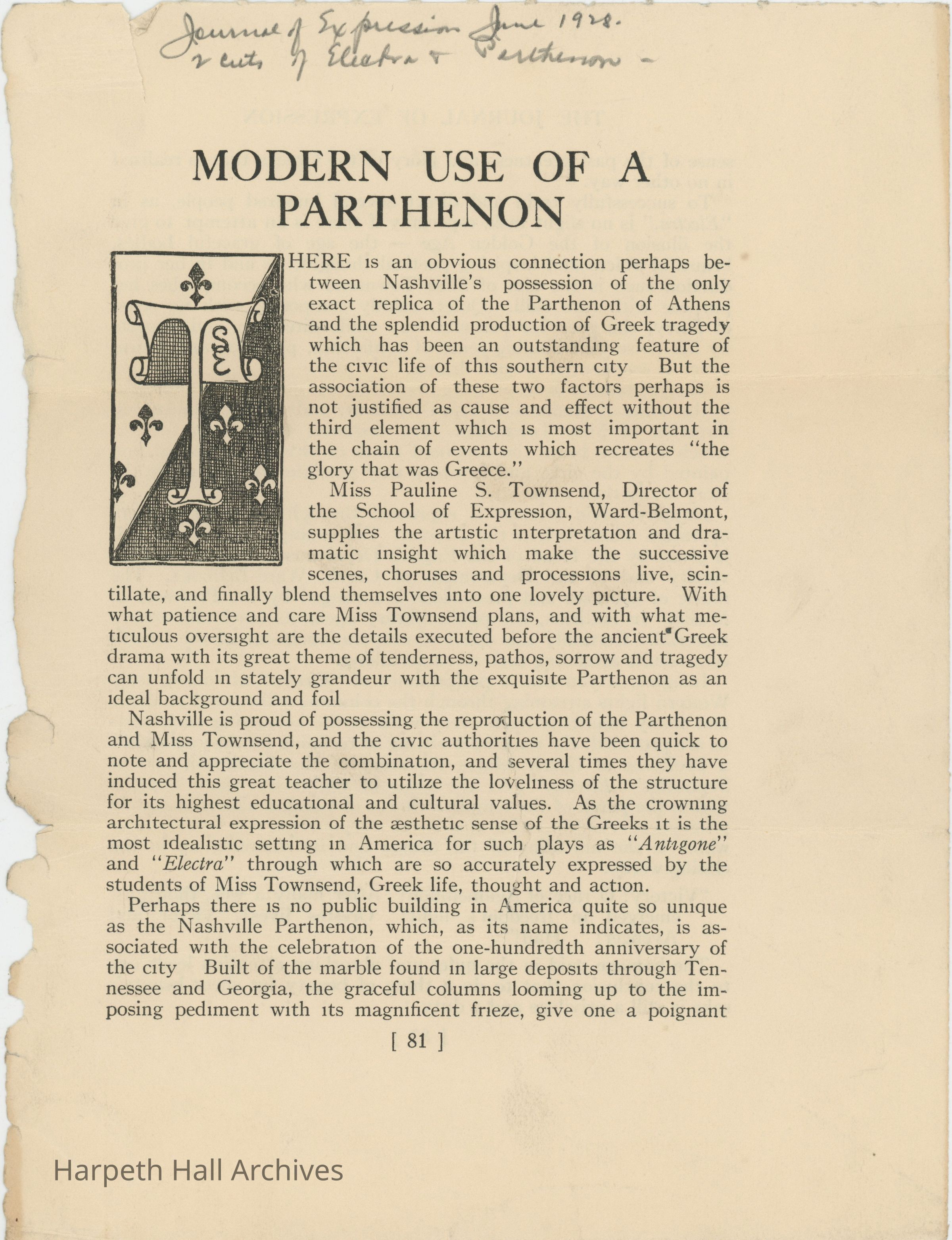 A June 1928 article from the Journal of Expression discussing Miss Pauline Sherwood Townsend and her direction of Ward-Belmont students in Sophocles' Greek tragedy "Electra" at the Nashville Parthenon.Context