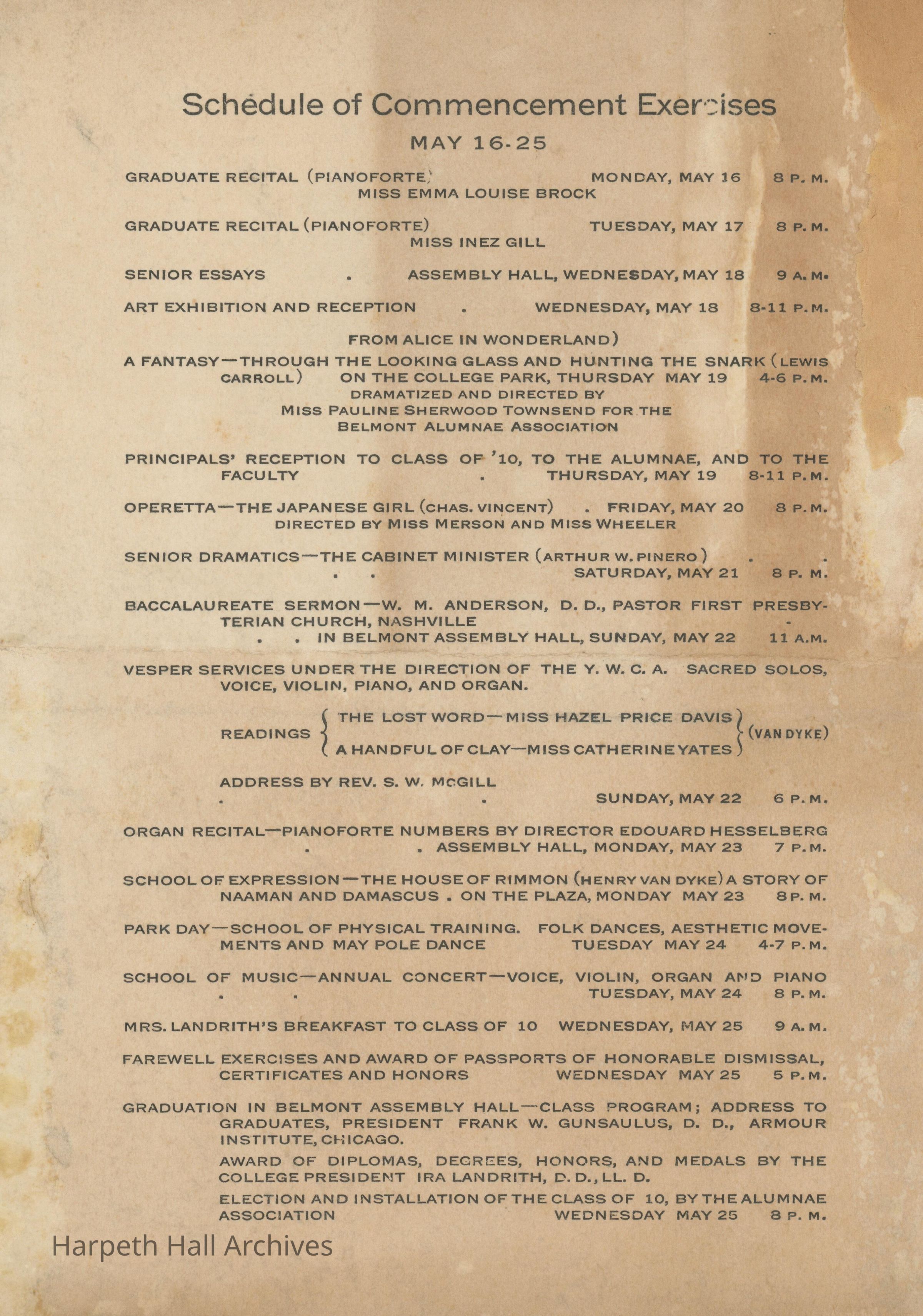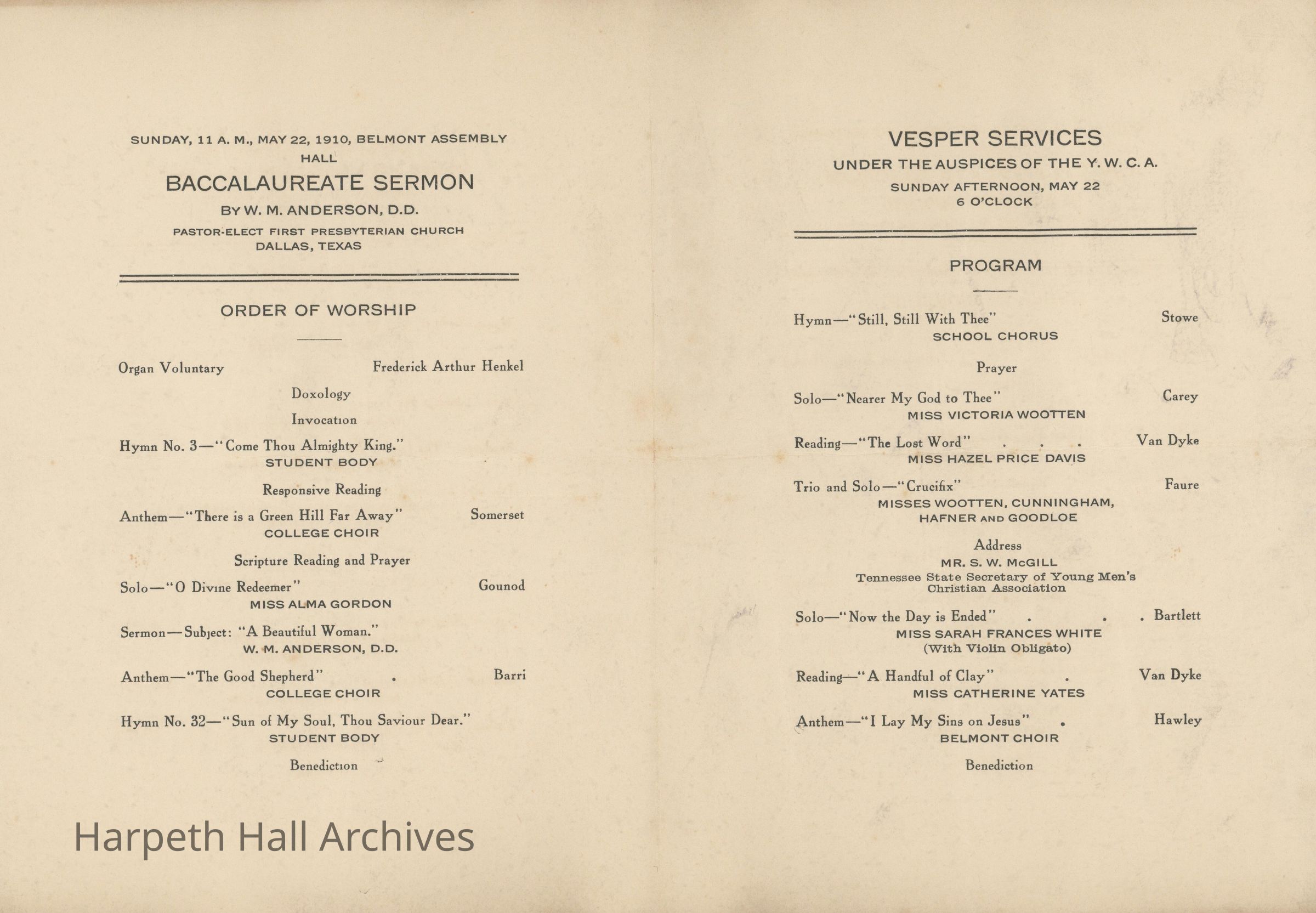 Program for the Twentieth Commencement Sunday at Belmont College in Nashville, TN on May 22, 1910. Program for Baccalaureate Sermon at 11 AM by W.M. Anderson, D.D., Pastor-Elect of First Presbyterian Church in Dallas, Texas on the inside left. Features Frederick Arthur Henkel, Alma Gordon, W.M. Anderson, D.D. Program for Vesper Services at 6 PM on the inside right. Features Victoria Wootten, Hazel Price Davids, Miss Cunningham, Miss Hafner, Miss Goodloe, S.W. McGill, Sarah Frances White, Catherine Yates. Back cover shows Schedule of Commencement Exercises from May 16-25. Features Emma Louise Brock, Inez Gill, Pauline Sherwood Townsend, Miss Merson, Miss Wheeler, W.M. Anderson, D.D., Hazel Price Davids, Catherine Yates, Ira Landrith, D.D., LL.D., Frank W. Gunsaulus, D.D. Note: Duplicate copy in RG 1 / BEL / BOX 1 / Folder 7Collection