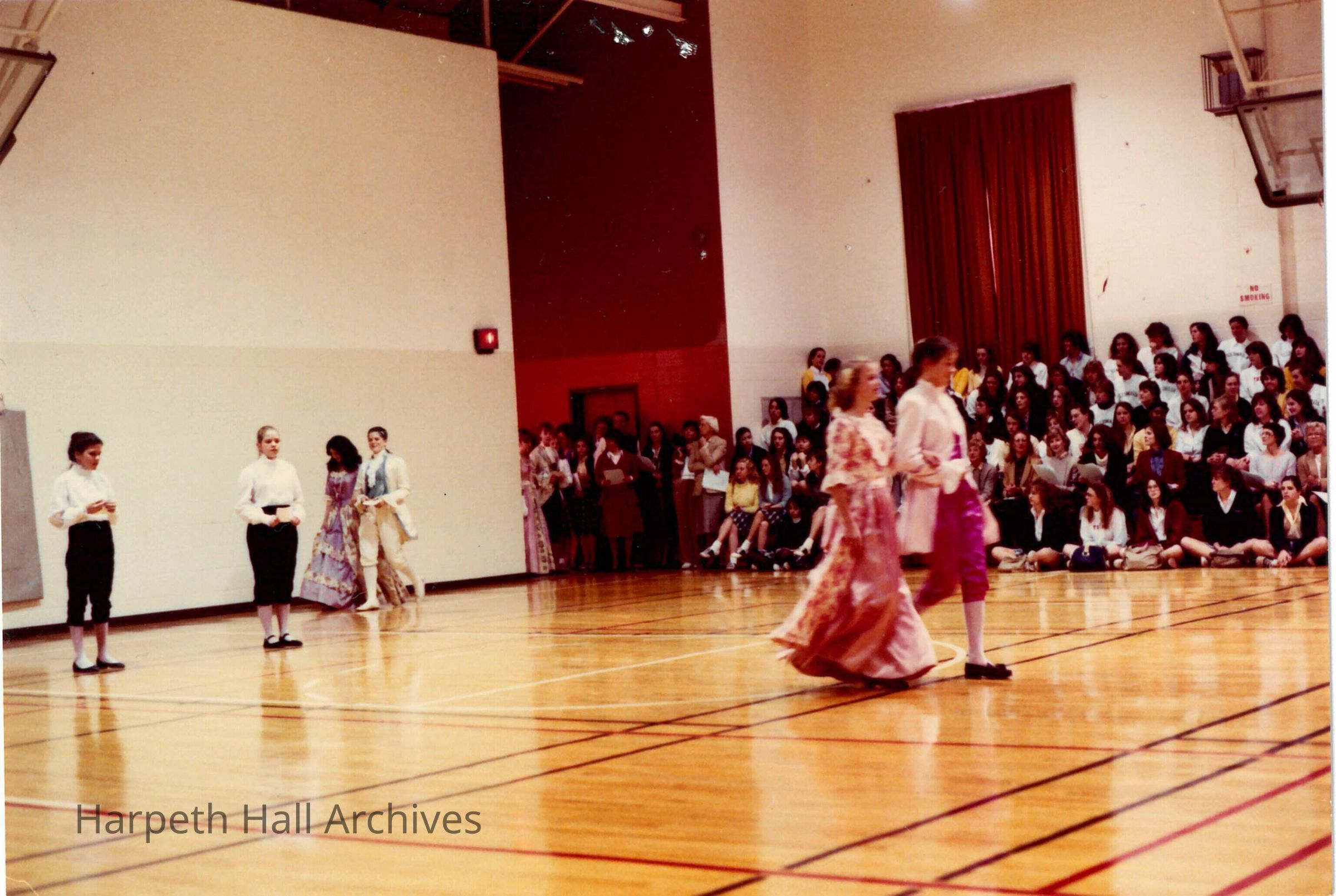 A group of students performing in the George Washington Day Celebration. The photo is taken in Morrison Gym in the McMurry Center.Context