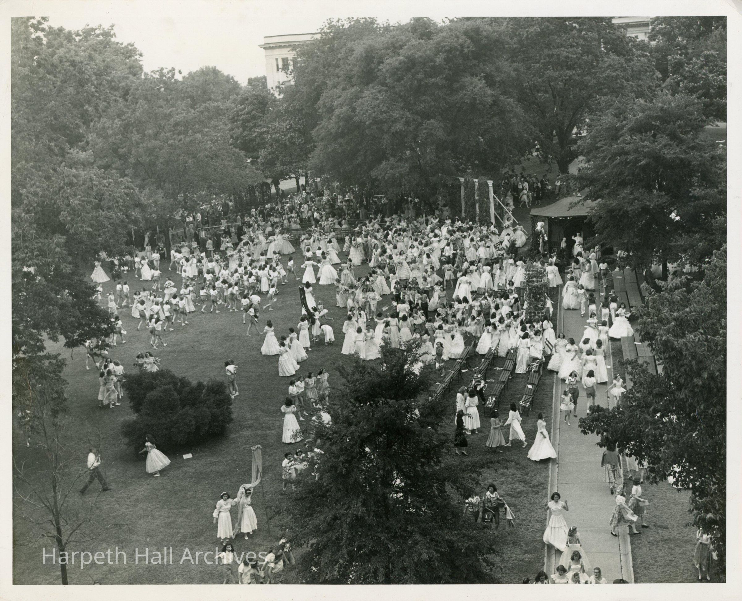 Large crowd of young women in long white dresses on the lawn at Ward-Belmont. May Day.