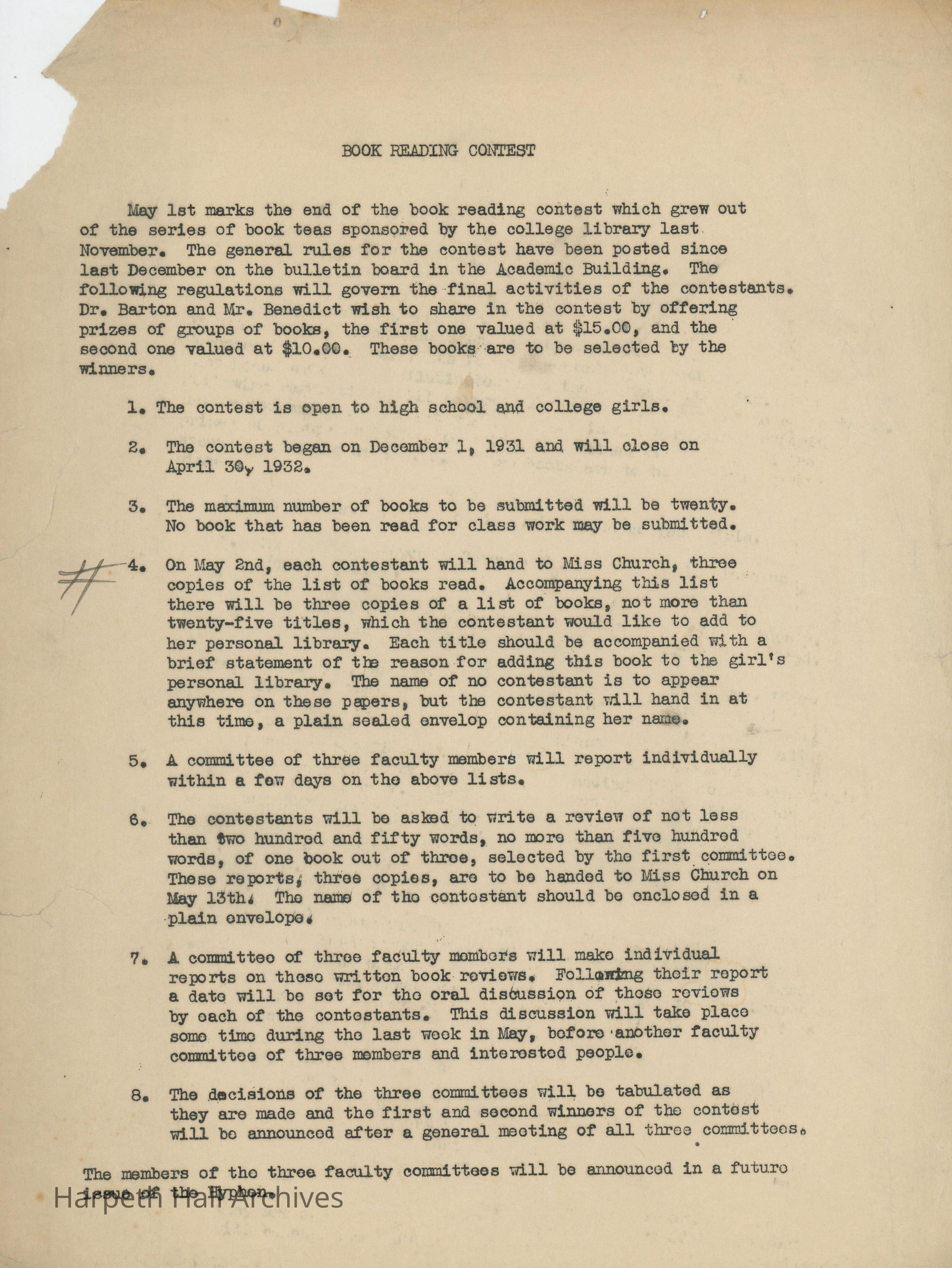 A list of rules and regulations for a book reading contest open to high school and college students at Ward-Belmont, held from December 1, 1931 to April 30, 1932.Context
