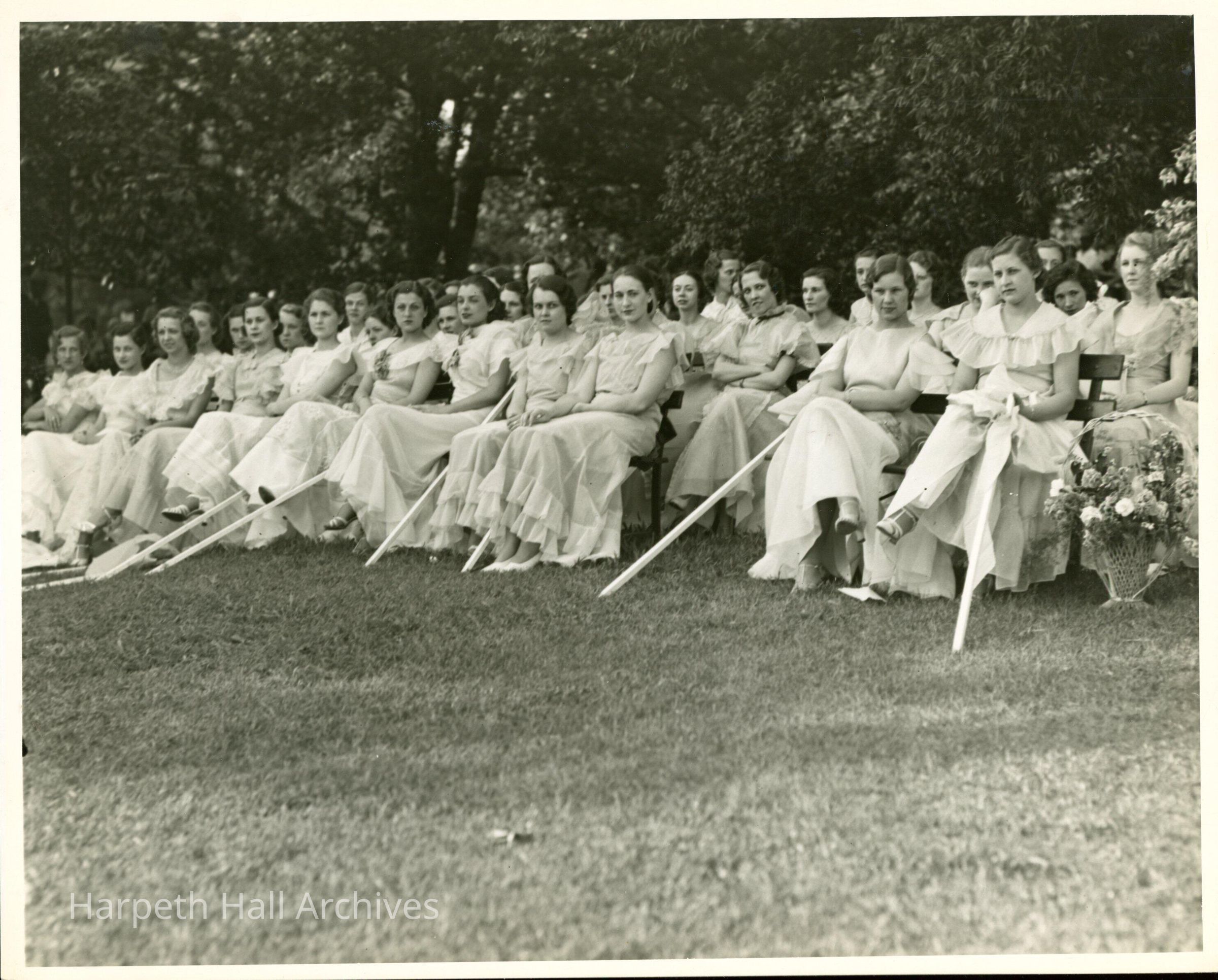Young women in long white dresses seated on a lawn; most likely May Day at Ward-Belmont.