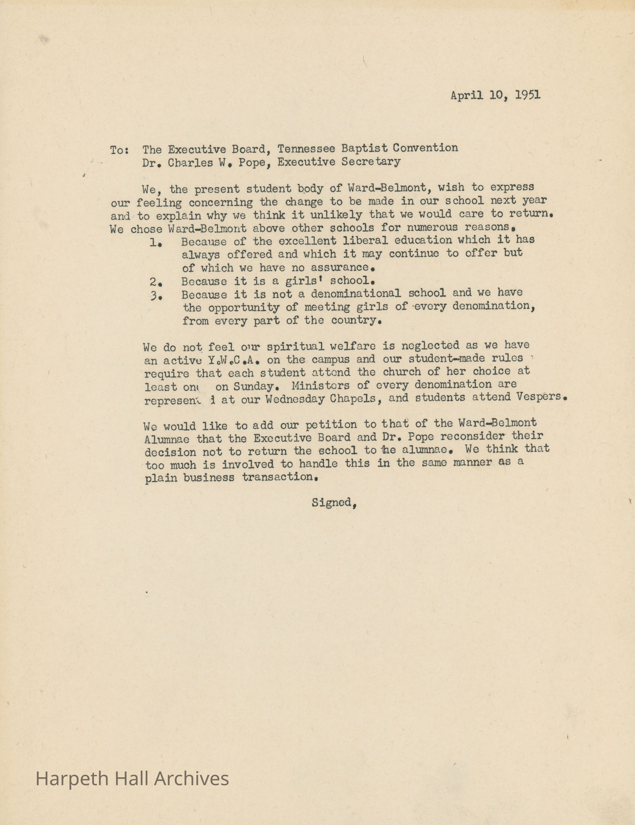 Letter from the present student body of Ward-Belmont to the Executive Board of the TBC petitioning that the school be given to WB alumnae. The students express their disdain for the TBC takeover, citing three reasons why they chose Ward-Belmont in the first place and why they would be unlikely to return to the Baptist-controlled Belmont.Context