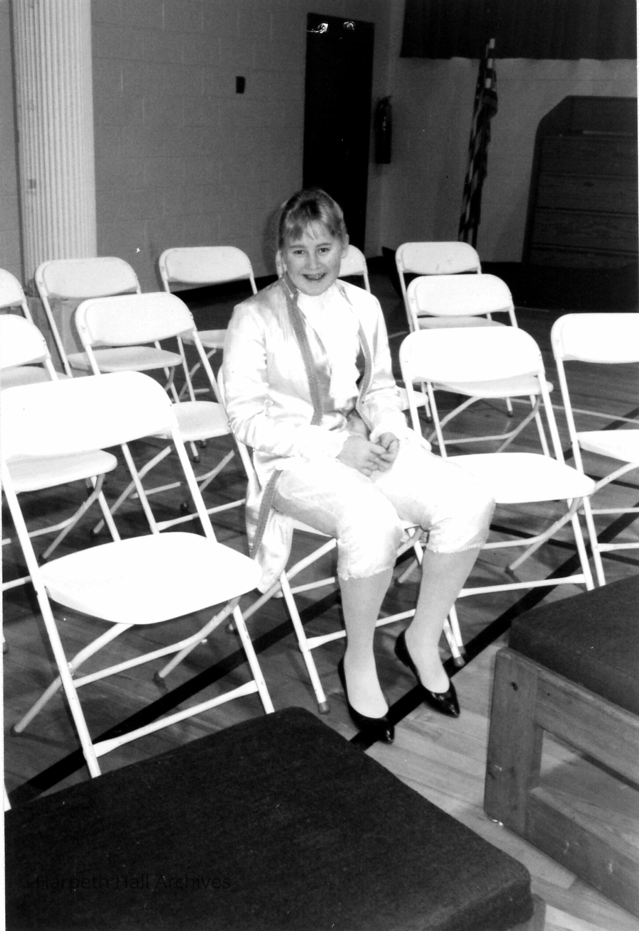 A student sitting in costume in Morrison Gym for the George Washington Day Celebration.Context