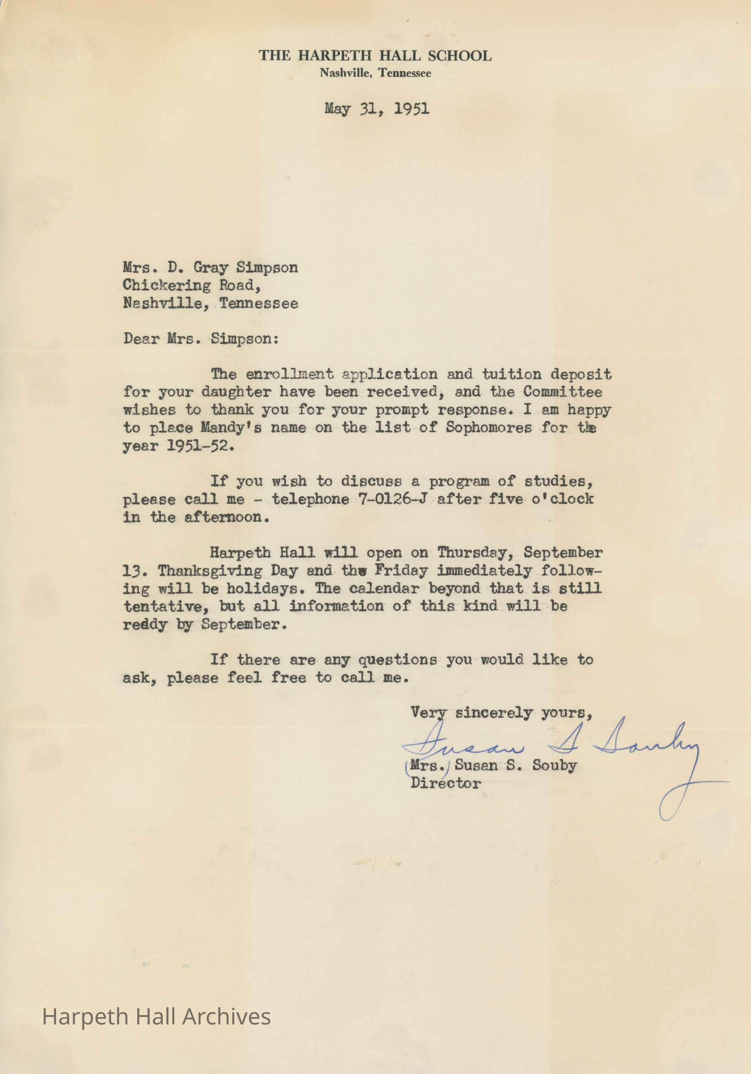 Letter from Susan Souby to Mrs. Simpson regarding Mandy Simpson's continuing her high school education at Harpeth Hall.Context