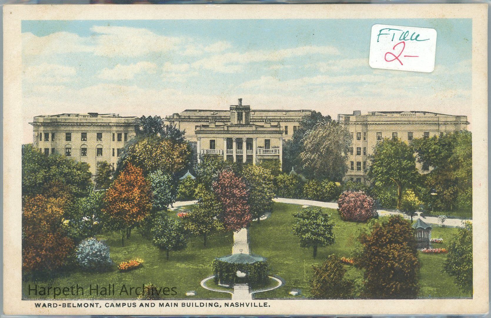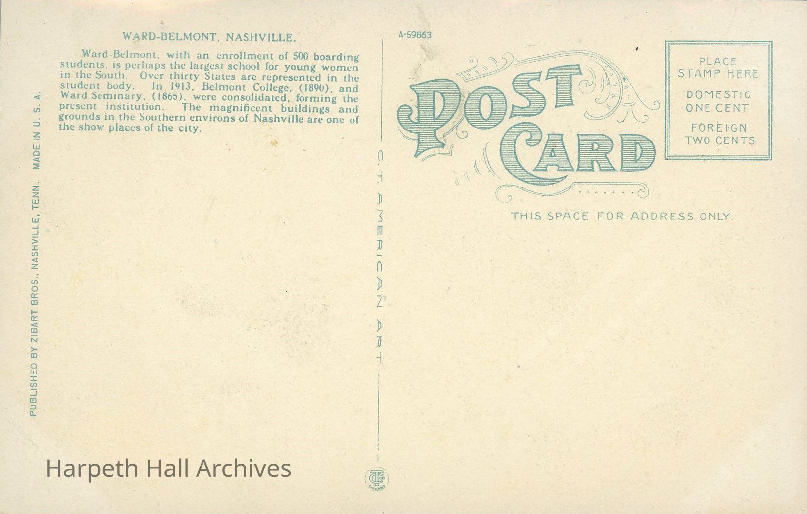 A postcard featuring an image of the Ward-Belmont campus and main building in Nashville, Tennessee. Historical information on Ward-Belmont is included on the back of the postcard. The card was published by Zibart Bros. in Nashville, was made in the U.S.A., and required either a one cent domestic stamp or two cent foreign stamp.Context