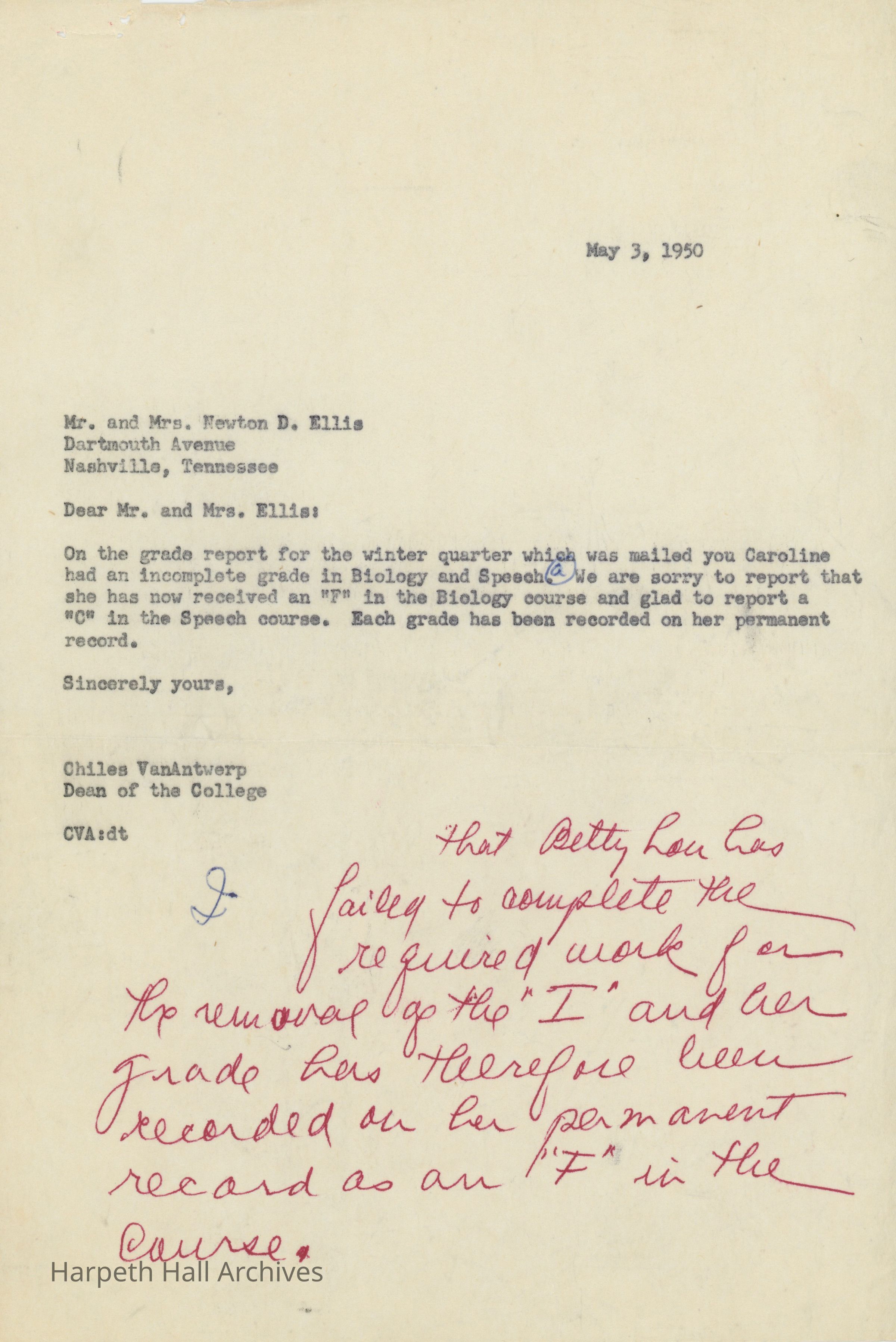 Letter to the parents of Caroline Ellis that their daughter who previously had an "I" for incomplete in her biology and speech courses has how earned an "F" and "C", respectively. Includes a note for a student Betty Lou who also had an incomplete in a course, but that grade has since been updated to an "F".Collection