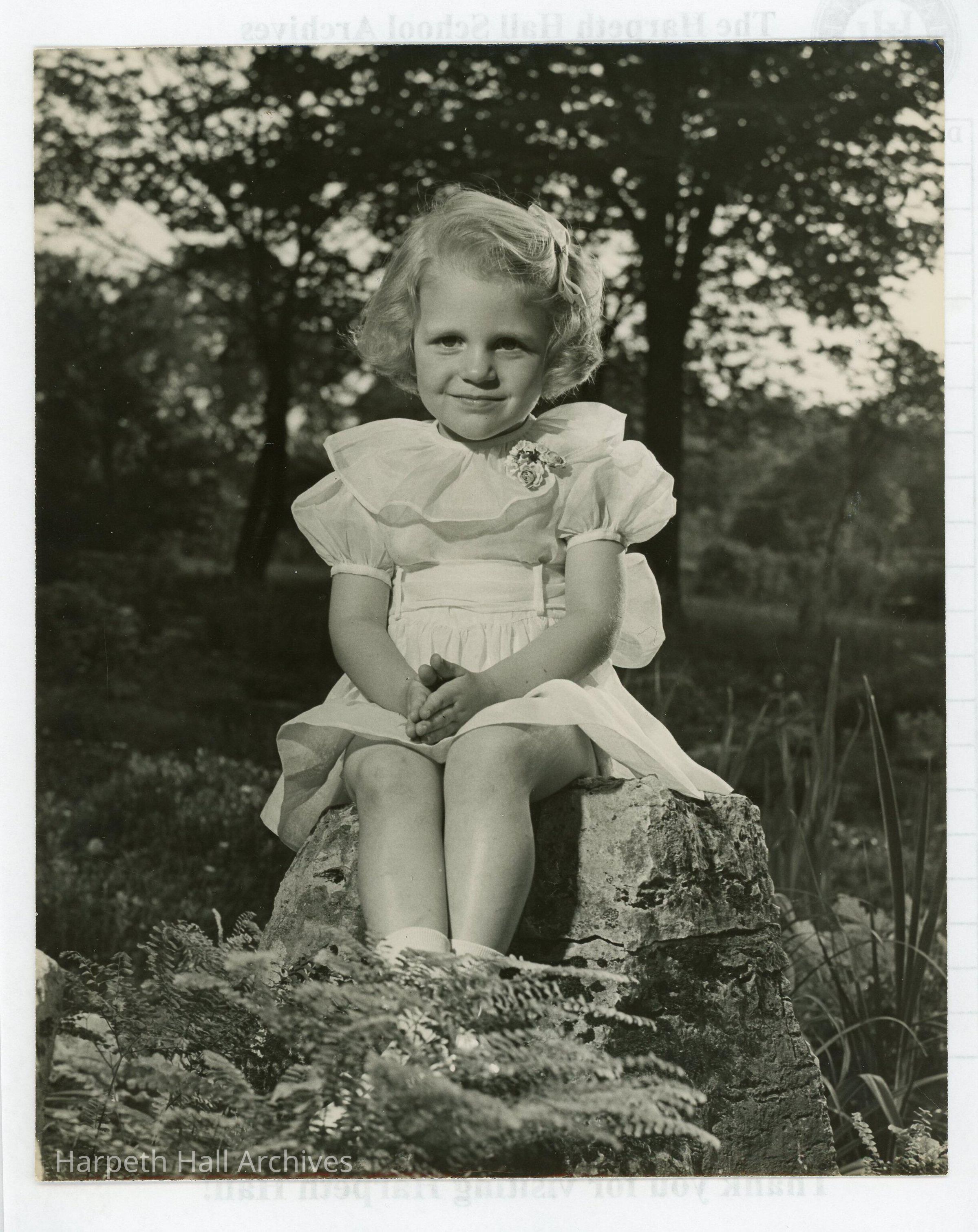 The 1950 May Court Crown Bearer, Karen Nelson (1964), is sitting on a large rock with trees in the background.