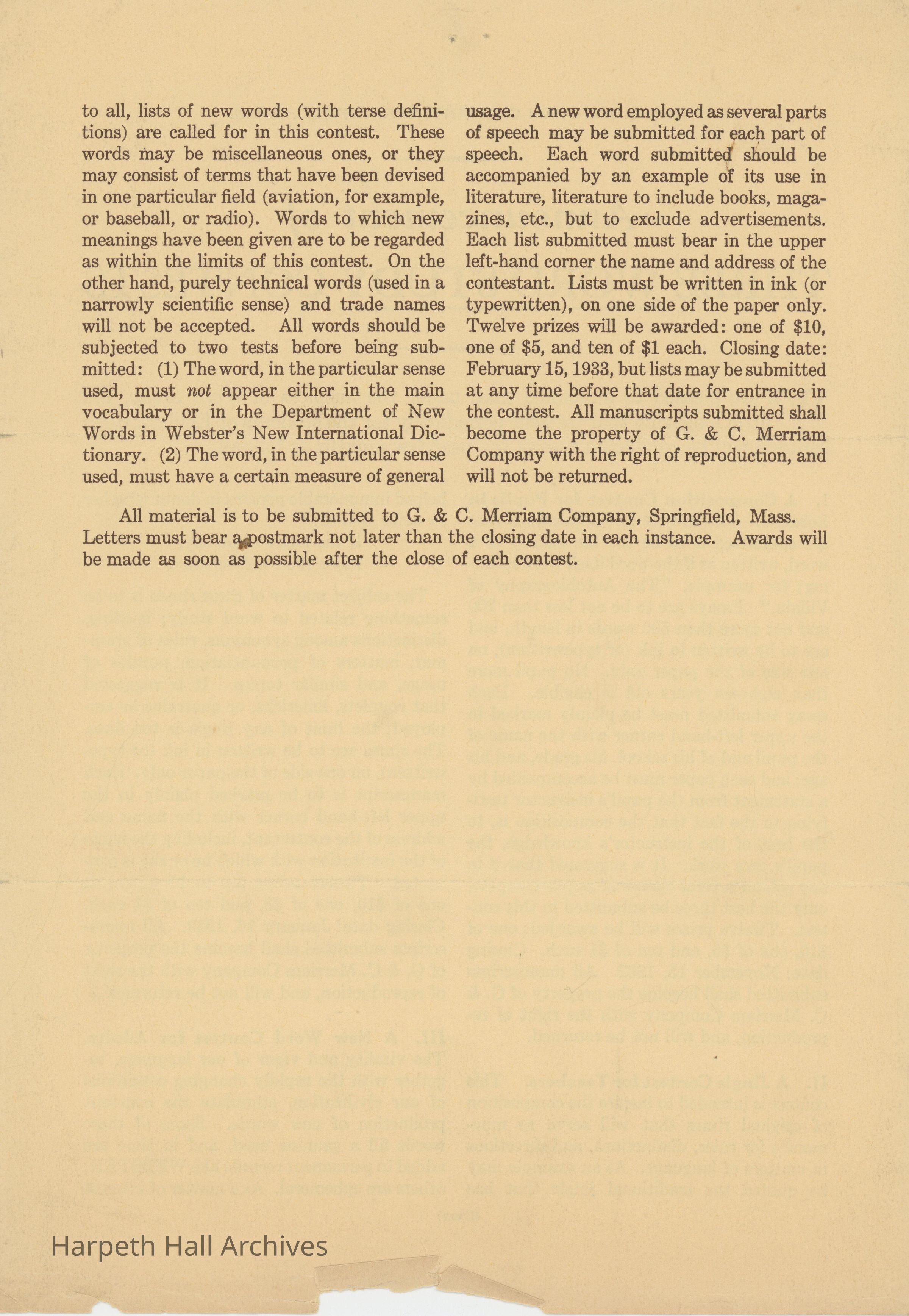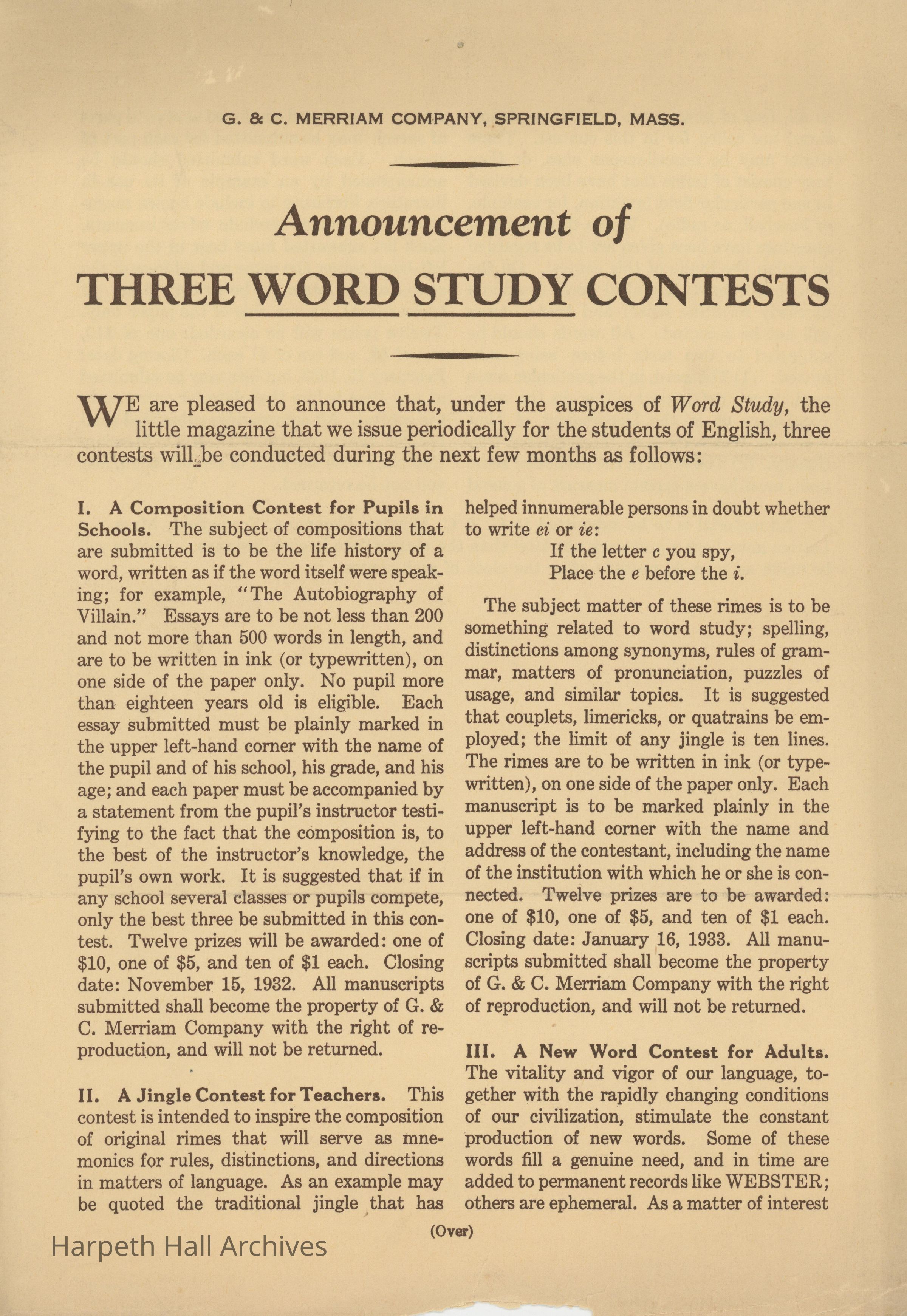 An announcement of three word study contests sent to Ward-Belmont by the G & C Merriam Company. Word Study was published periodically throughout the school year and was sent to English teachers across the country.Collection