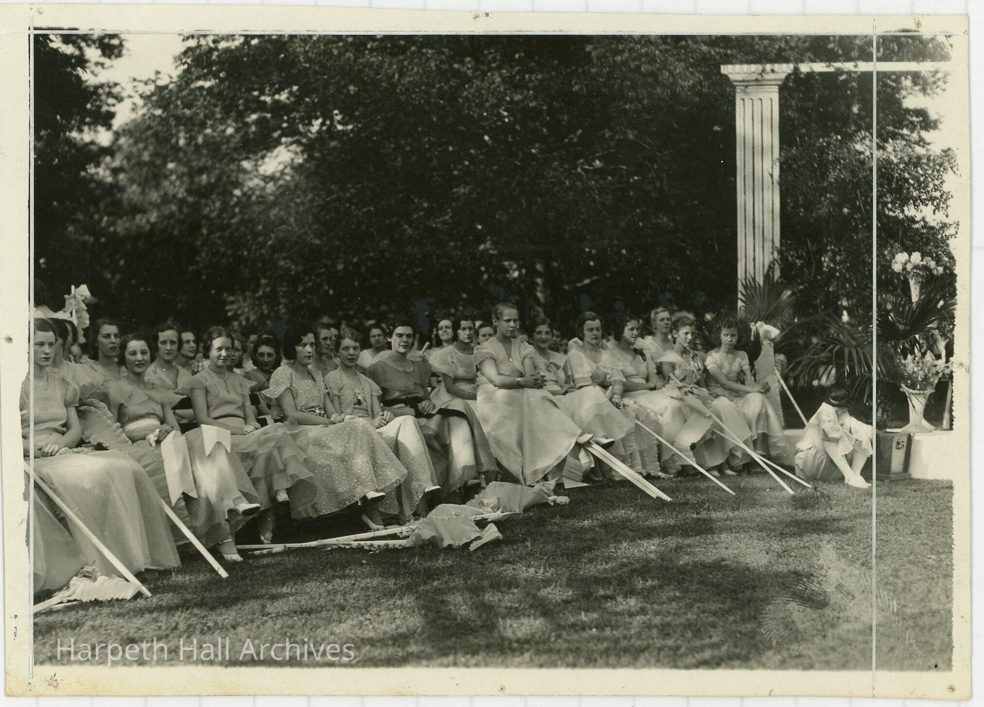 A group of Ward-Belmont ladies are sitting near the May Day Court stage waiting to perform as part of the May Day celebration.