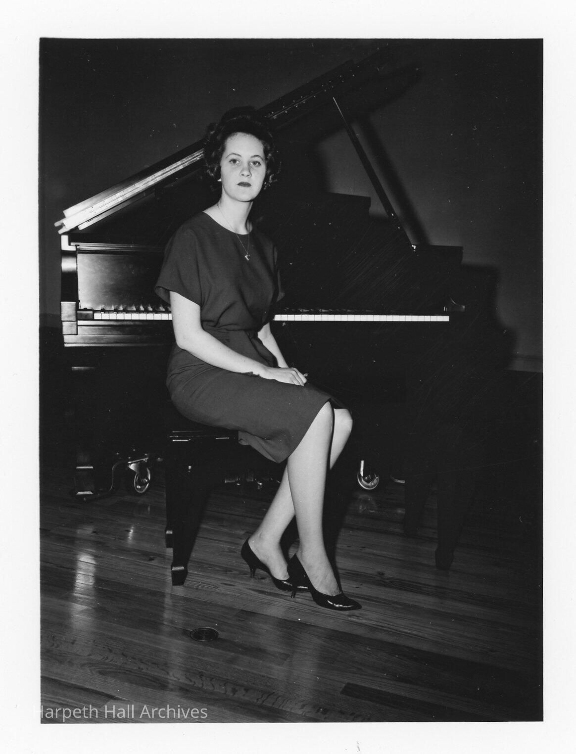 A photograph a young woman sitting on a piano bench next a baby grand piano.