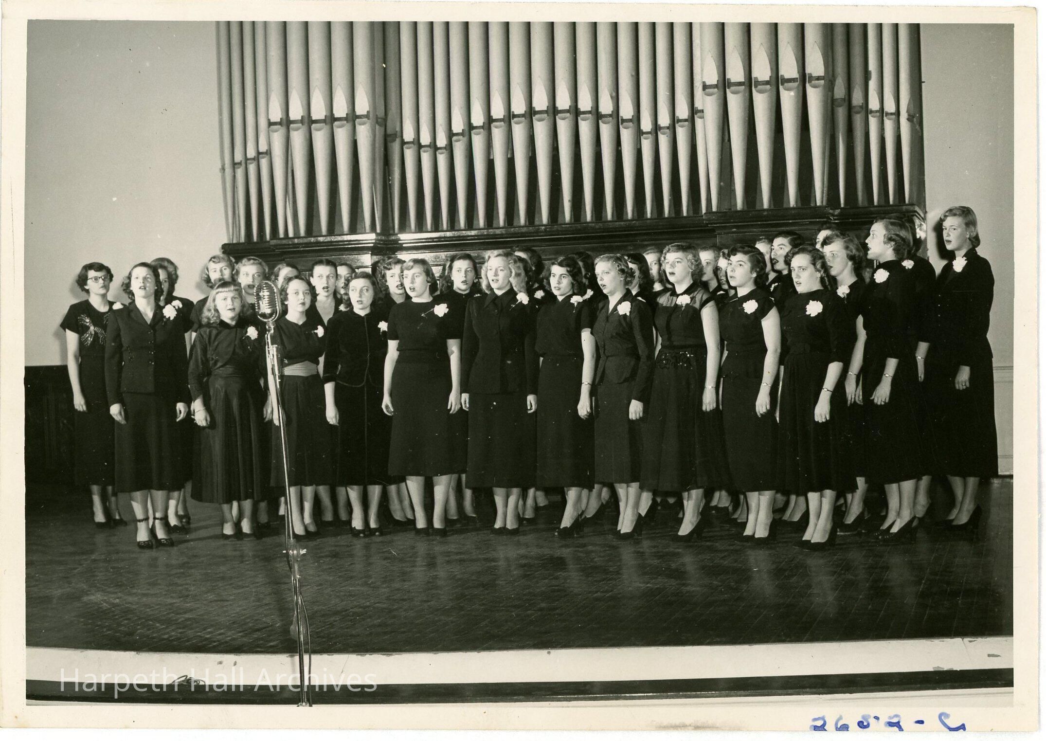 A group of Ward-Belmont women wearing gardenias also singing in front of organ pipes.The group might be the Mu Sigma Phi club.