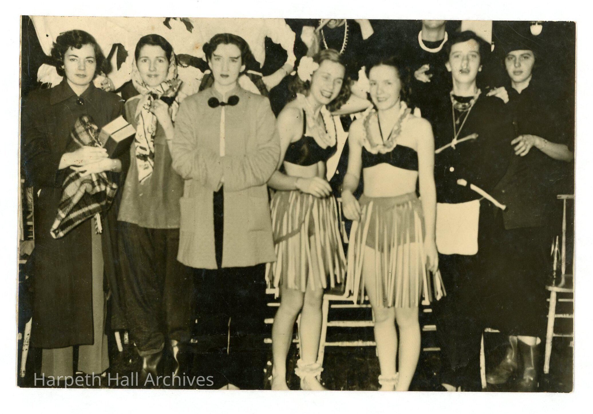 A photograph of a Ward-Belmont ladies dressed in a variety of costumes from hula dancers to a cavewoman to a peasant. This photo might have been taken as part of musical or play.