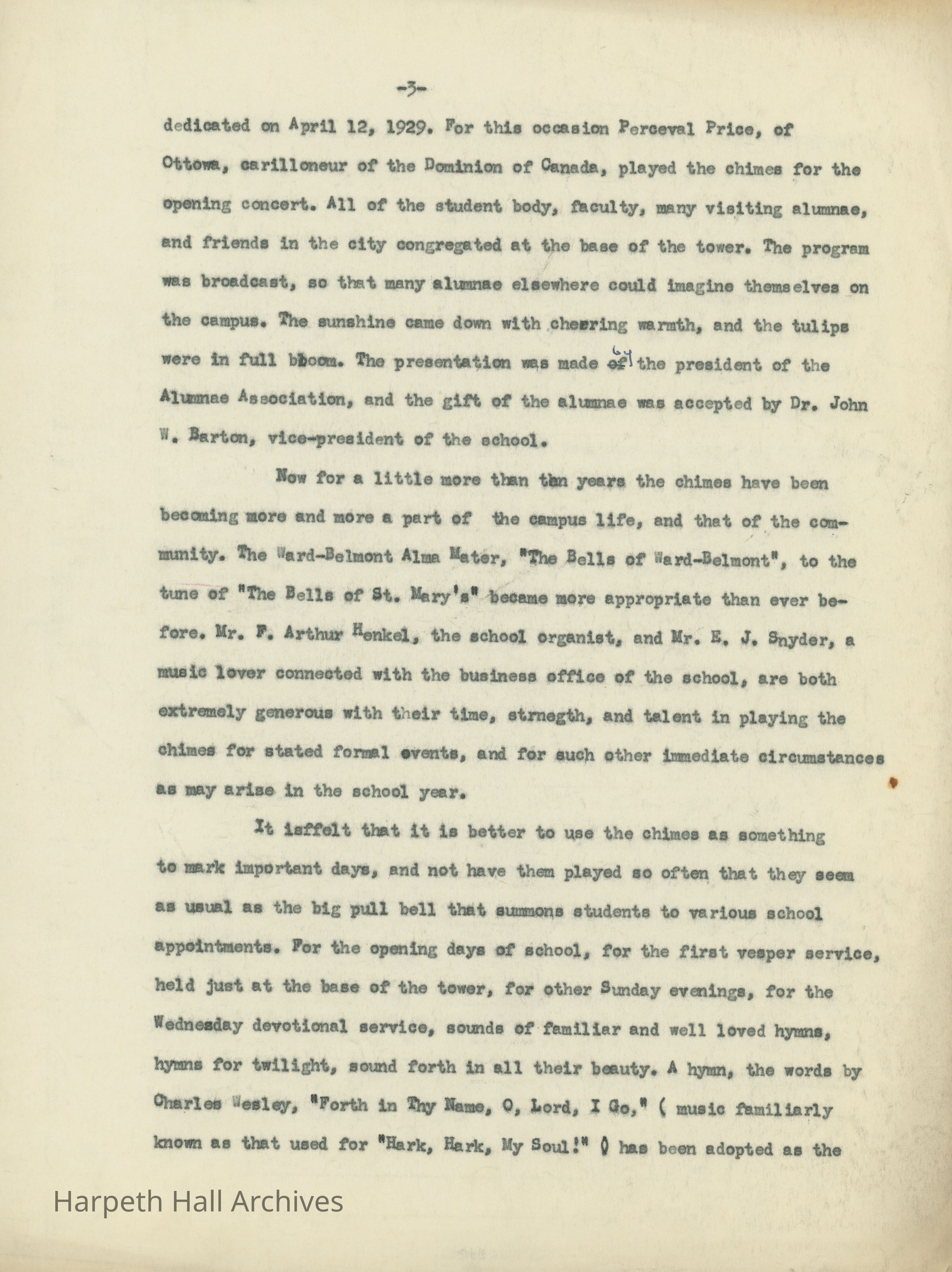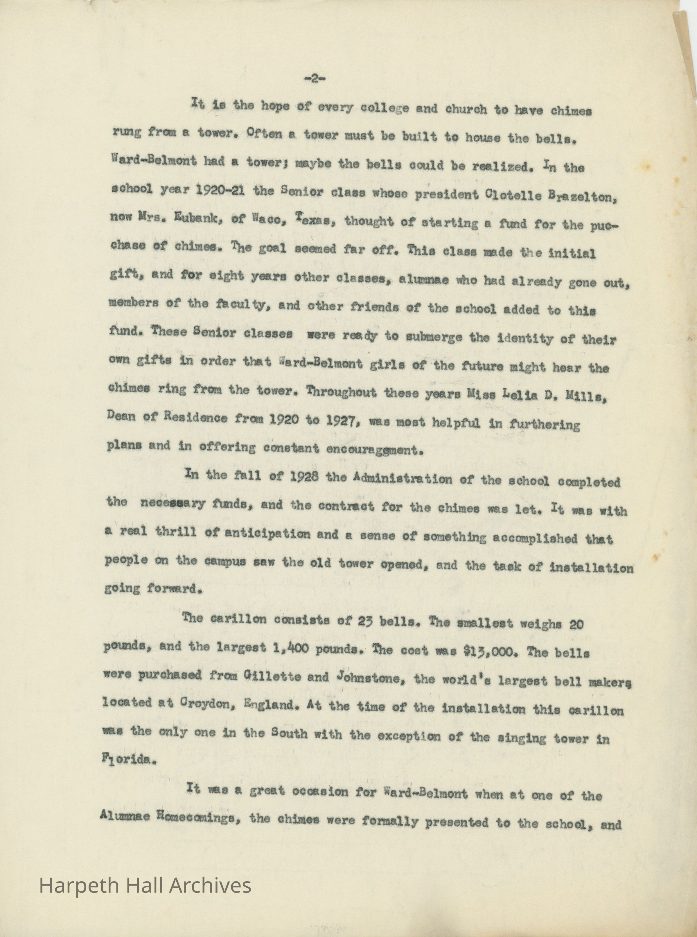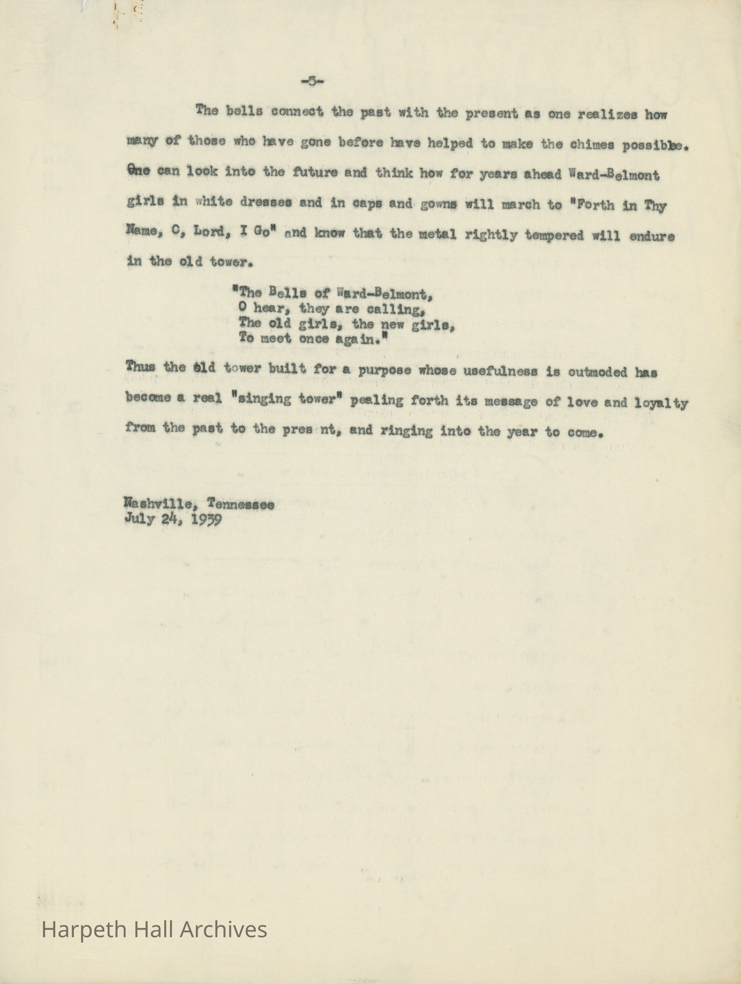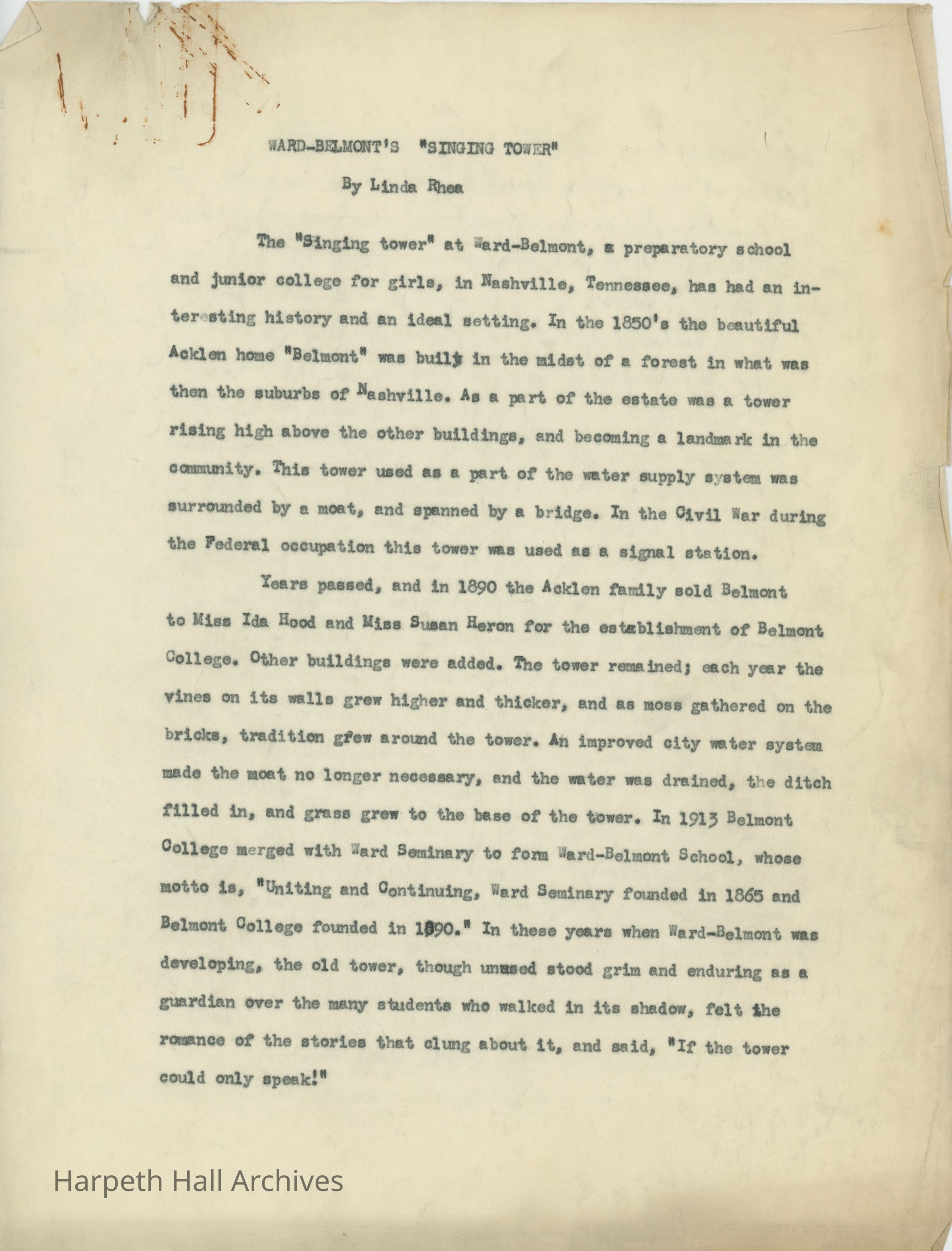 A history of the Ward-Belmont tower and chimes, written by Linda Rhea. Dated July 24, 1939, in Nashville, Tennessee. Rhea was an English teacher at Ward-Belmont, and also served as president of the Ward-Belmont Alumnae Association. She earned her B.S. from Vanderbilt University, M.A. from Columbia University and Vanderbilt University, and Ph.D. from Vanderbilt University. She was also a sponsor of the senior middle class at Ward-Belmont in 1940.