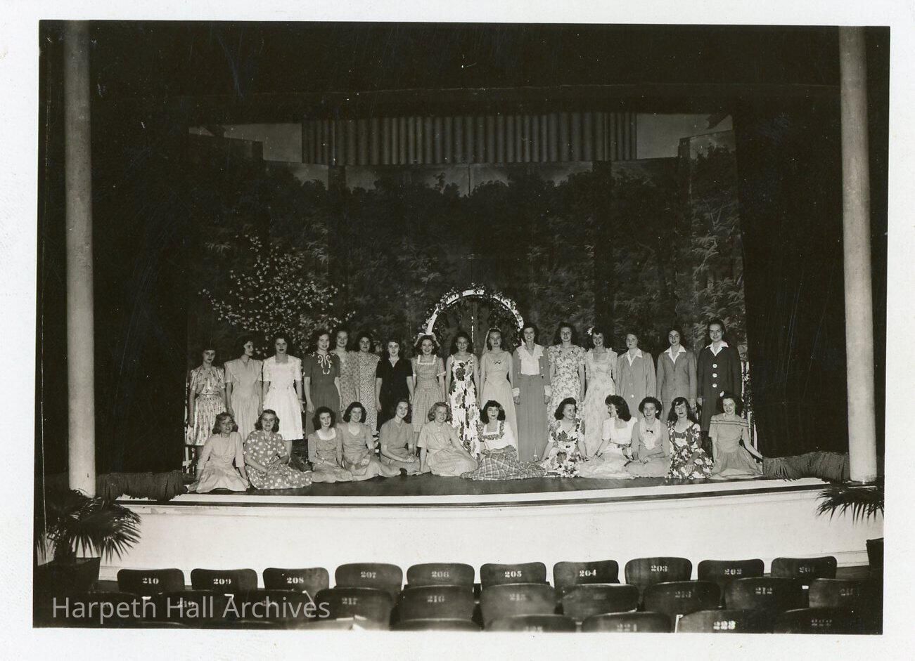 Several Ward-Belmont Students posing in on the theater stage with forest backdrop.