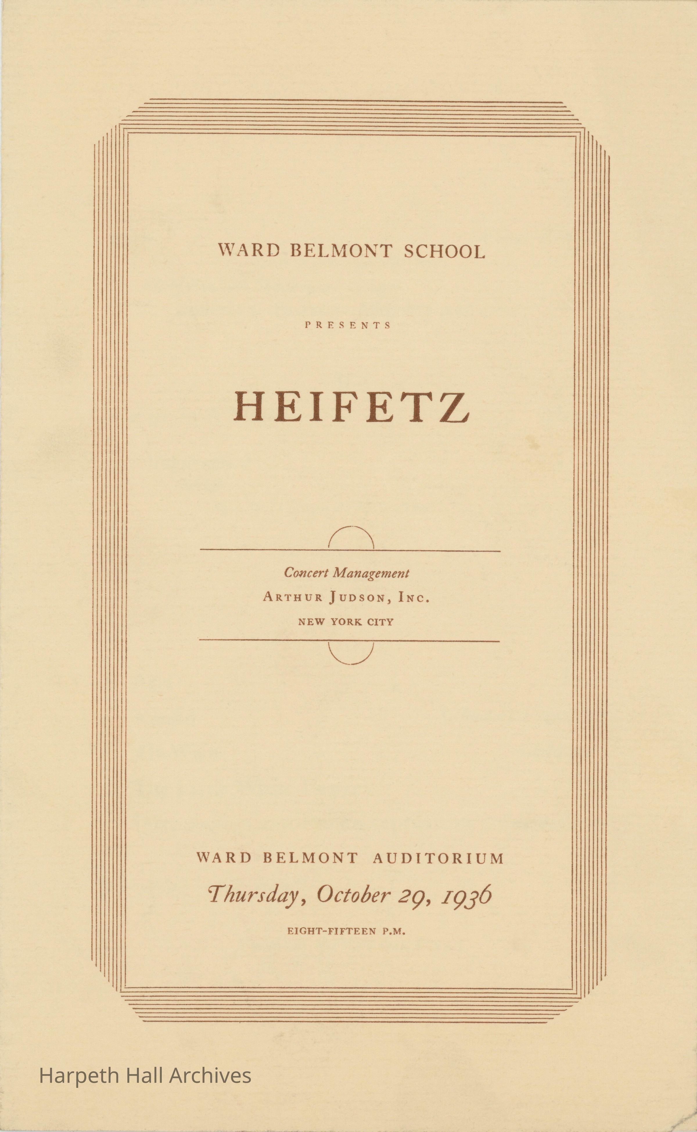 The program for the Heifetz Concert on October 29th, 1936. The concert was presented by the Ward-Belmont Conservatory of Music.Collection