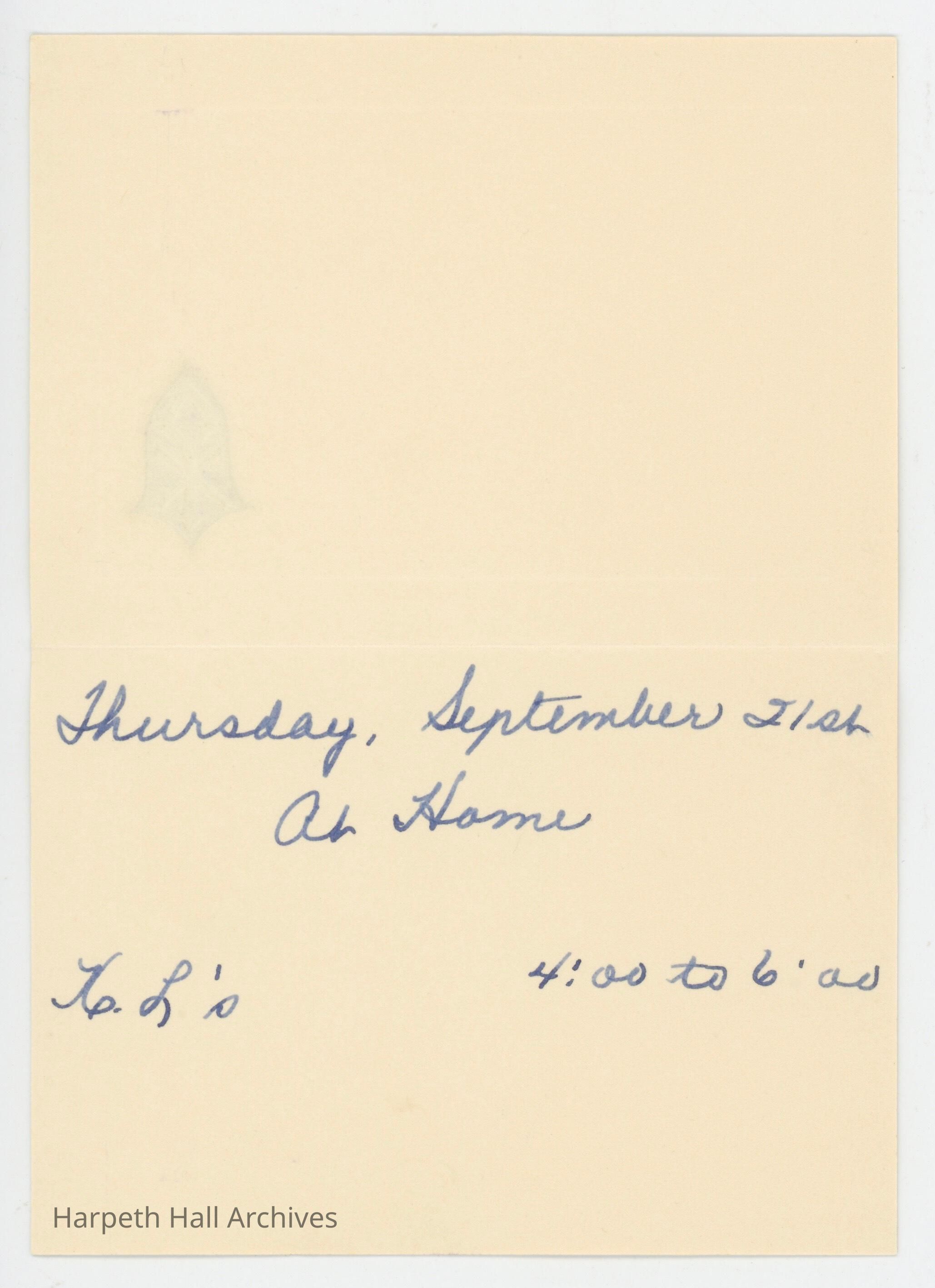 An invitation from X.L. Club addressed to Virginia Richey inviting her to an event at their club house on Thursday, September 21st, from 4 to 6pm. X.L. was a club at Ward-Belmont.Collection