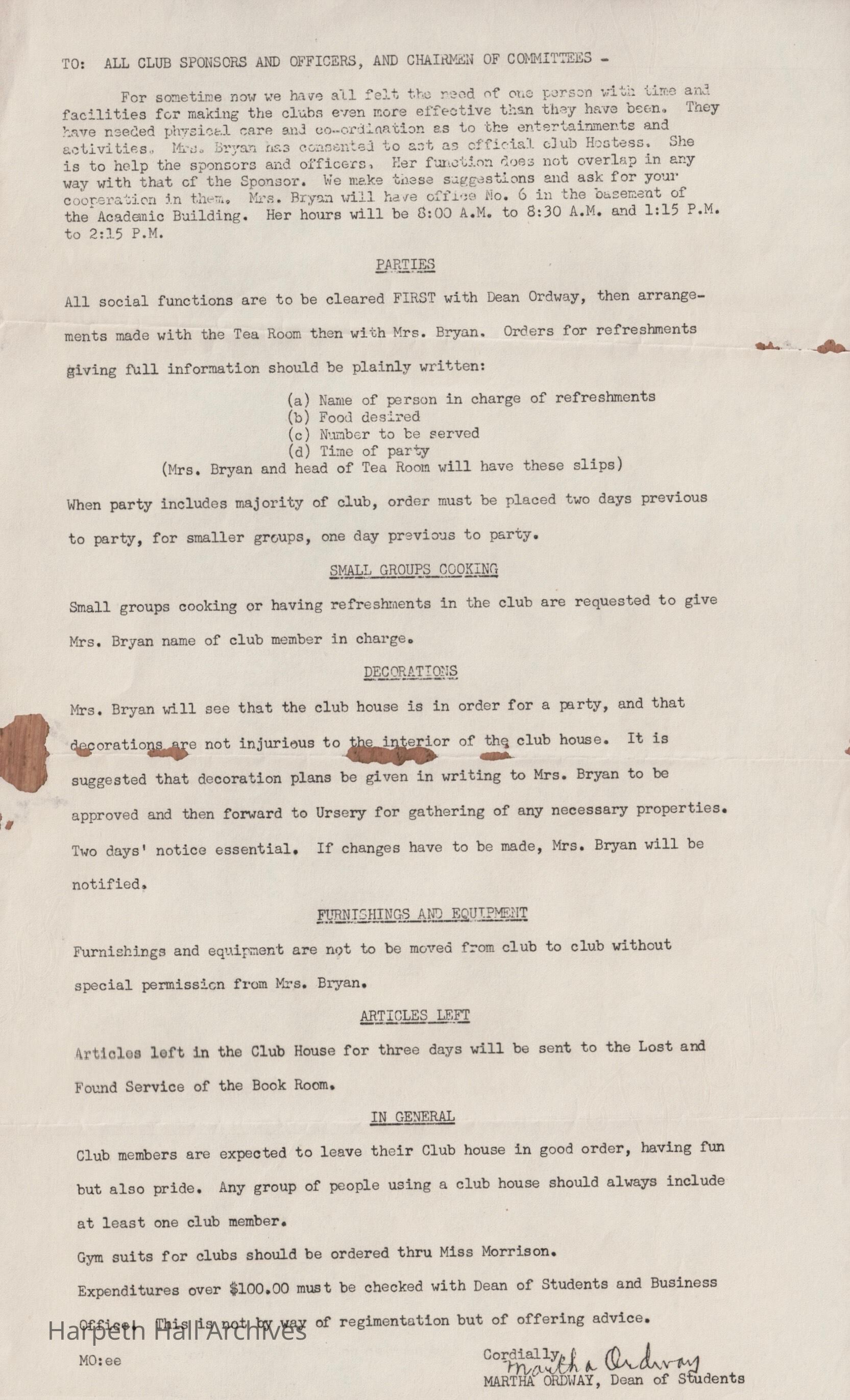 A memo sent to the club sponsors and officers by Dean Ordway. The memo discusses club party details.Collection