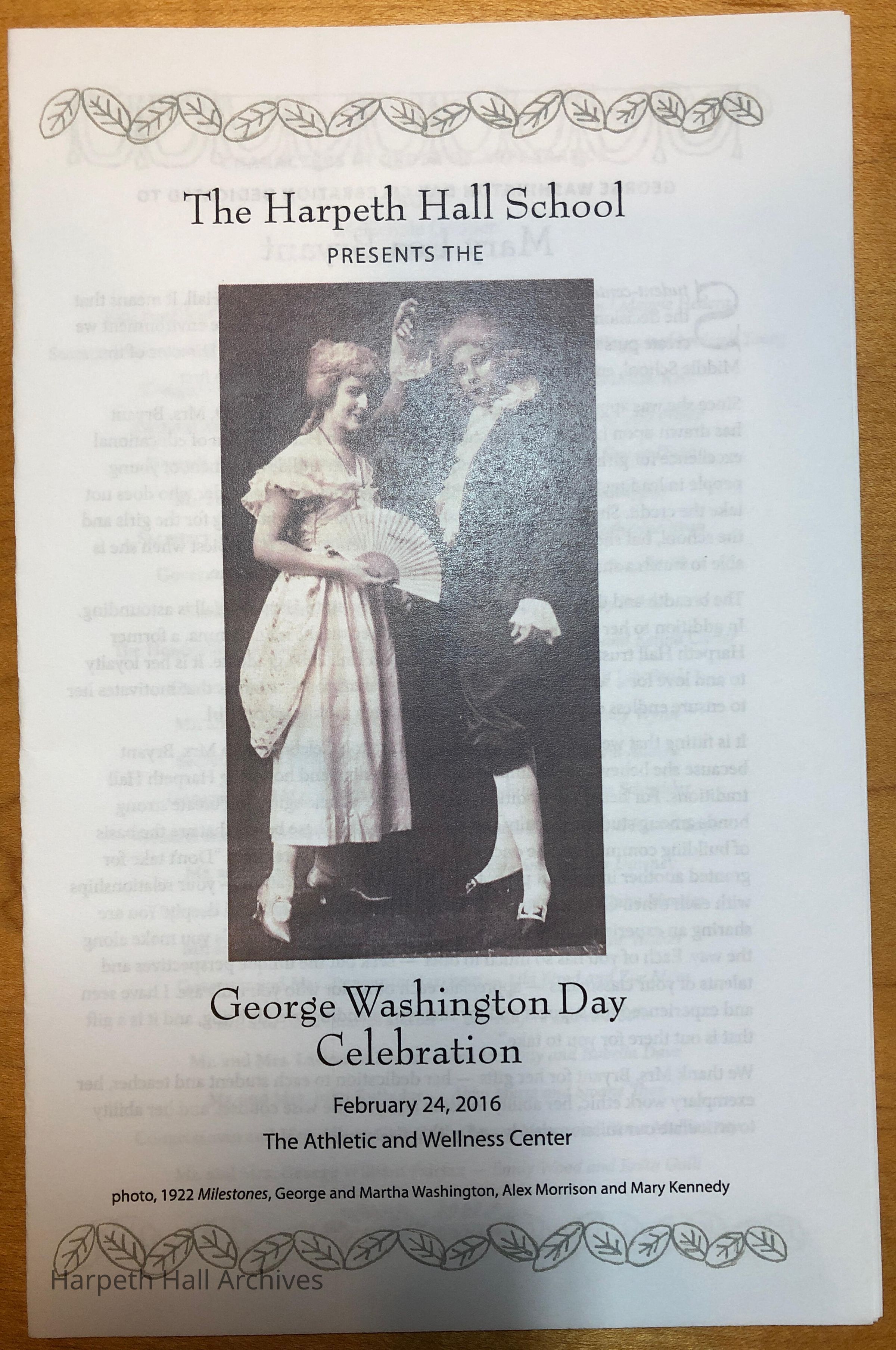 The 2016 program for the George Washington Day Celebration put on by the class of 2021 when they were in the seventh grade. The celebration was dedicated to Mary Lea Bryant. George Washington was played by eighth grader Molly Myers (2020) and Martha Washington was played by eighth grader Ellen "Ellie" Ford (2020).Context