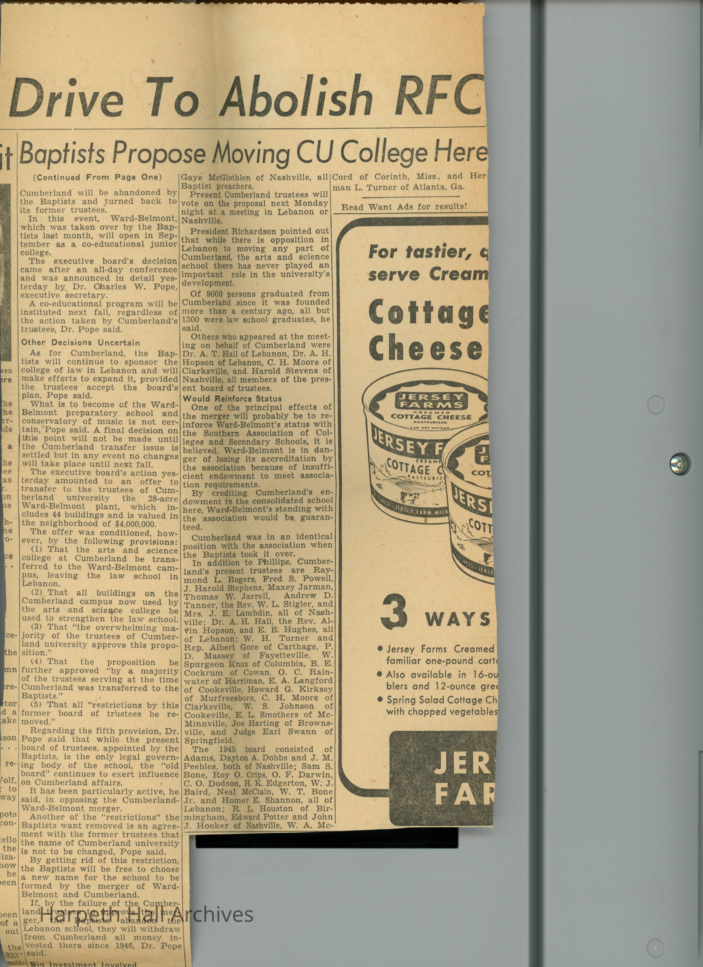 Newspaper clipping: Baptists Propose Moving CU College Here
