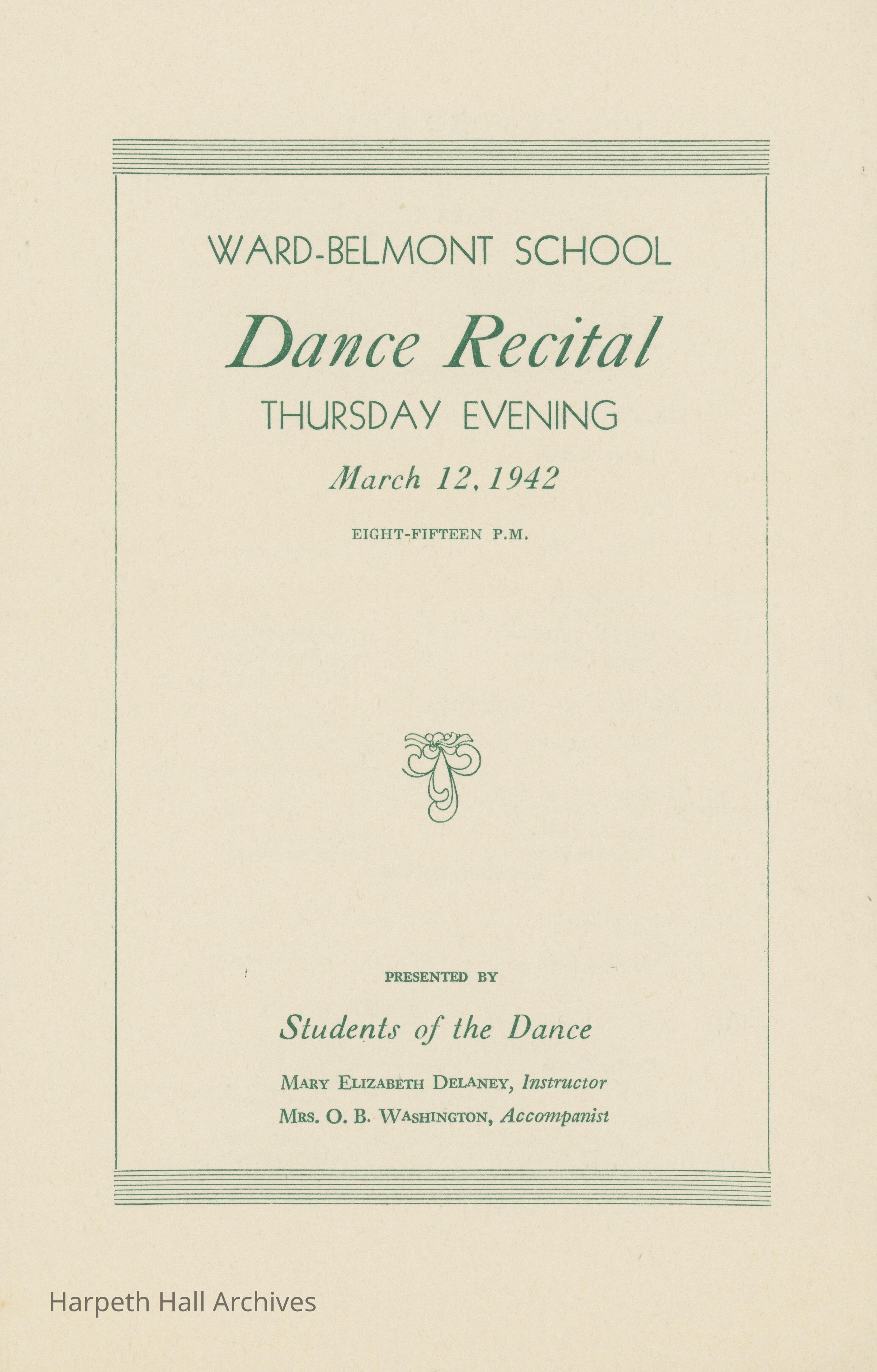 A program for a Ward-Belmont school dance recital held on Thursday evening, March 12, 1942, at 8:15. Presented by Students of the Dance with Mary Elizabeth Delaney as instructor and Mrs. O. B. Washington as accompanist. The recital consisted of two parts, with ten dances in Part I and six dances in Part II, separated by a five minute intermission. The names of performers are listed in the program alongside their respective dance numbers.Context