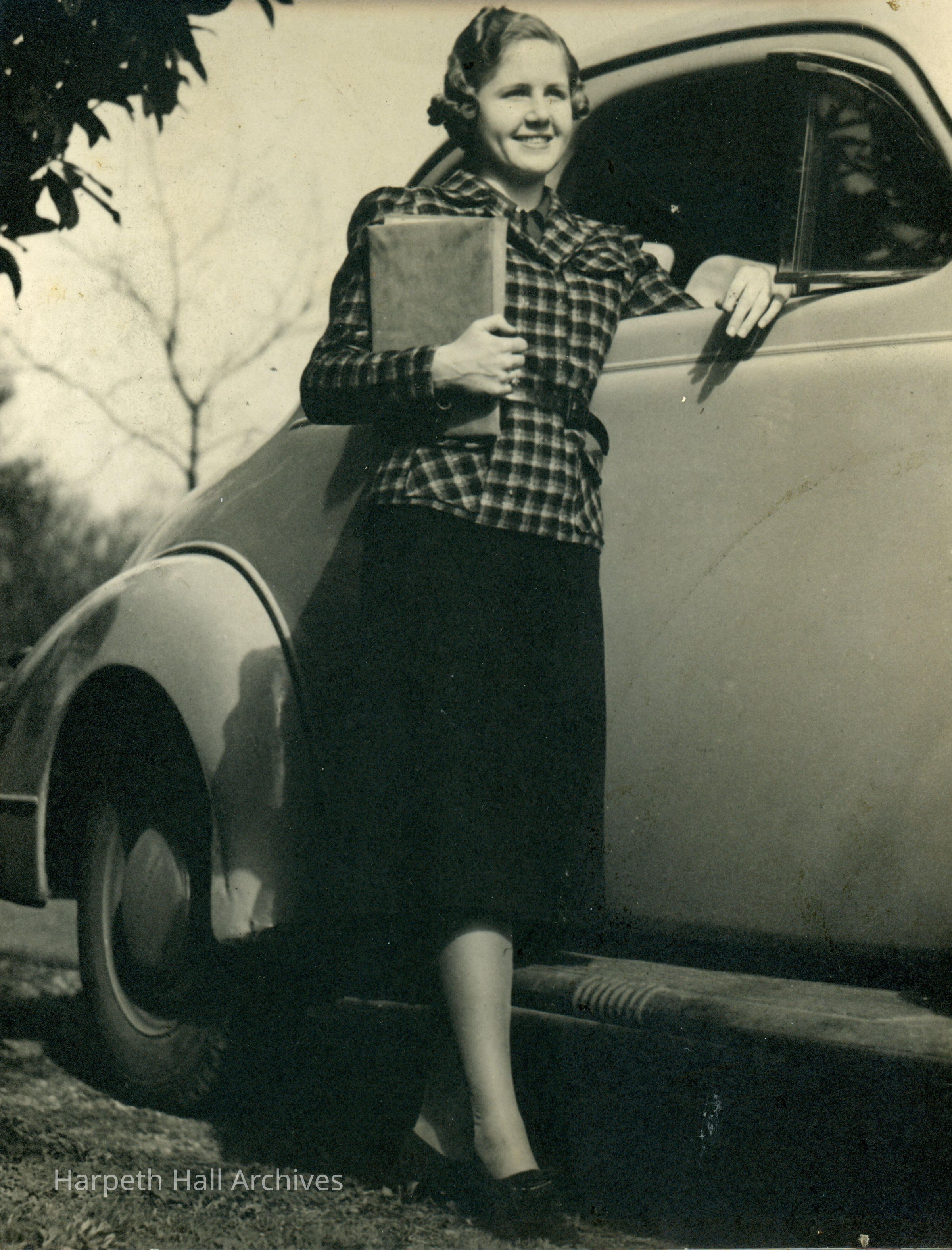 An unknown Ward-Belmont student standing next to an automobile of that period