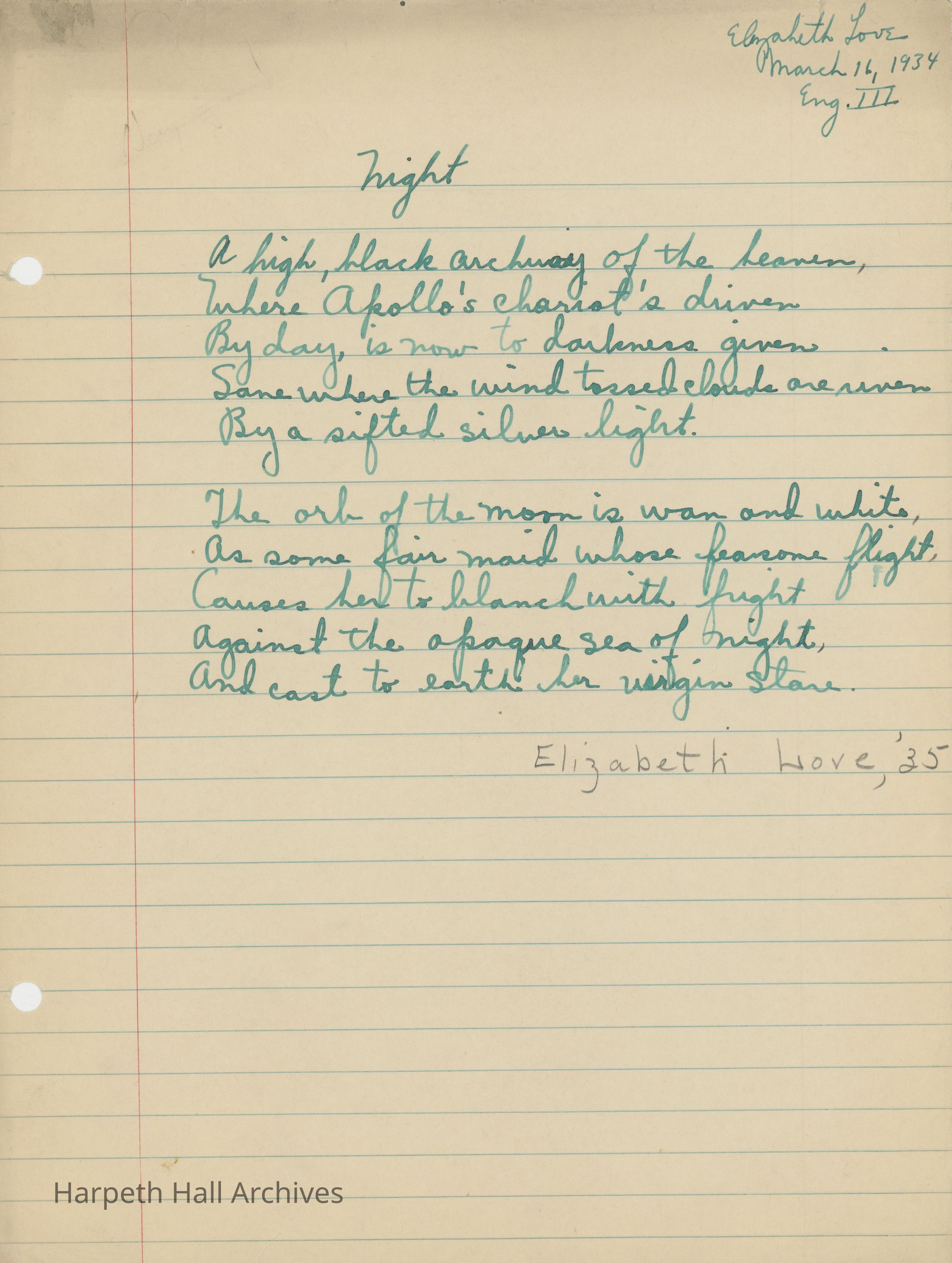 A poem entitled, "Night" written by Ward-Belmont student Elizabeth Love (1935) on March 16th, 1934.Collection