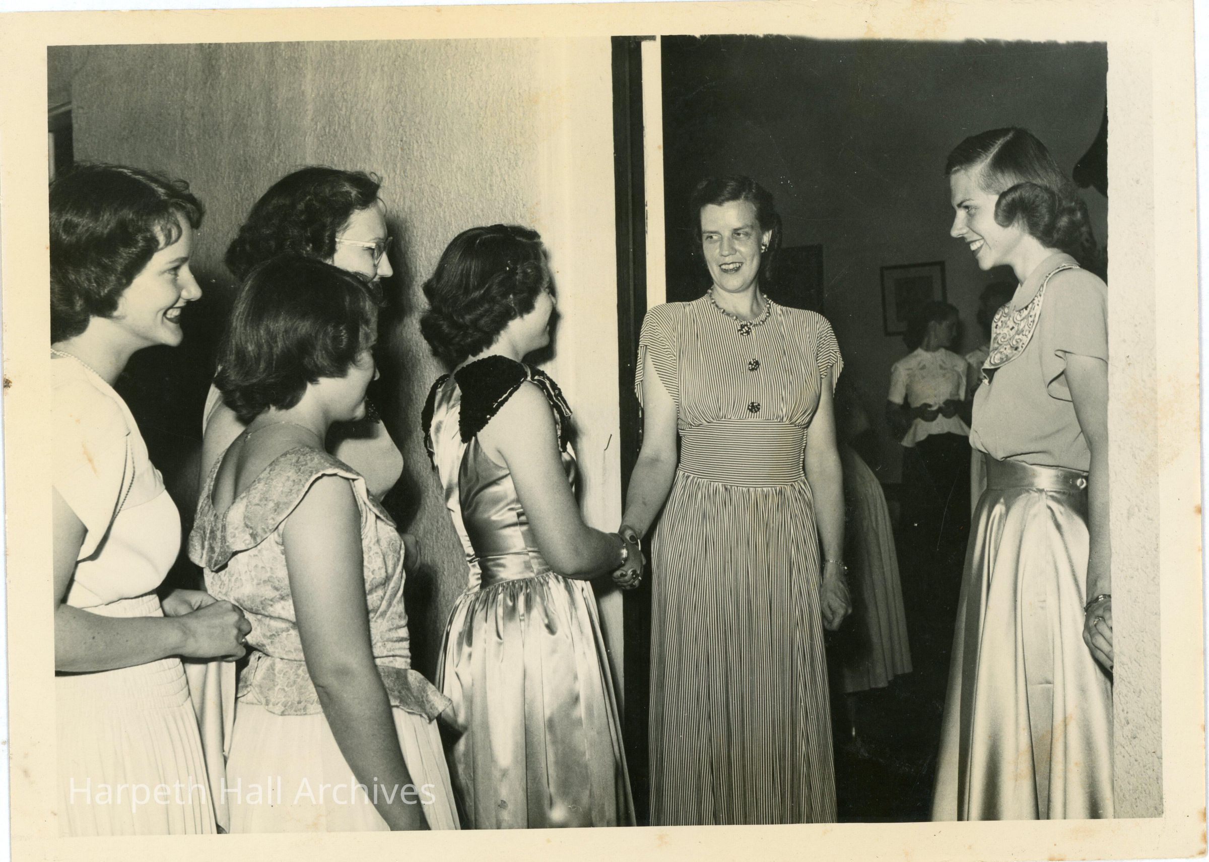 The photo shows the young women being greeted at the door of a Ward-Belmont social function.
