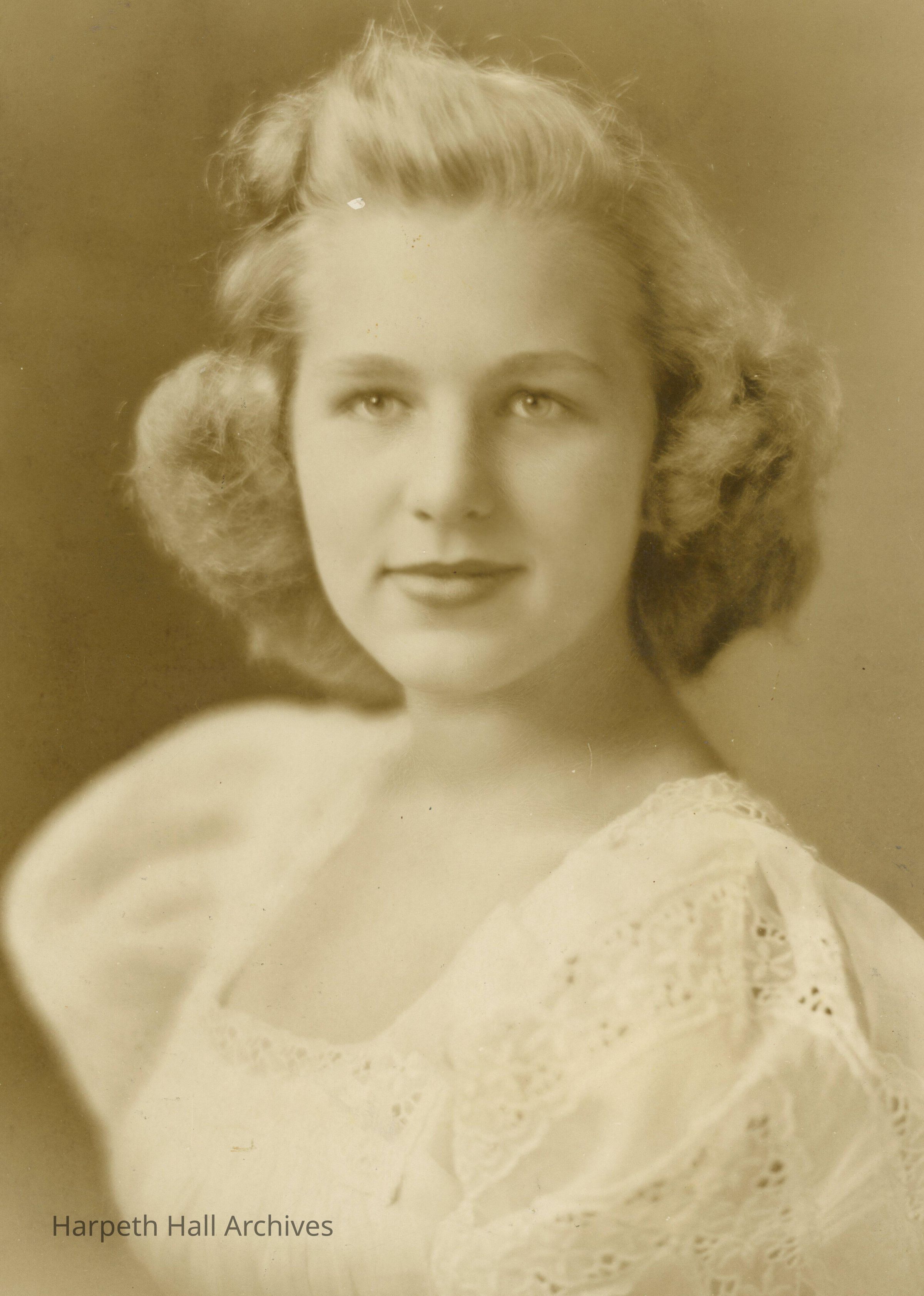 A portrait of a blonde Ward-Belmont student wearing a white, eyelet dress is shown. The student is possibly Mary "Cocky" Cochran Grimes (1941).