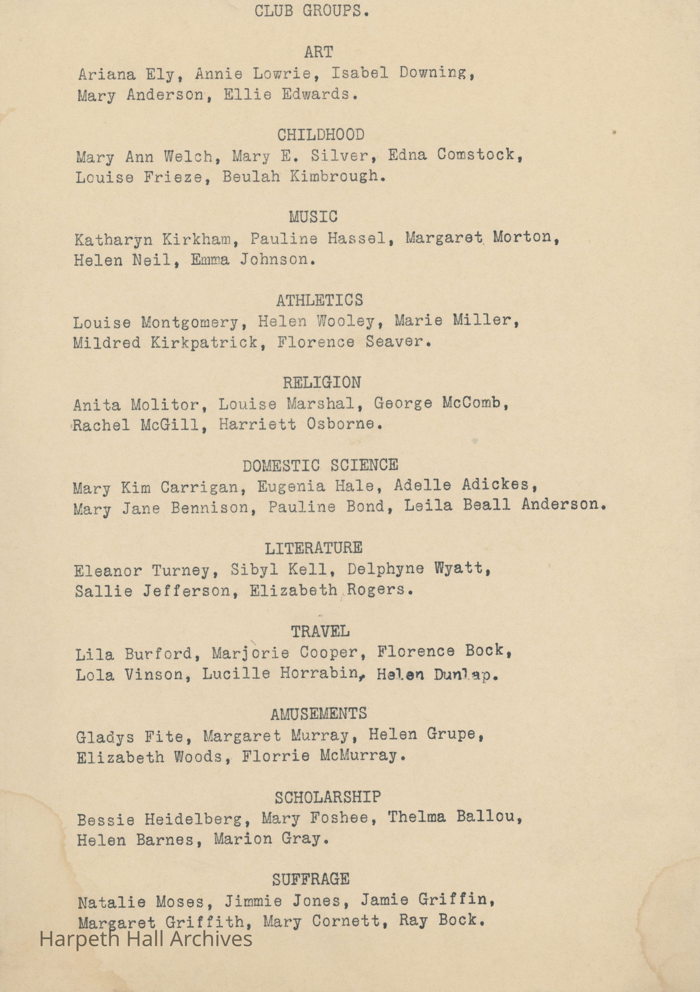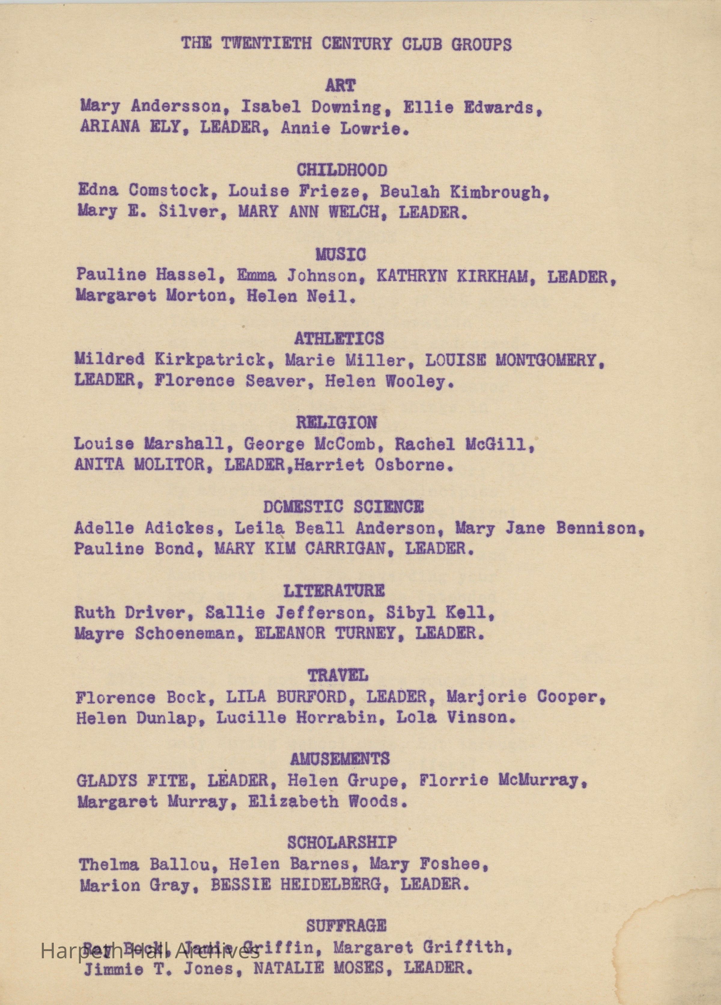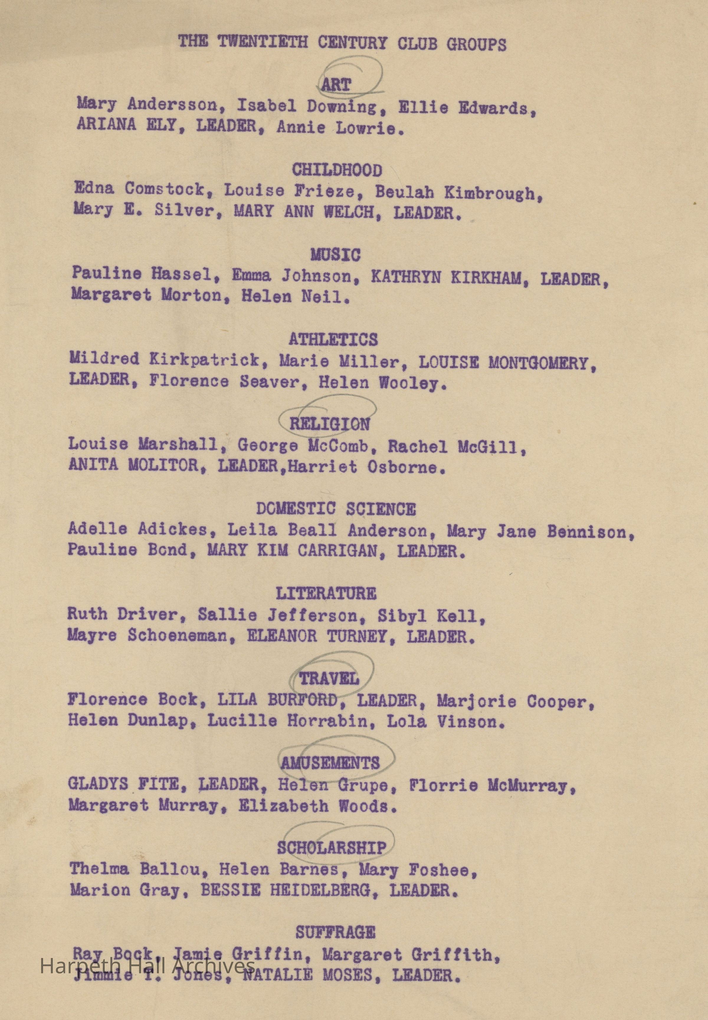 A list of the Twentieth Century Club groups and associated members. In addition to the standard ten club groups - art, music, childhood, athletics, domestic science, literature, amusements, religion, scholarship, and travel - this list also includes the category of suffrage, which was added sometime after 1916-1917.Context