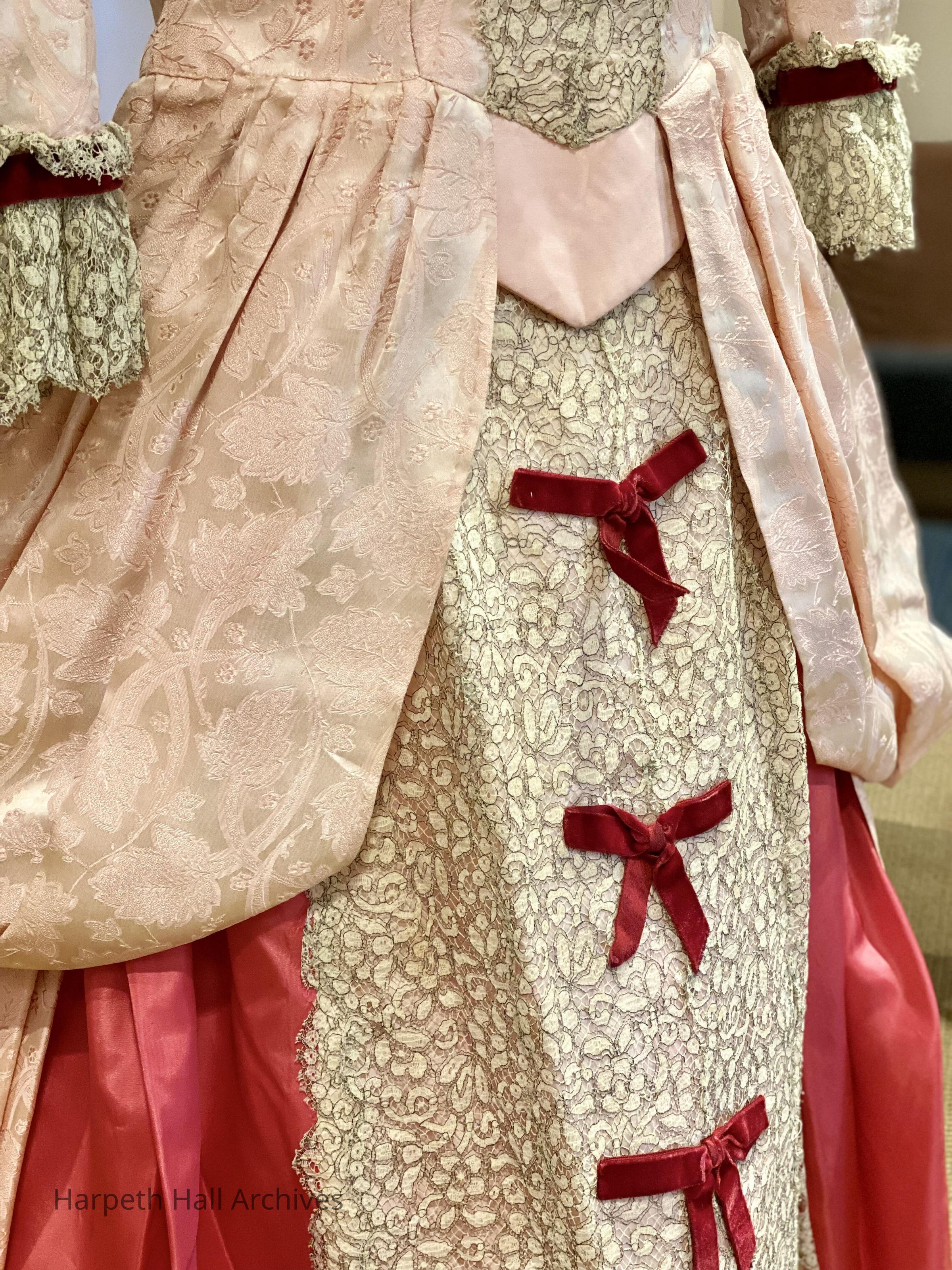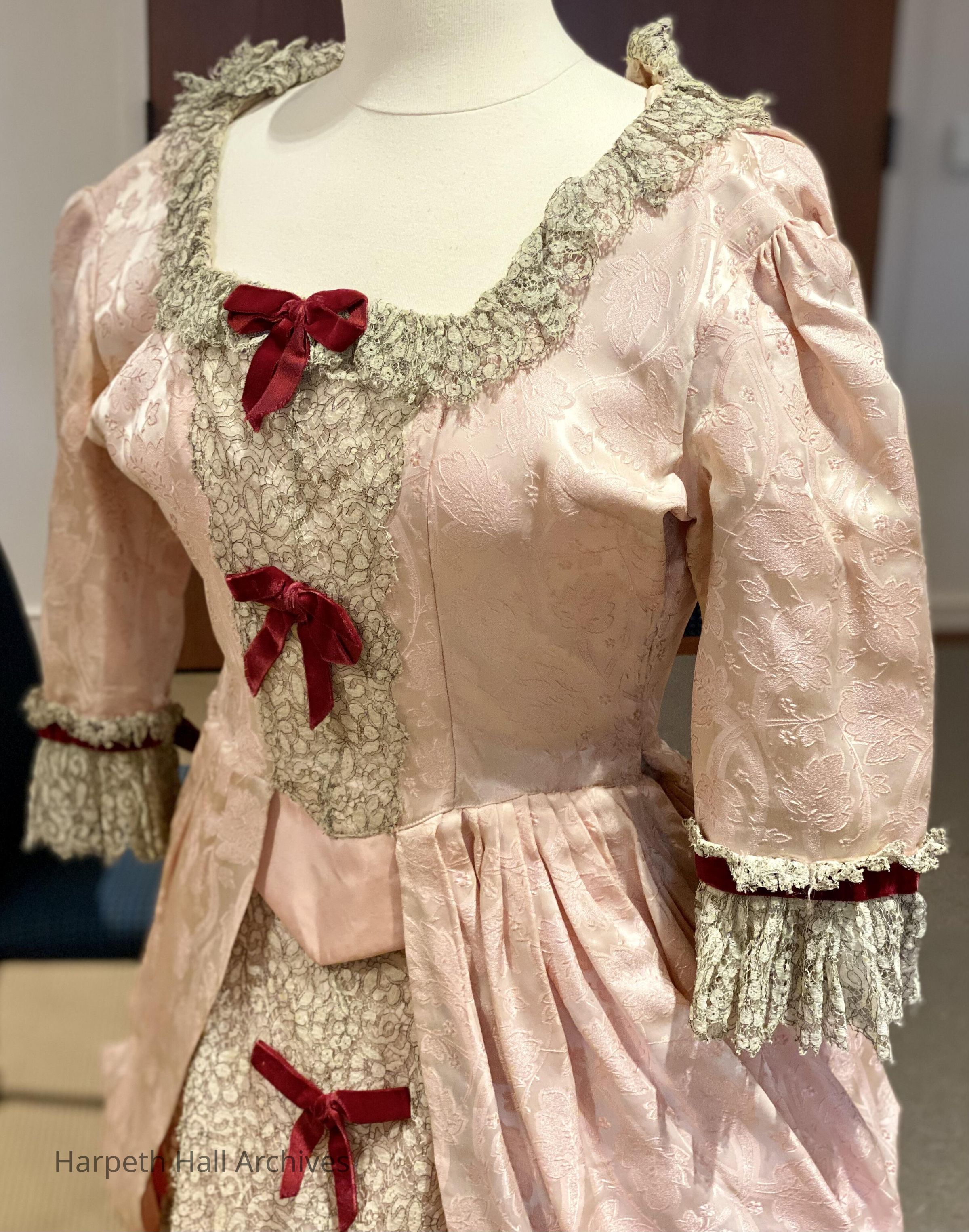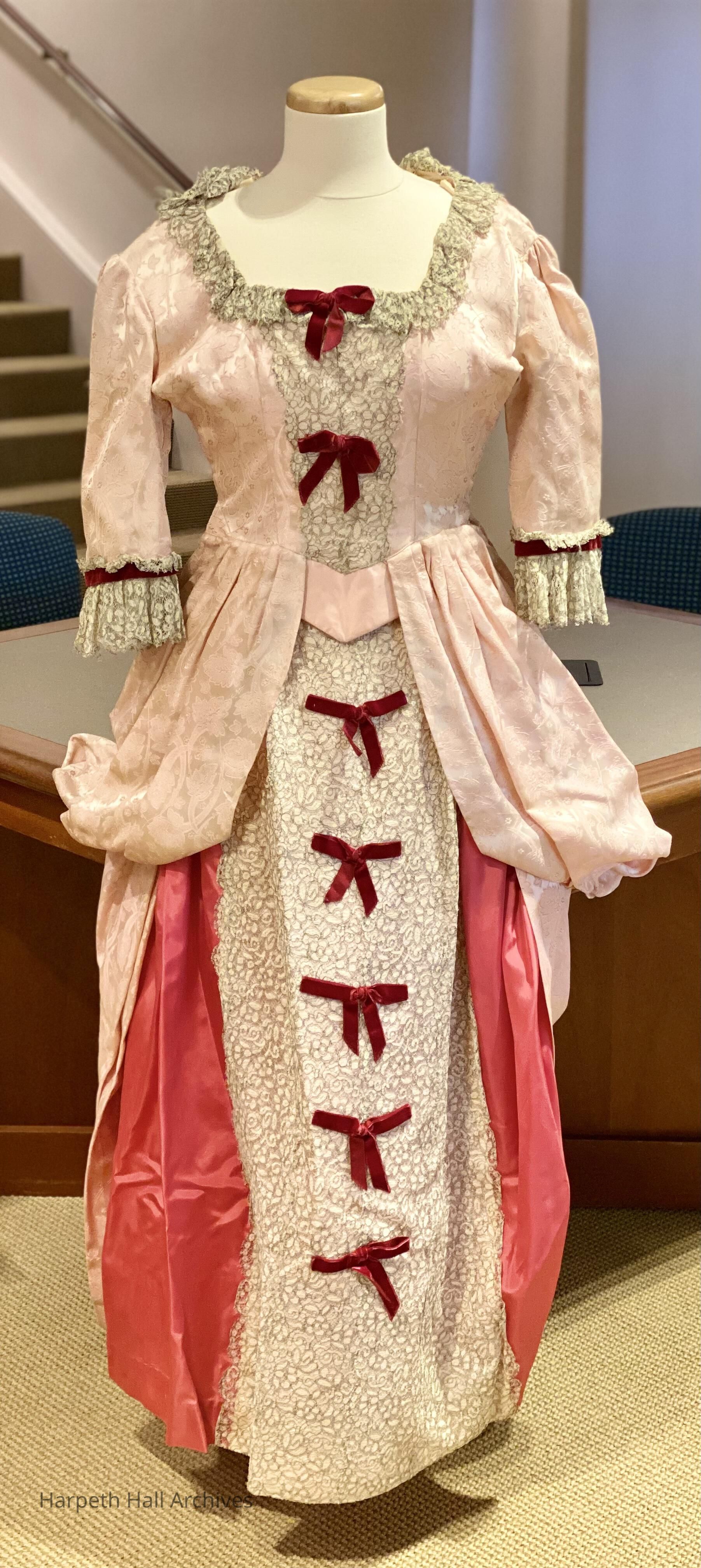 A costume dress worn by a student playing the role of a lady in the George Washington Day Celebration. Students played either a solider, a sailor, or a lady or gentleman. Ladies and gentlemen performed a minuet.Context
