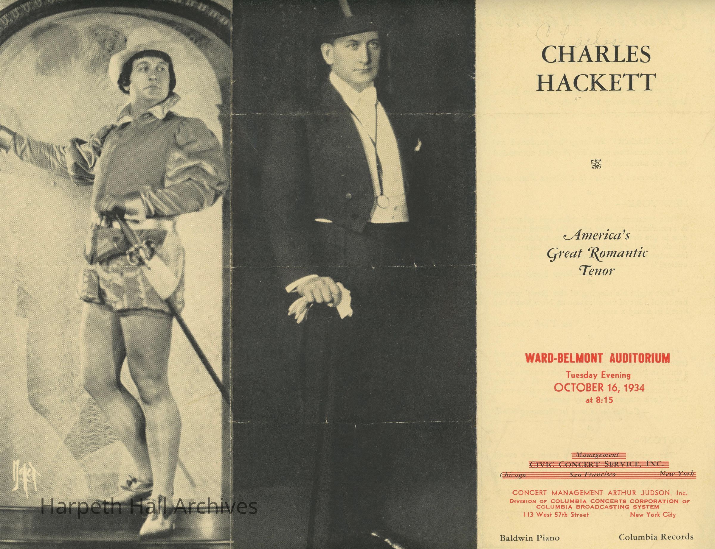 A pamphlet for the Charles Hackett performance in Ward-Belmont's auditorium on October 16th, 1934.Collection