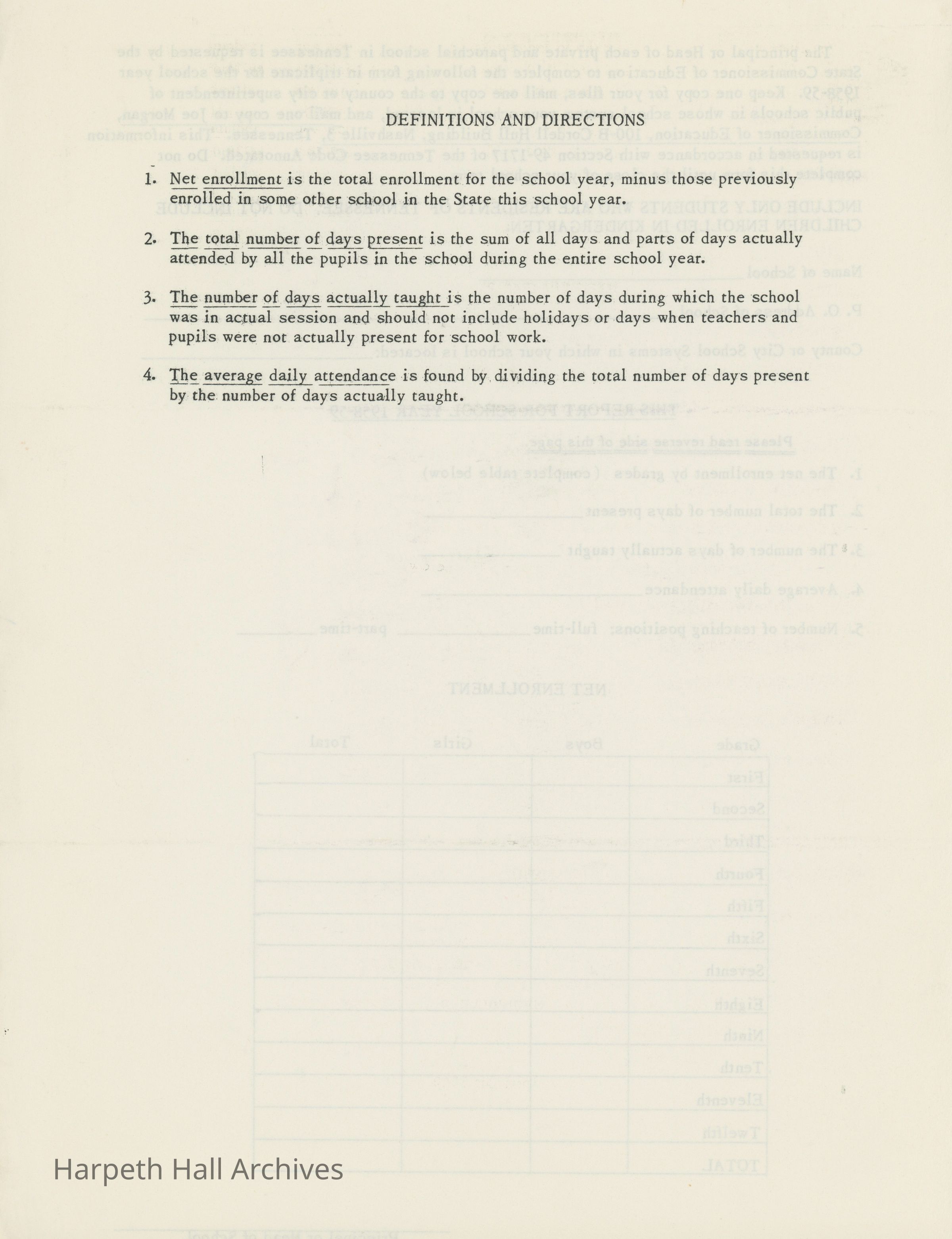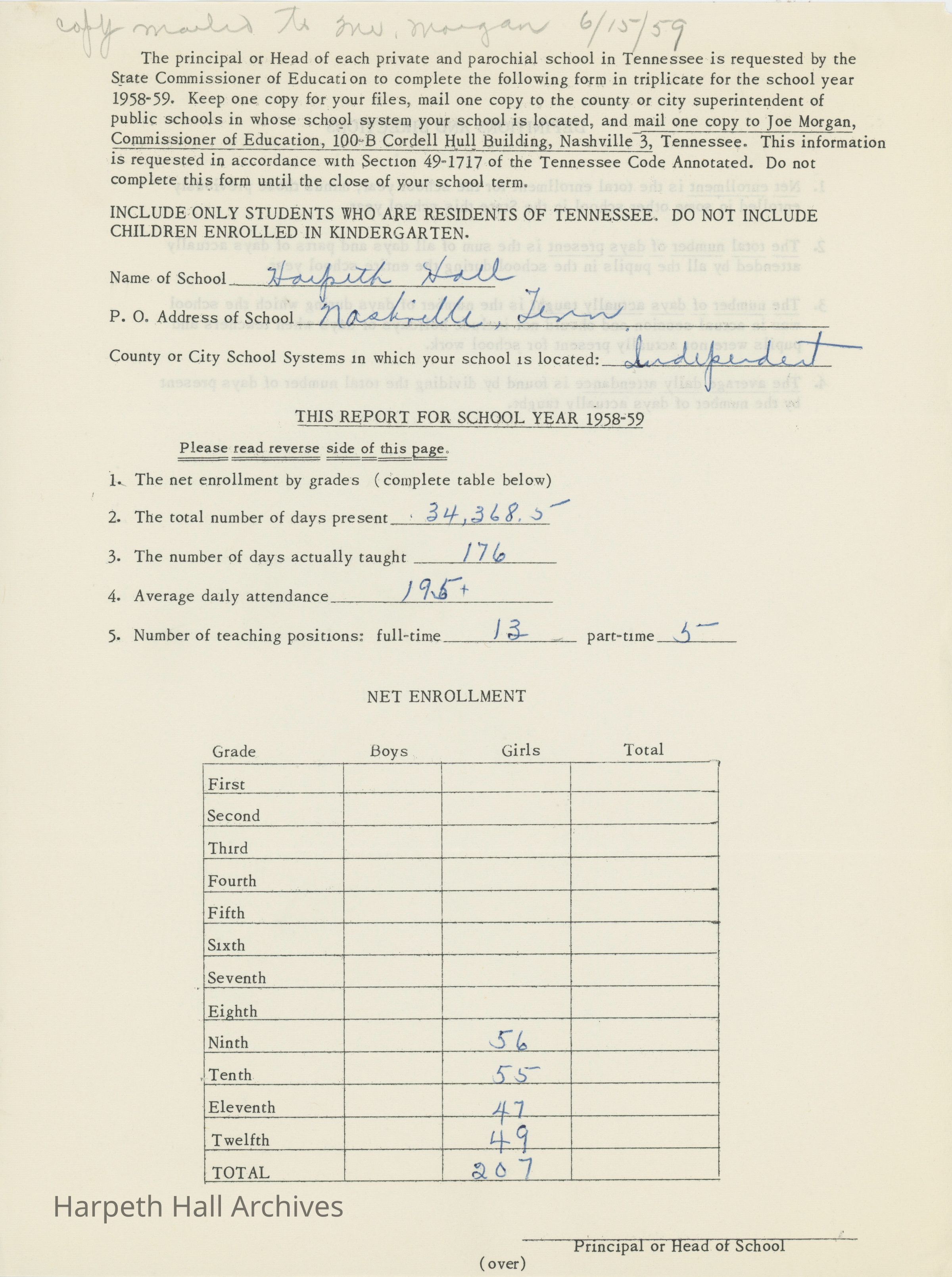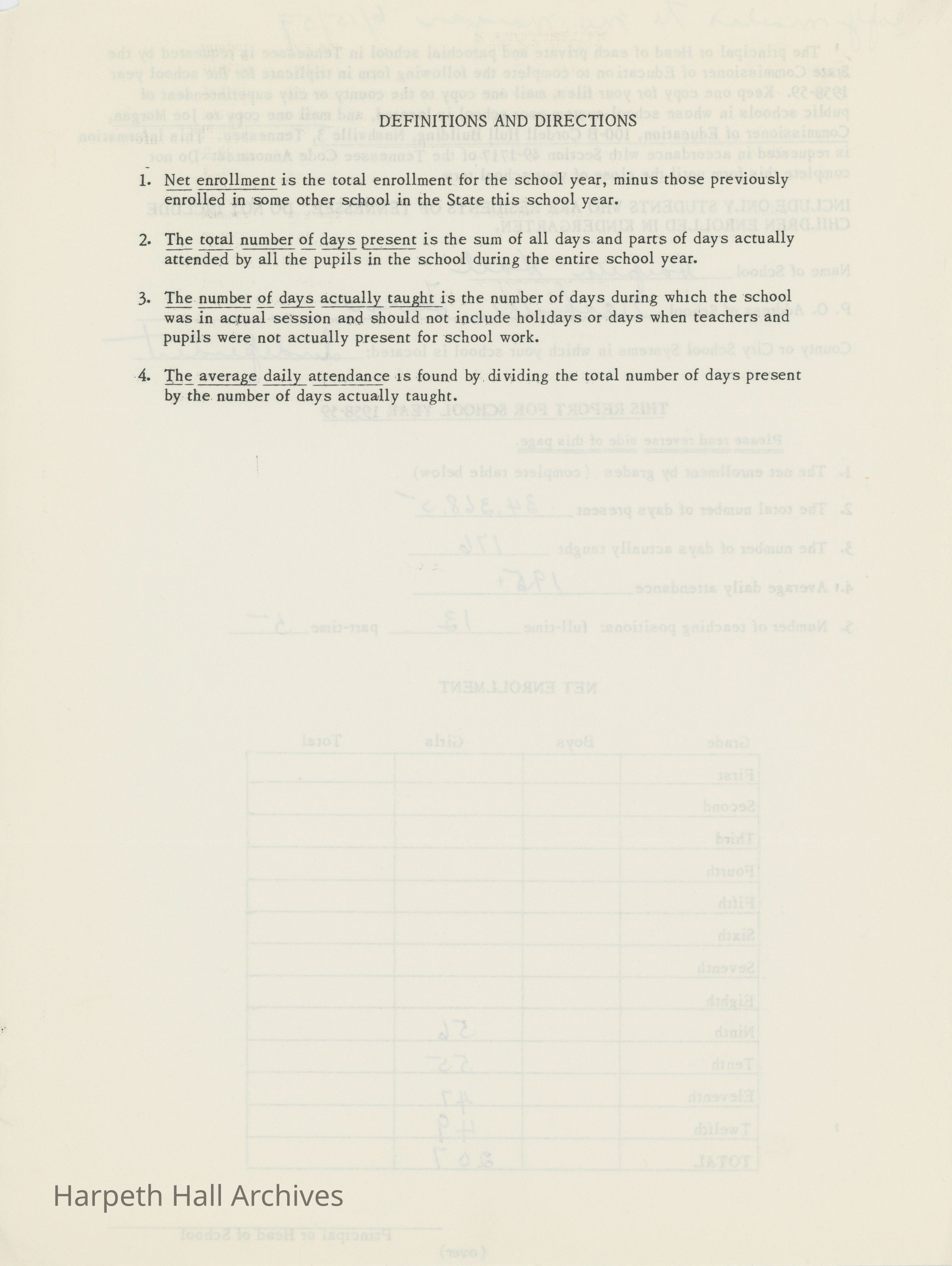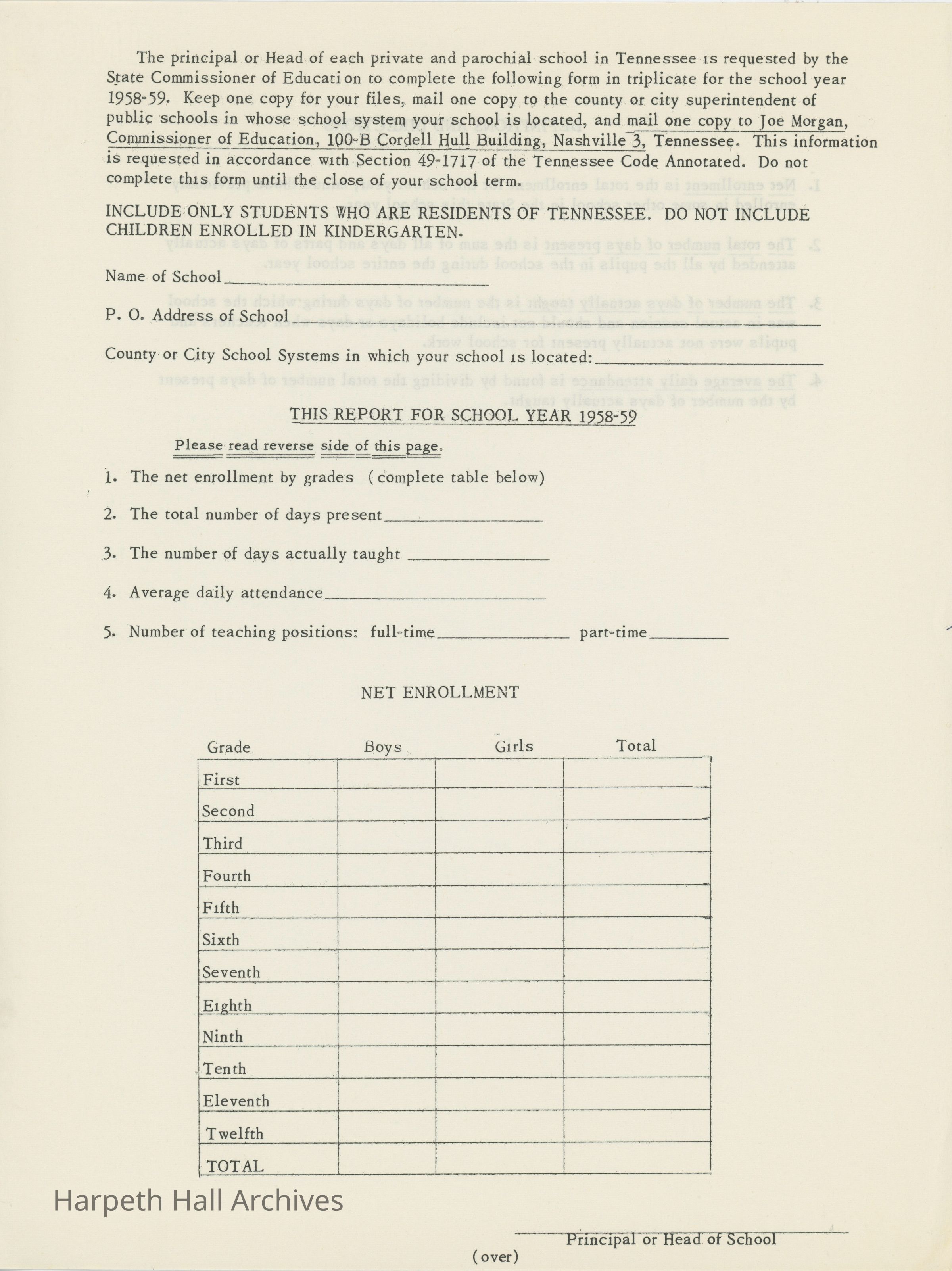 Information on Harpeth Hall's attendance, students, teaching position, and days of instruction. A blank copy is also included.Collection