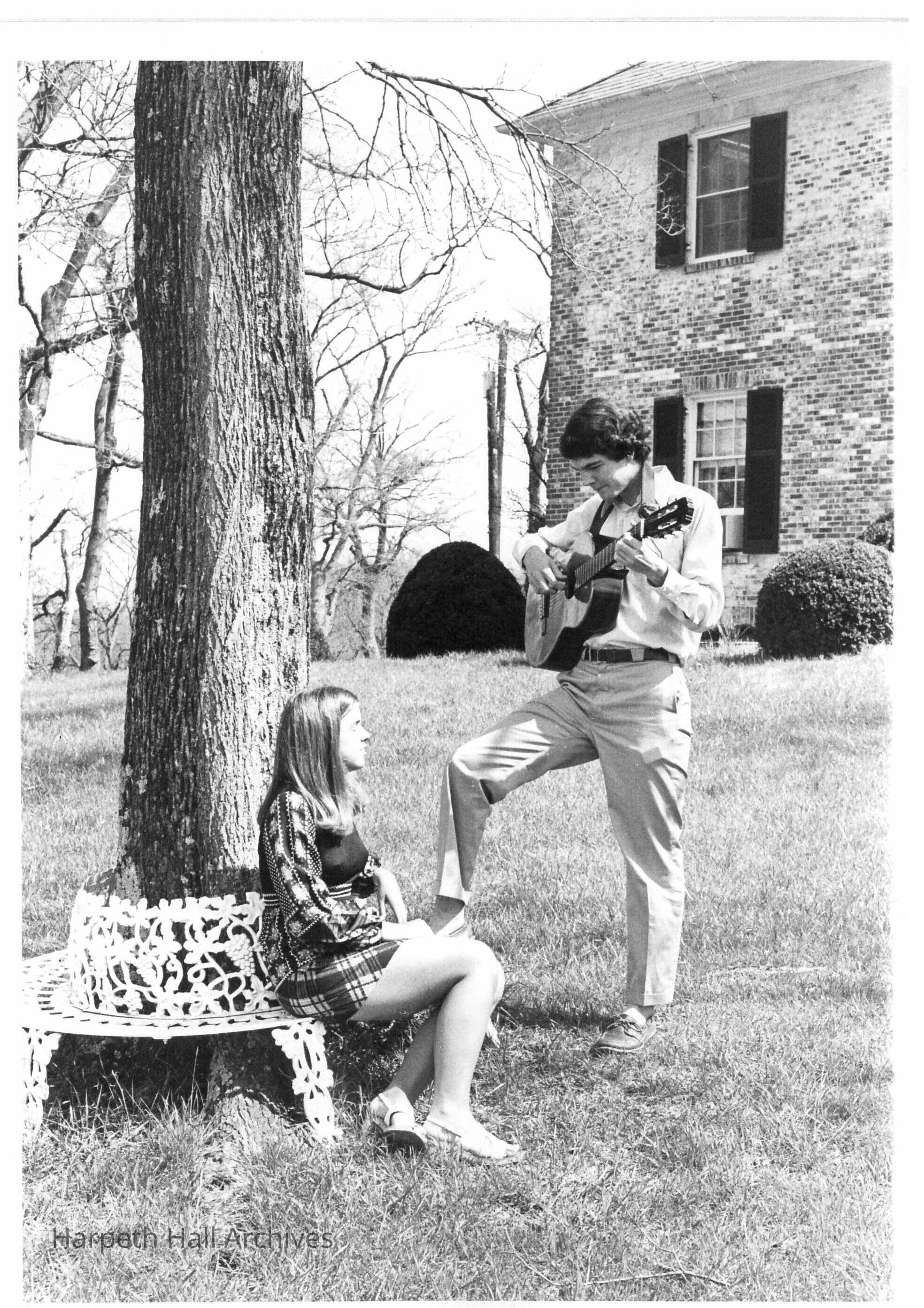 Alice Hinton in front of Souby Hall (unknown guitar player)