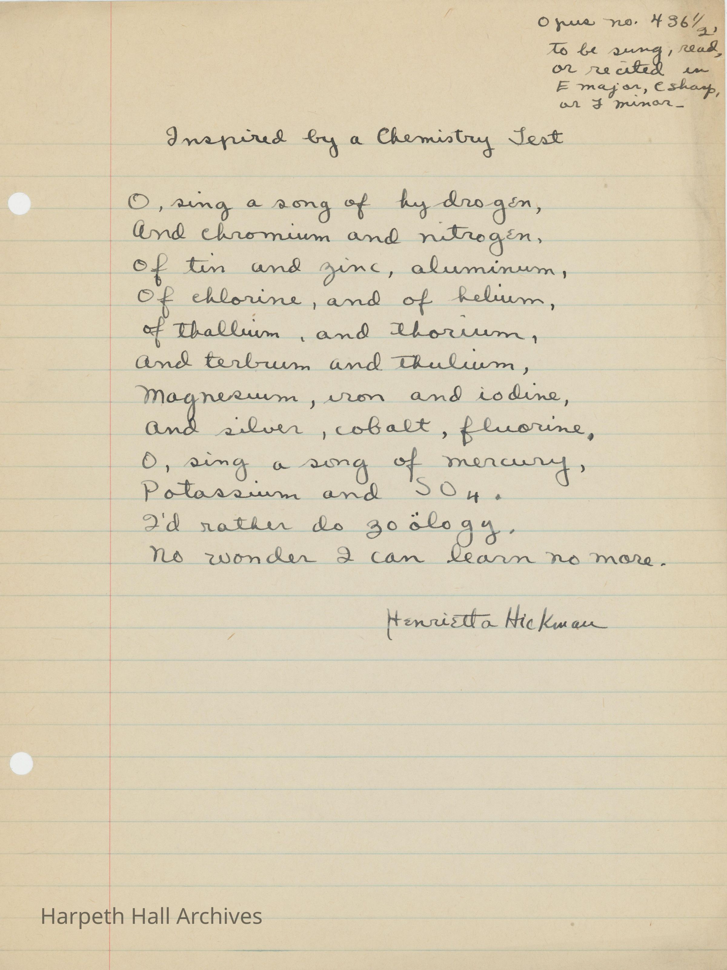A poem entitled, "Inspired by a Chemistry Test" written by Ward-Belmont student Henrietta Hickman.Collection
