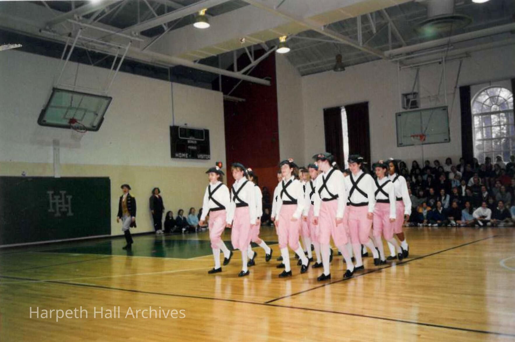 A group of seventh grade students performing as soldiers in the George Washington Day Celebration. The photo is taken in Morrison Gym in the McMurry Center.Context