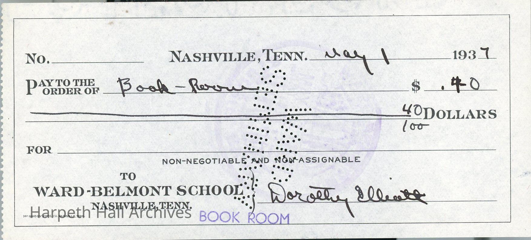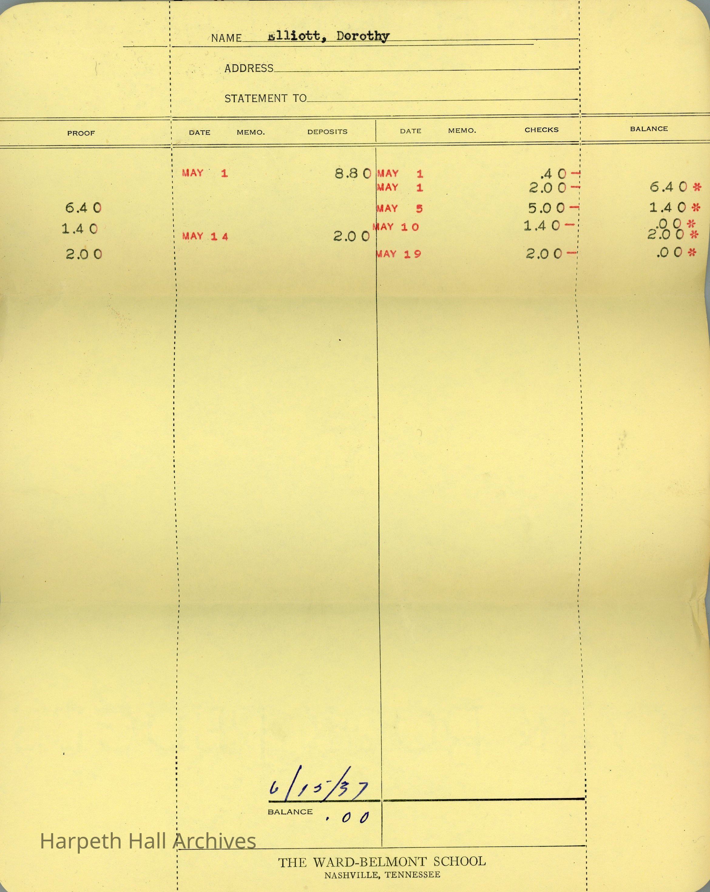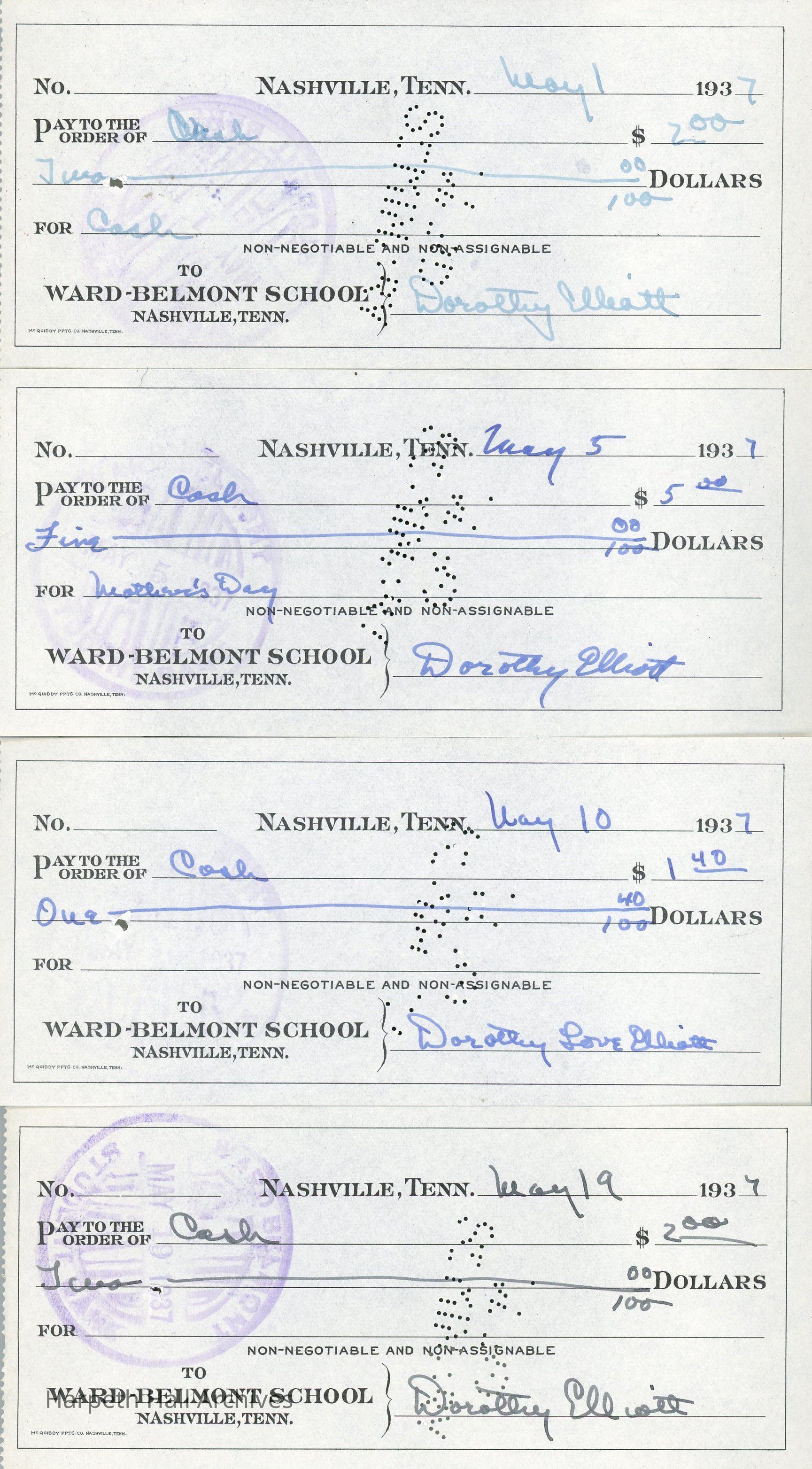Five Ward-Belmont checks, filled out and given to the school by student Dorothy Elliott for various expenses in 1937. Also included is a financial statement and receipt.Context