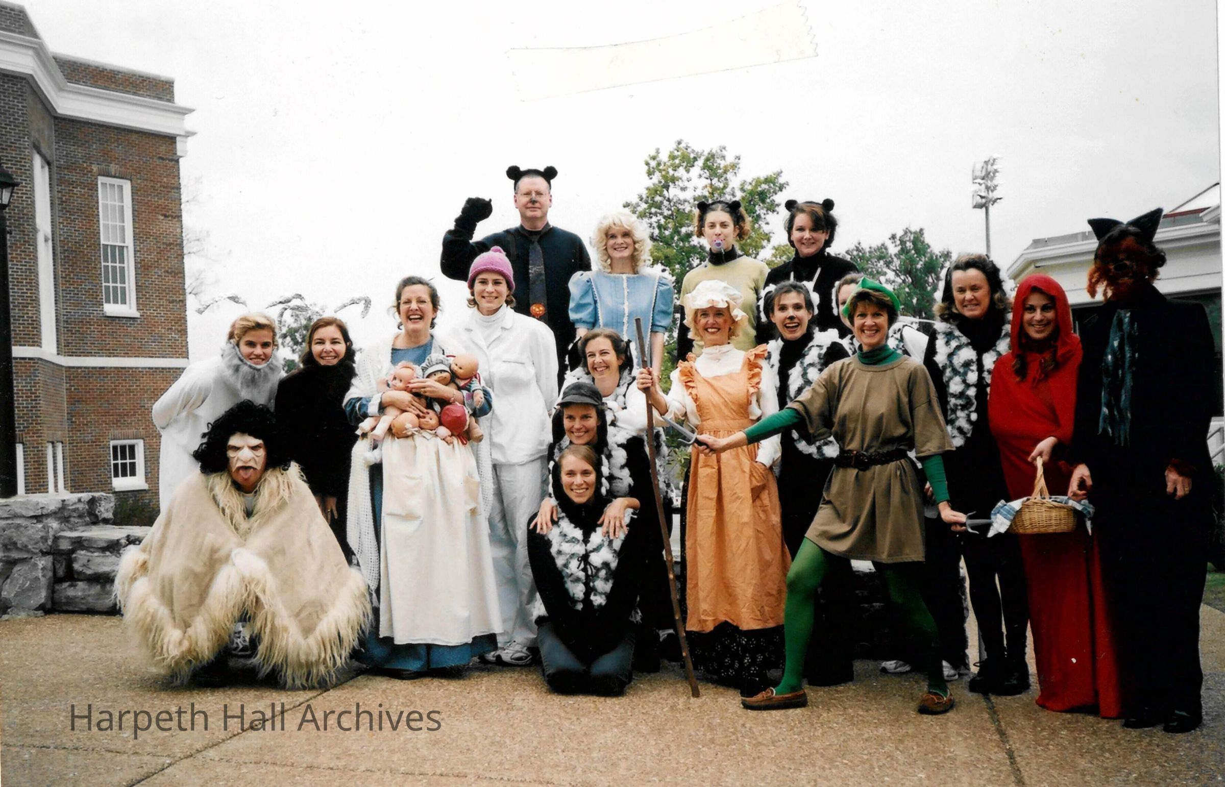 Faculty dressed in Halloween costumes posing outside between the Ann Scott Carrell Library and the Middle School. Might have been a Disney or fairytale theme.Collection