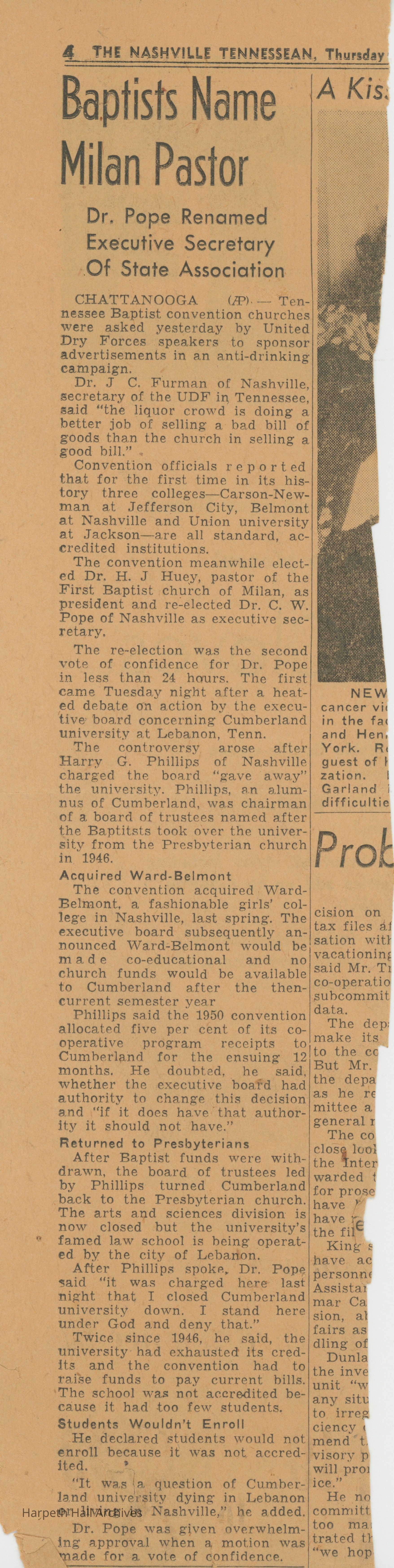 Article on the Tennessee Baptist Convention. It provides updates on the Ward-Belmont and Cumberland University proposed merger and quotes by TBC Dr. Pope on why he imagined the merger would have been beneficial.Collection