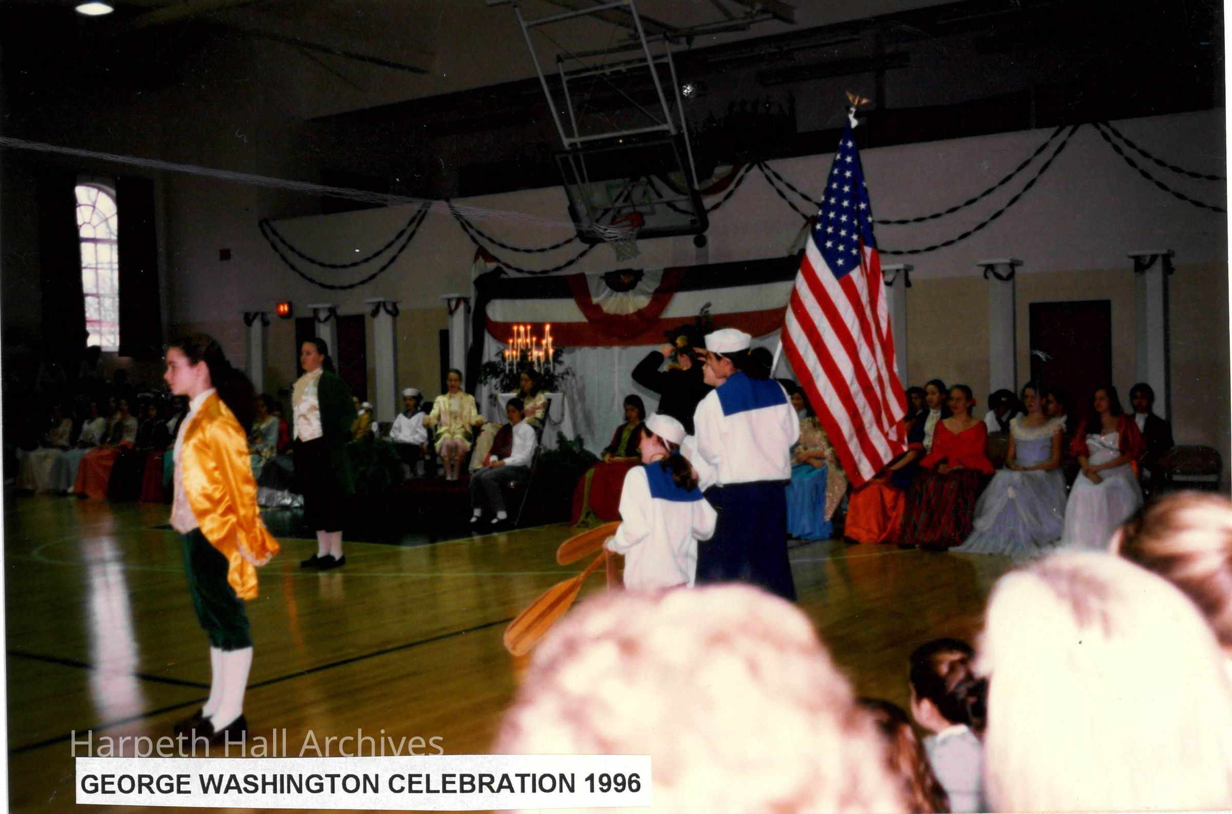 Students performing in the George Washington Day Celebration in 1996. The photo was taken in Morrison Gym in the McMurry Center.Context