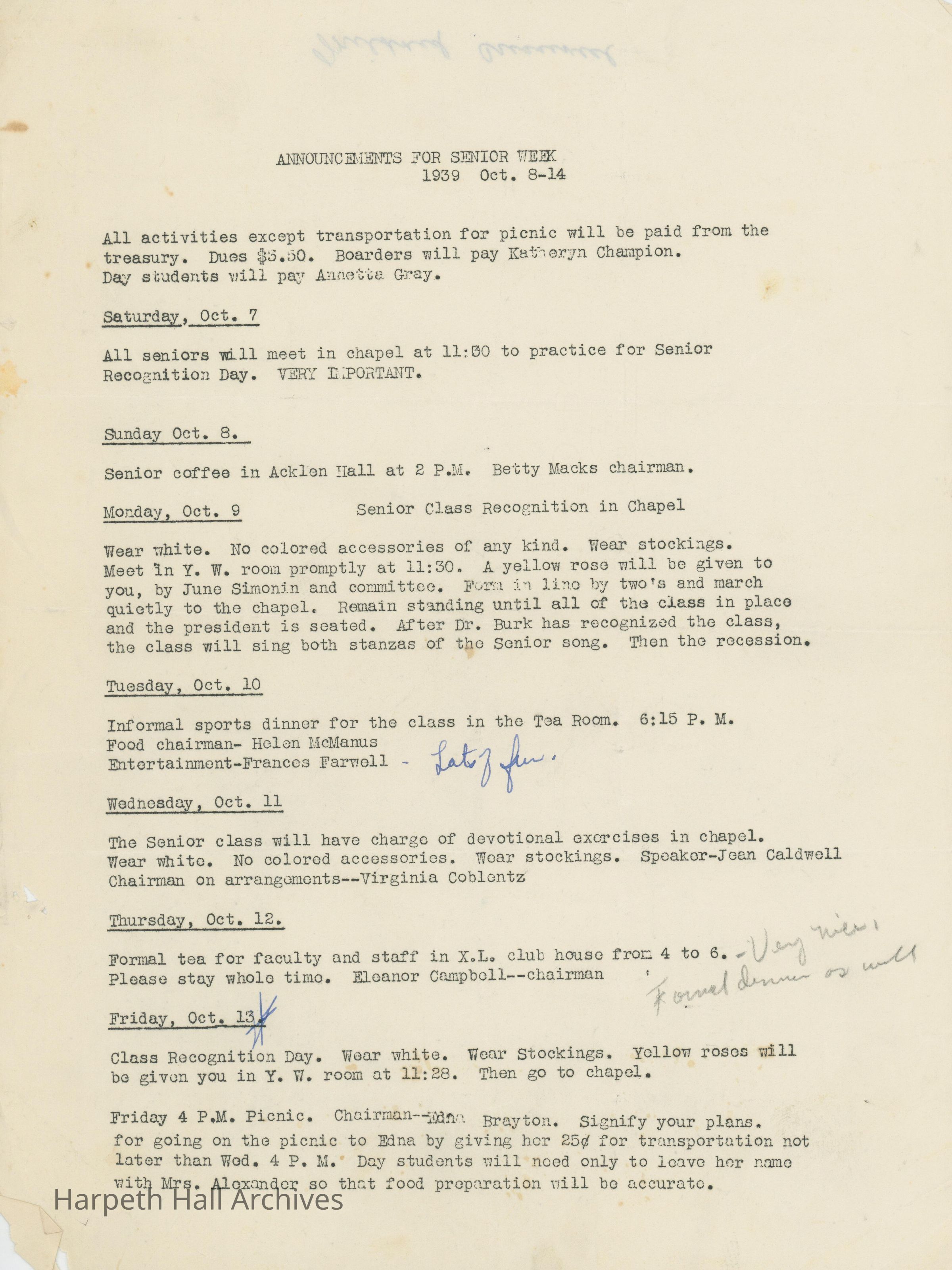 The announcements for senior week at Ward-Belmont. Senior week was scheduled for October 8-14 of 1939.Collection