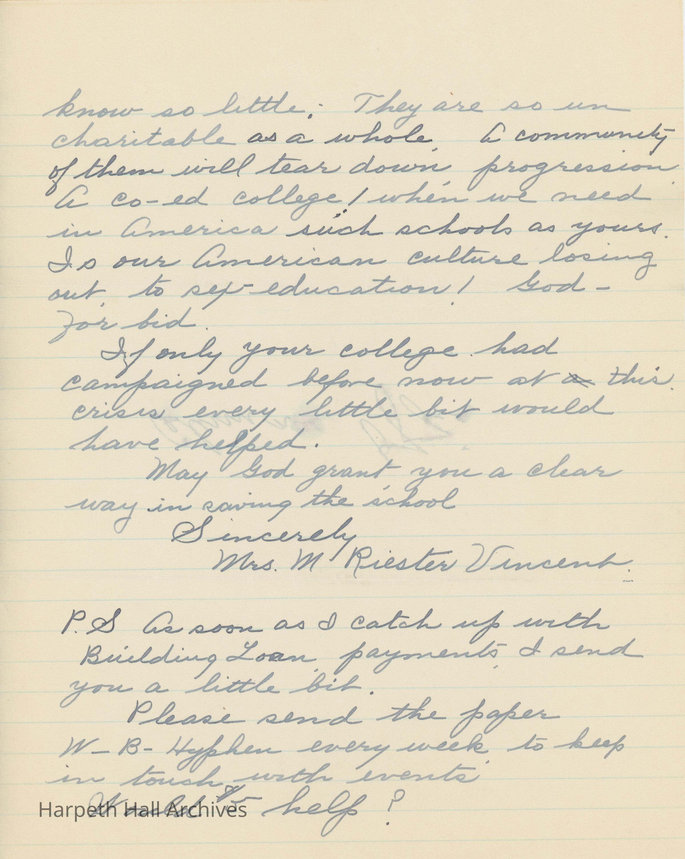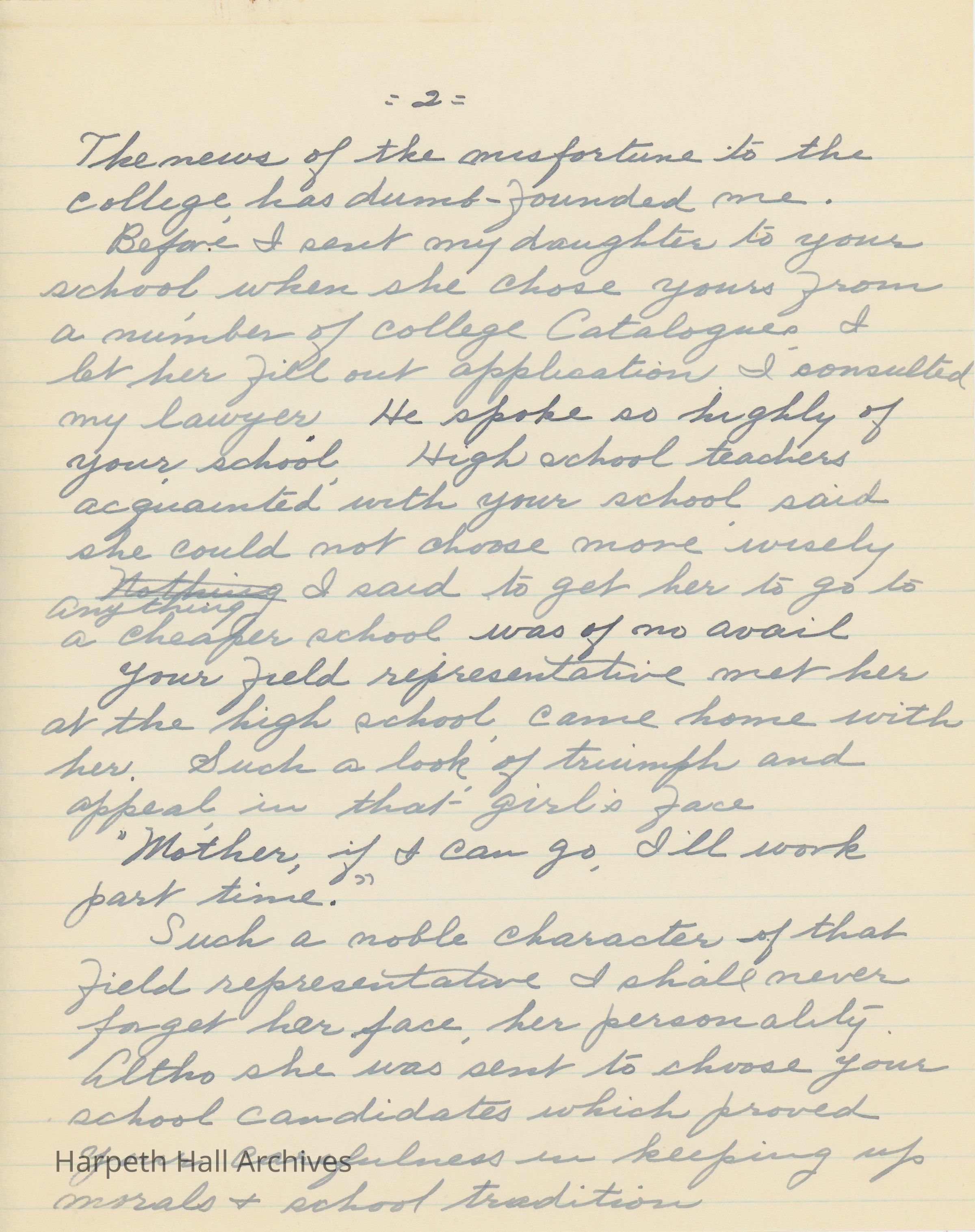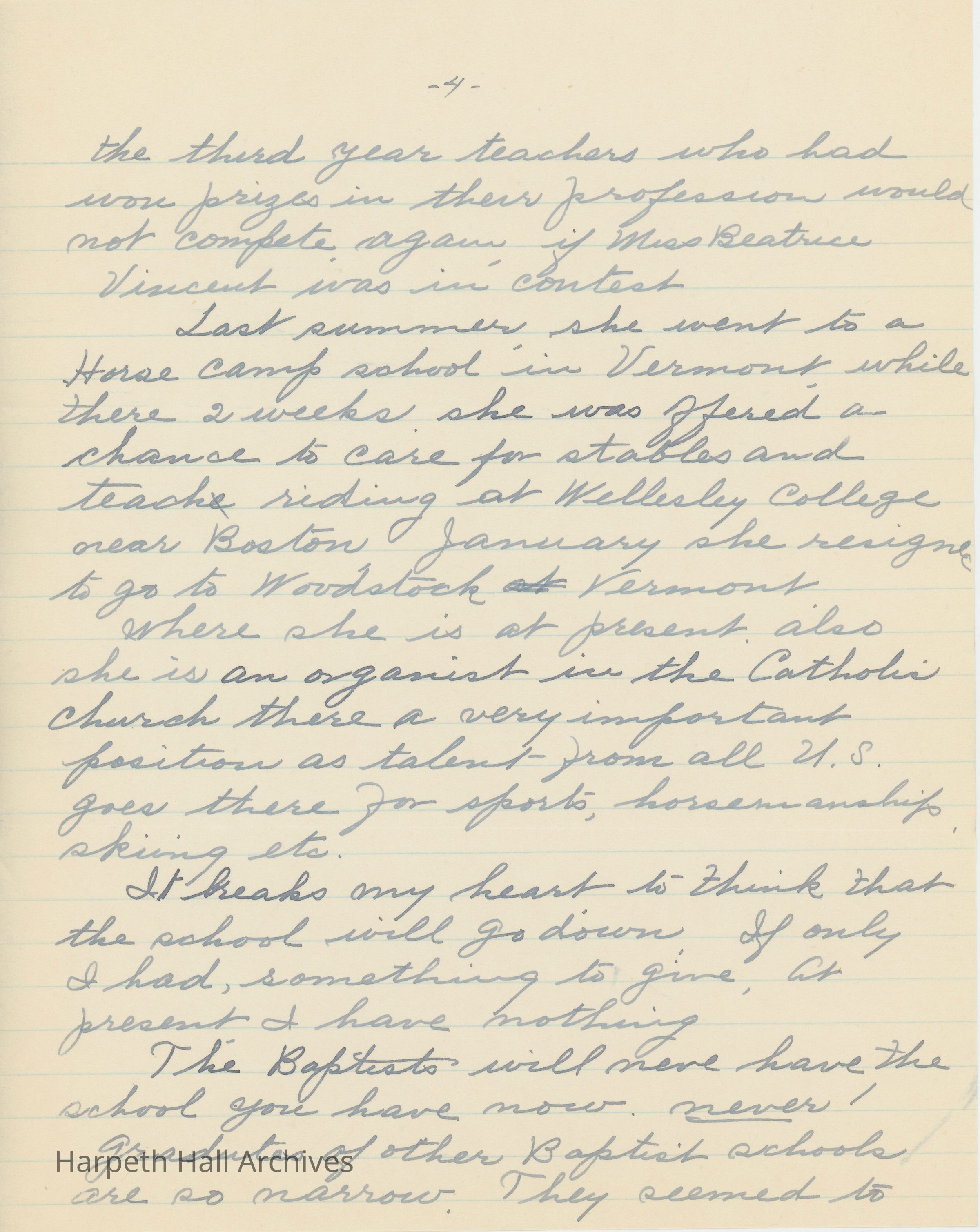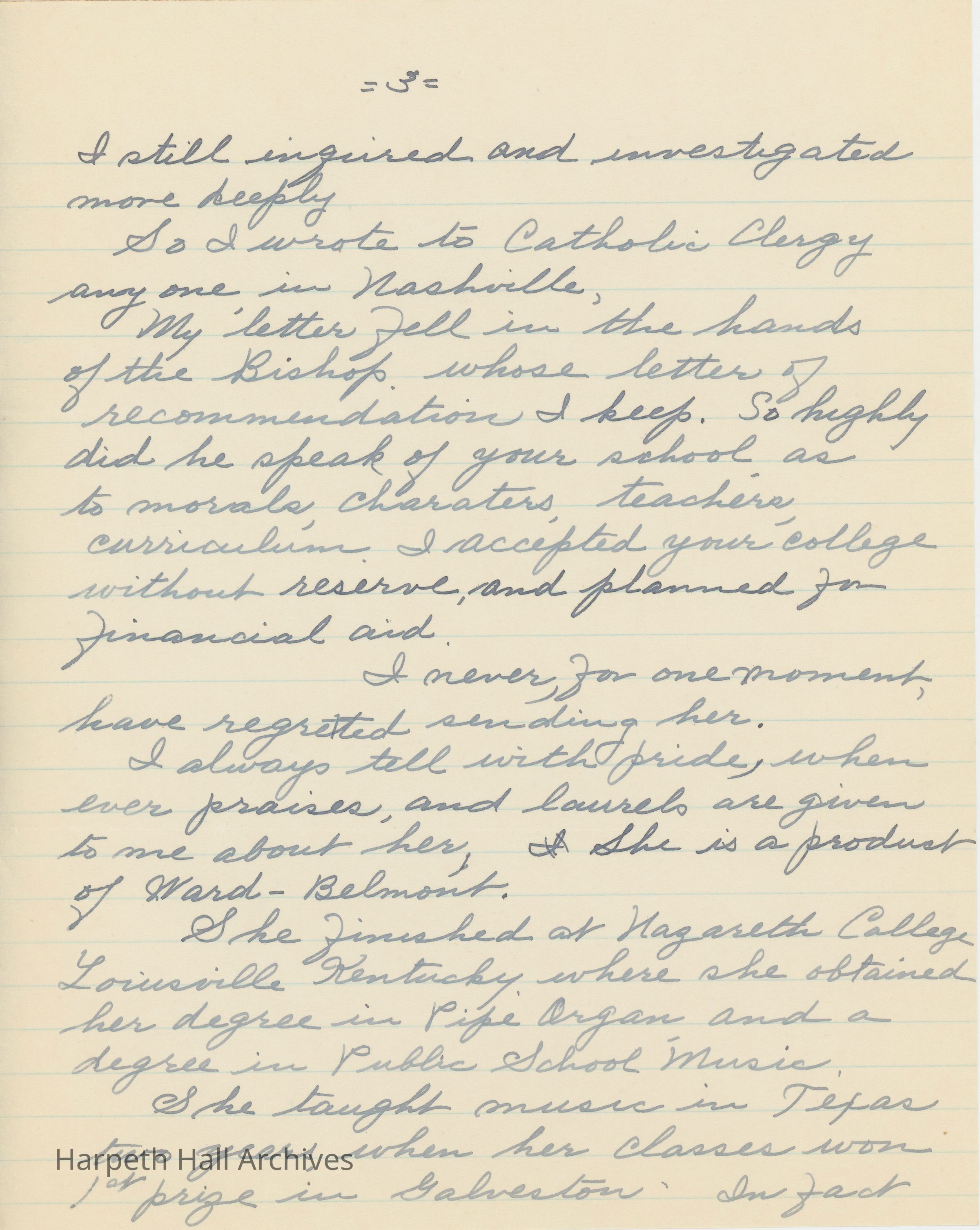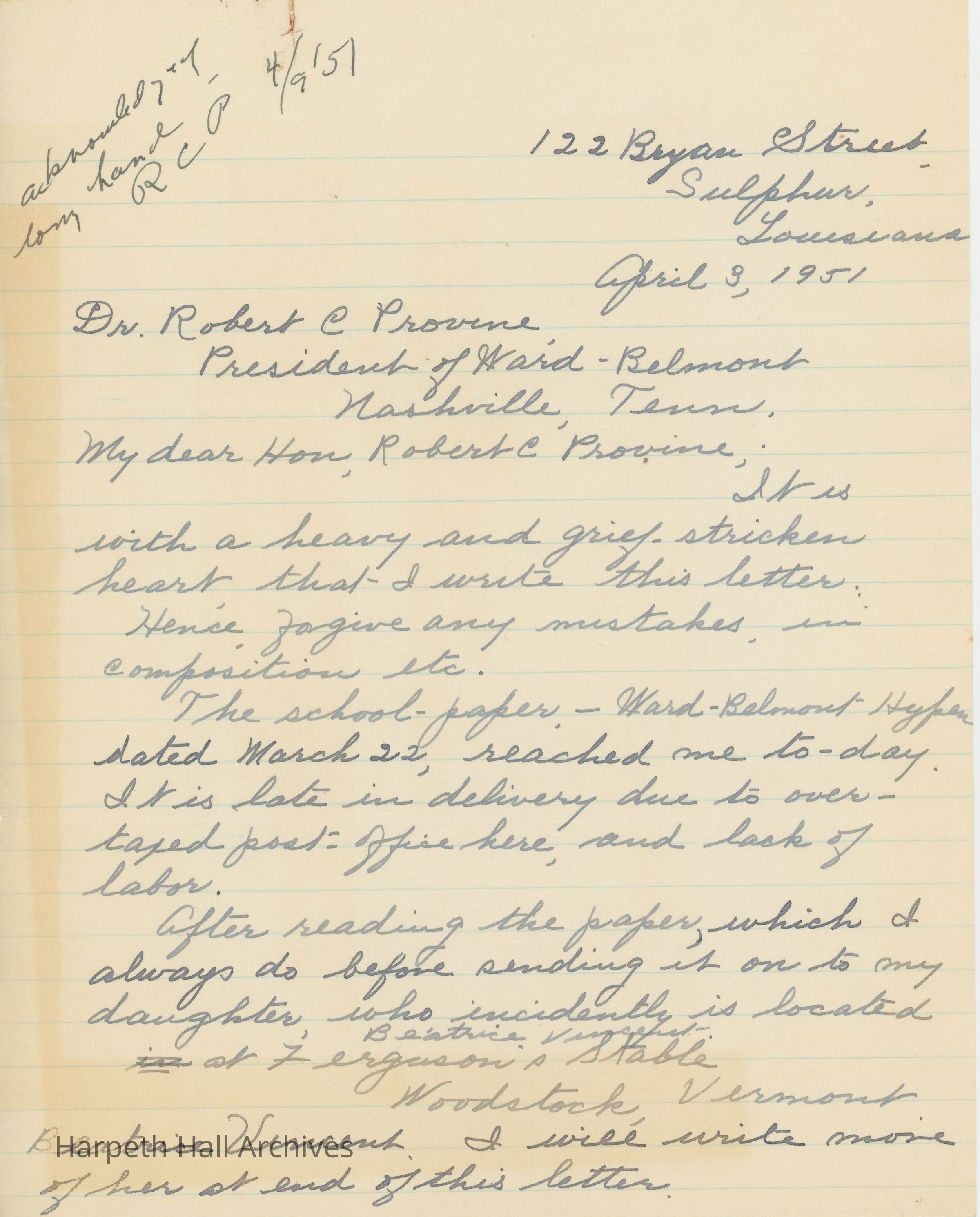 Letter to Dr. Provine from a parent detailing her connection to the school. She talks of how proud she is that her daughter attended Ward-Belmont, and if they could do it again, the family would still choose to send their daughter to WB. She is upset about the Baptist mission that the school will now take on, and she wishes that Ward-Belmont had informed alumnae of their financial state and asked for alumnae support before selling the school to the Baptists.Collection