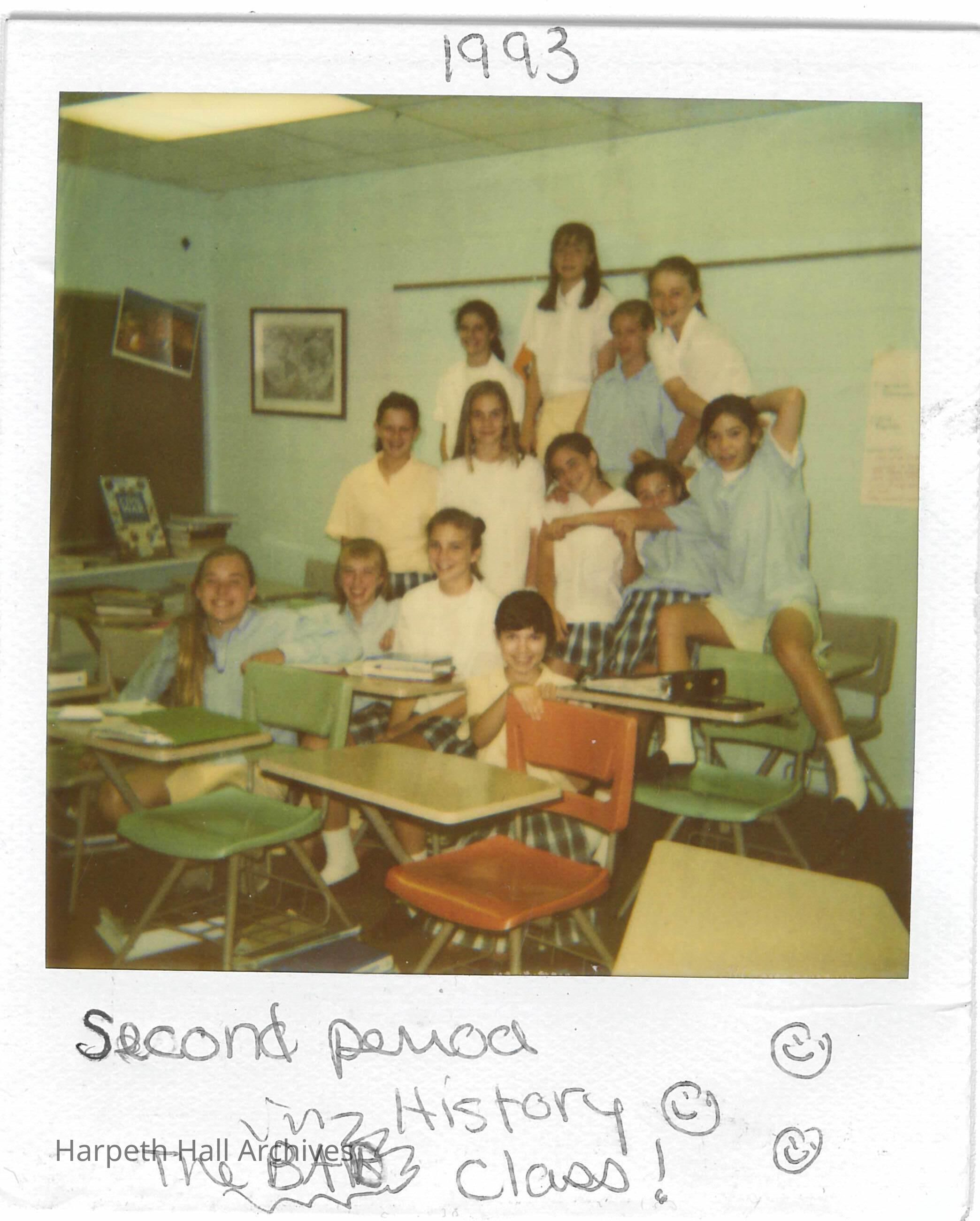 A polaroid of students in a history classroom from 1993 with the caption "Second period history: the BAD class!"Collection