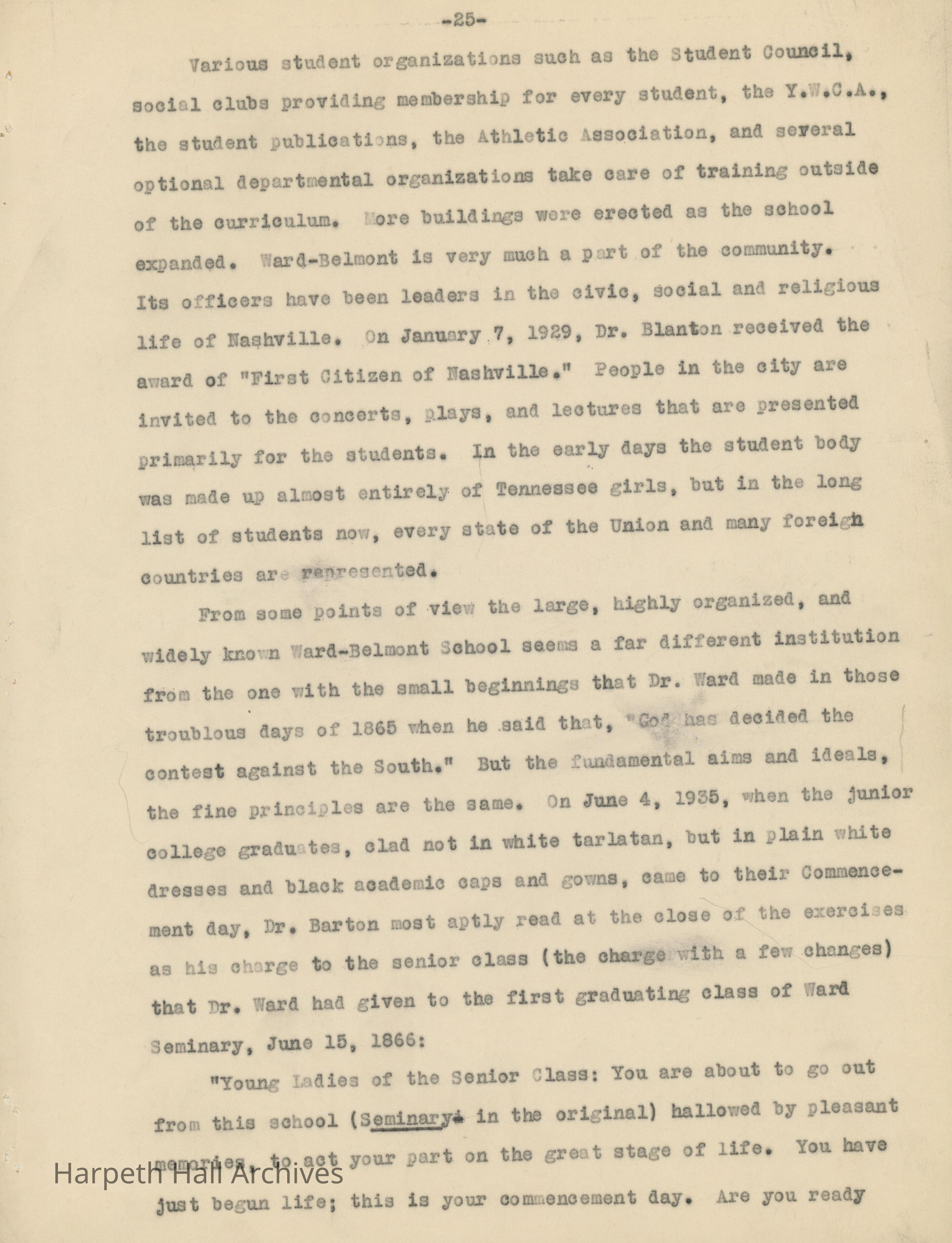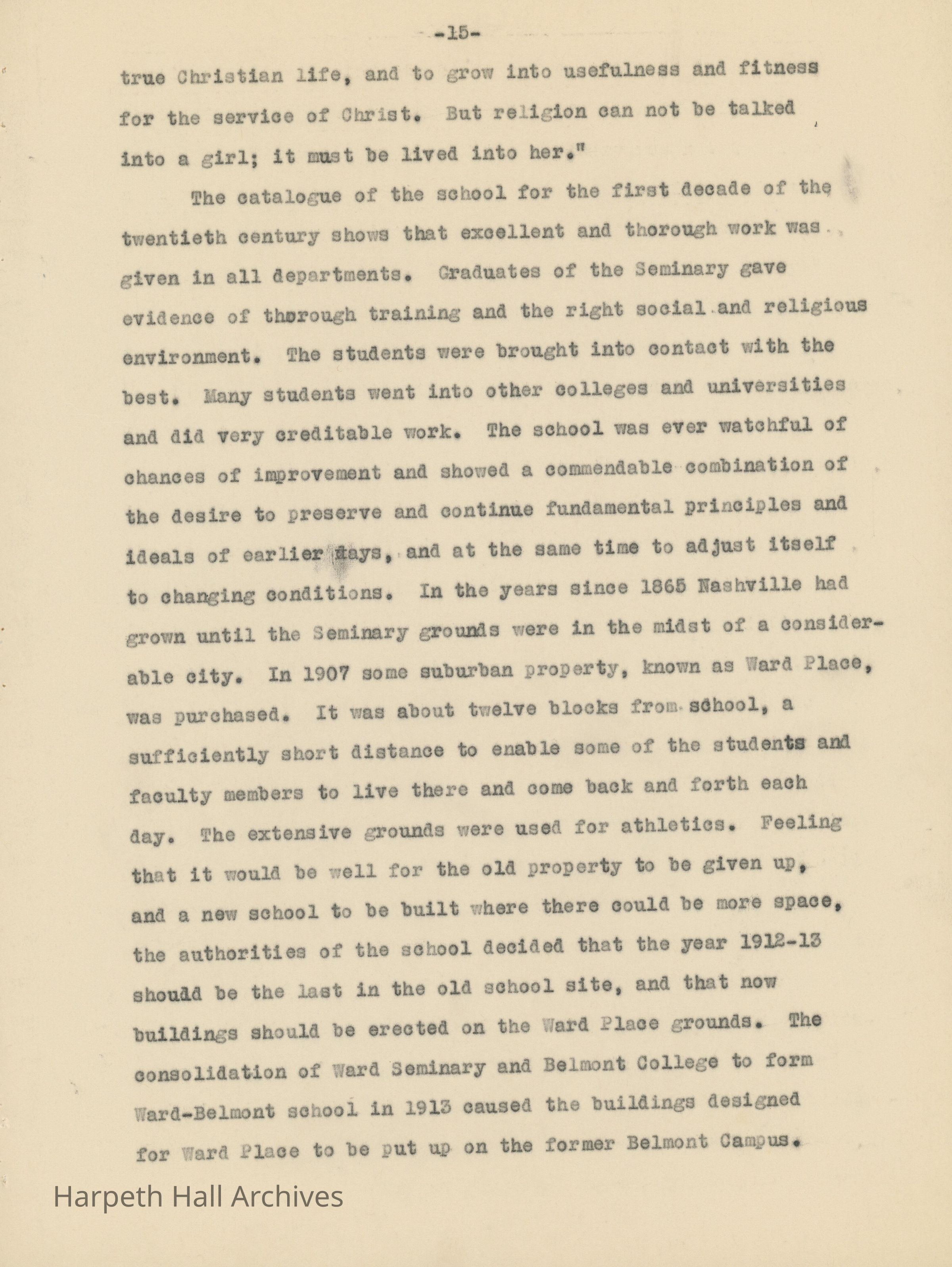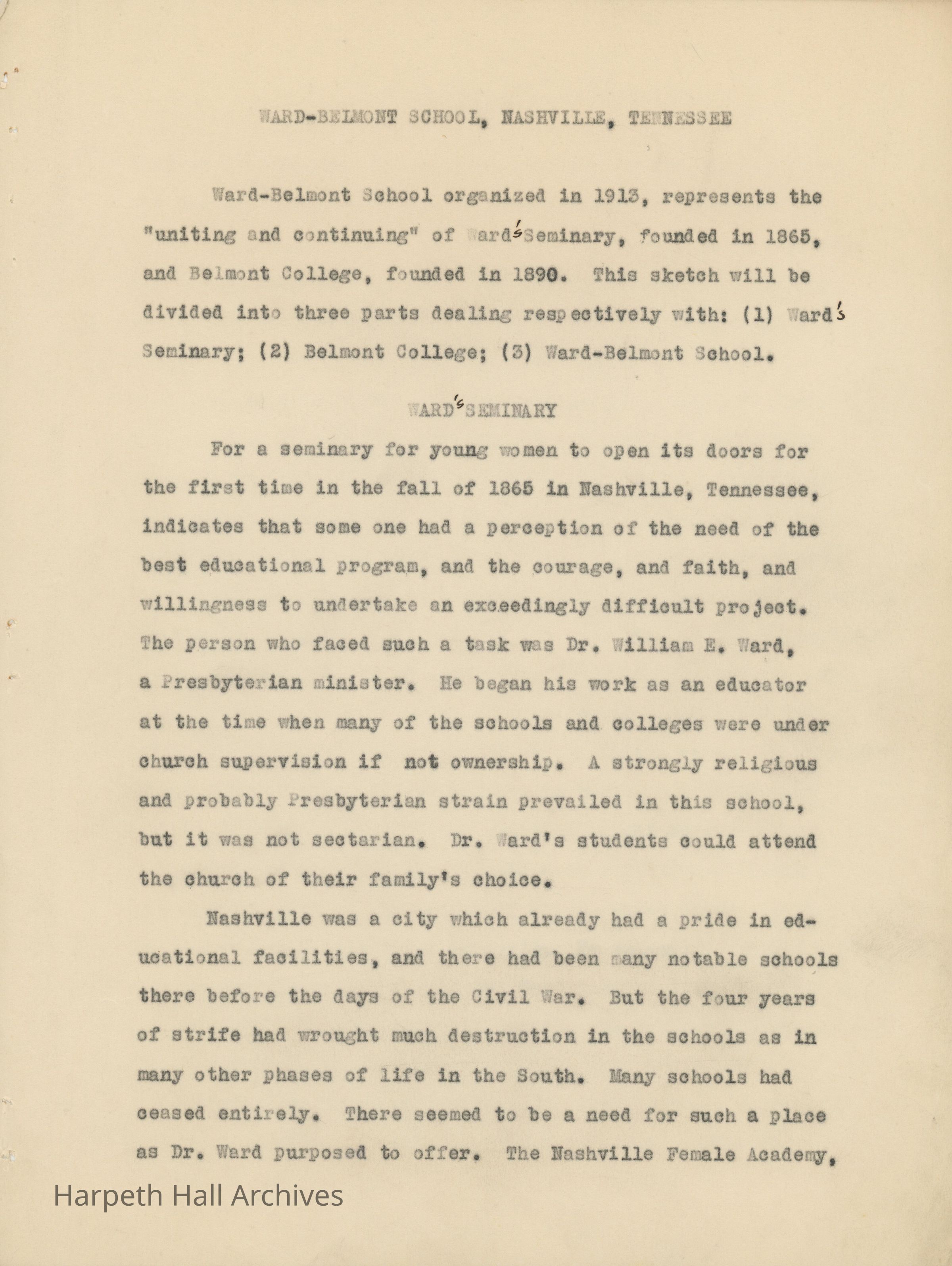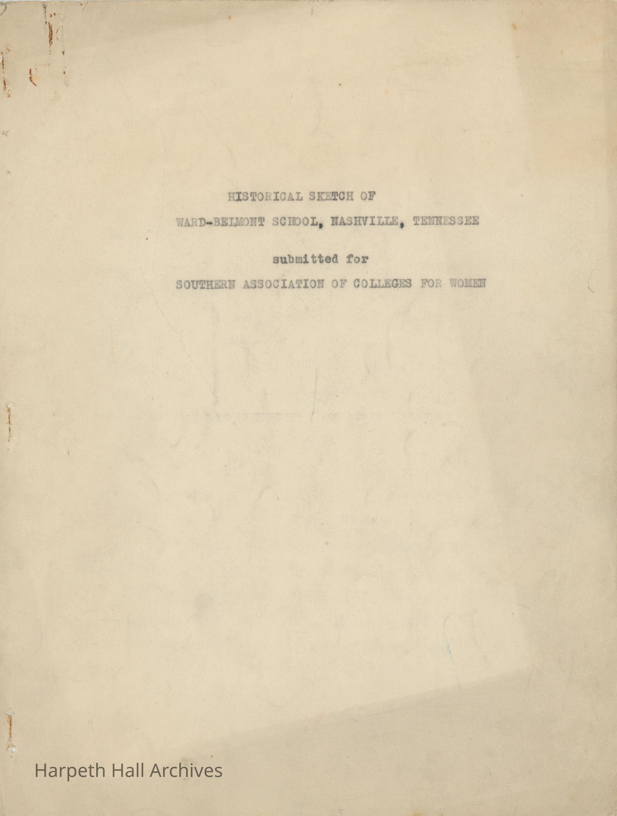 The historical sketch of Ward-Belmont School. The essay was to be completed by September 1st, 1935. The essay was submitted to the Southern Association of Colleges for Women.Collection