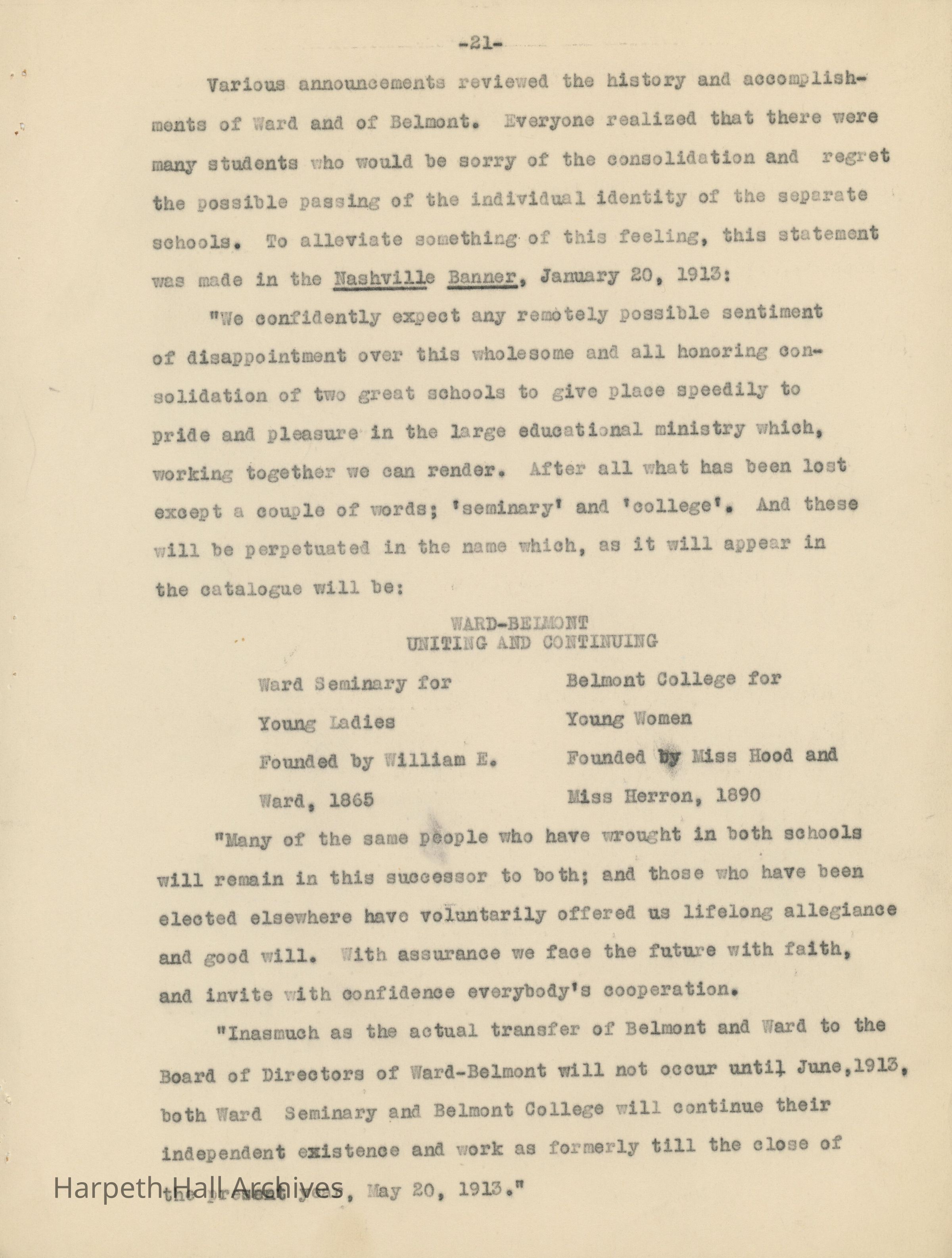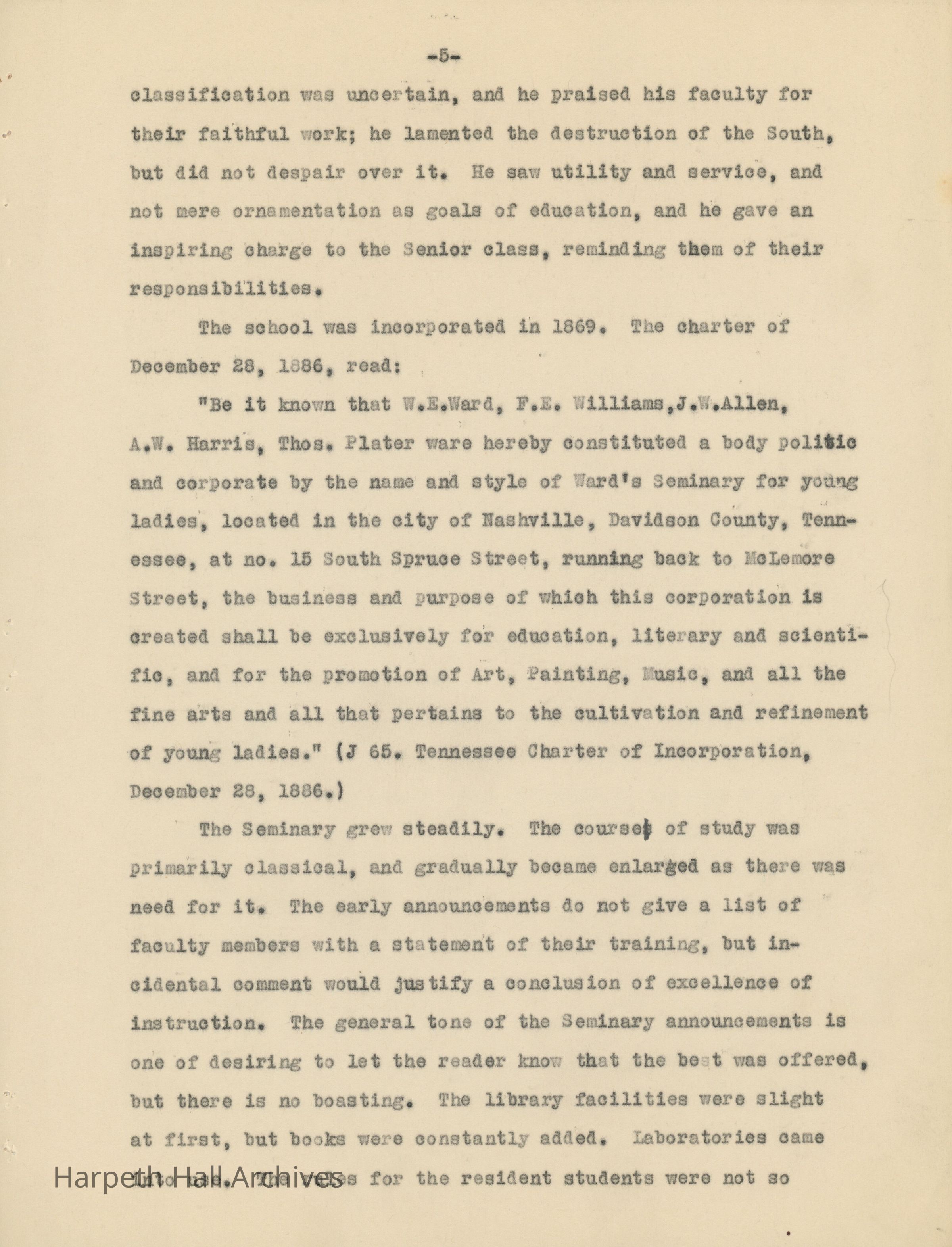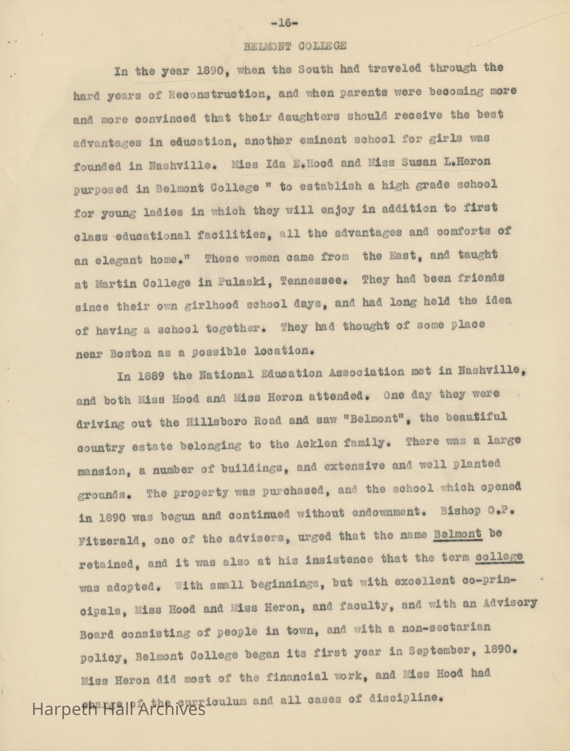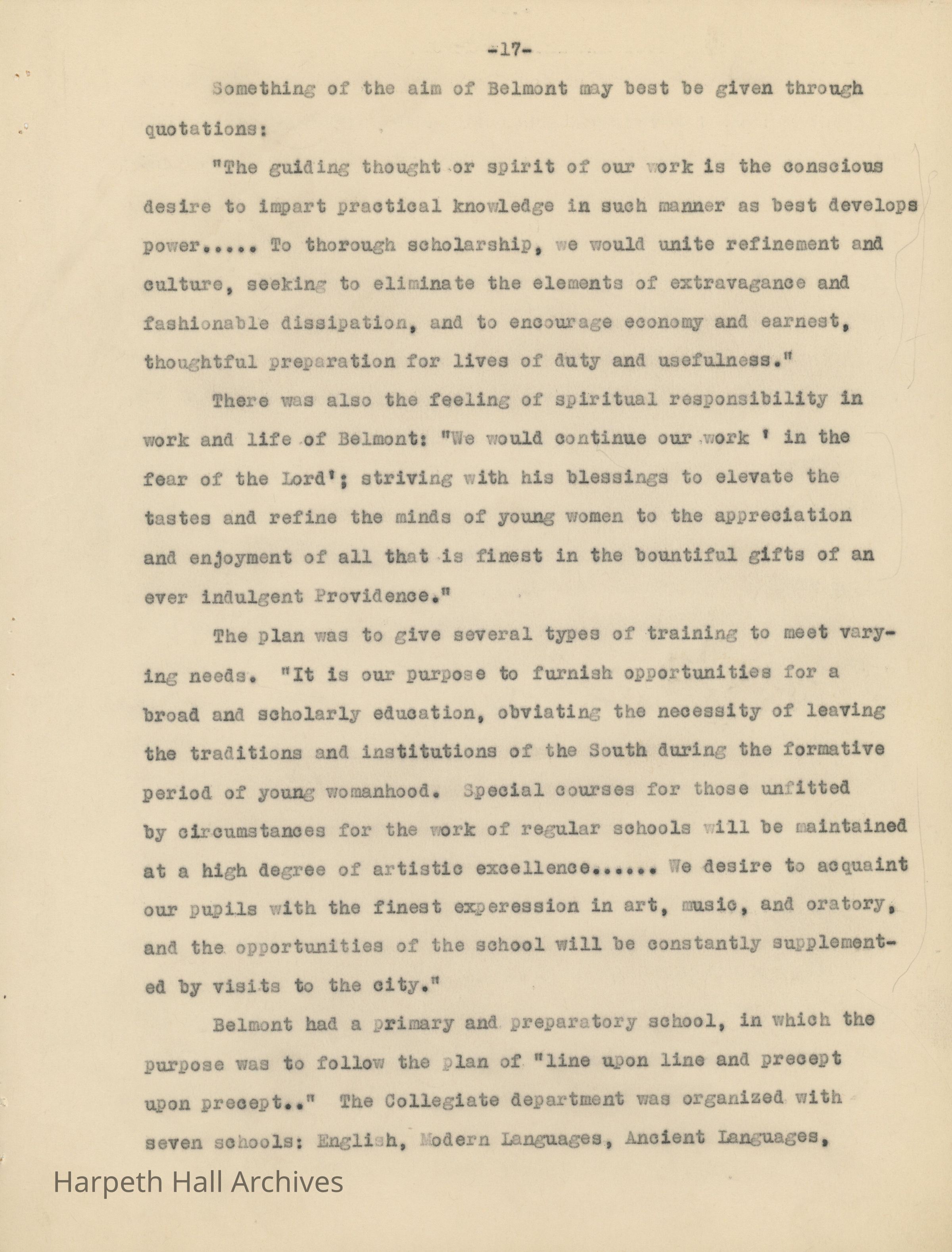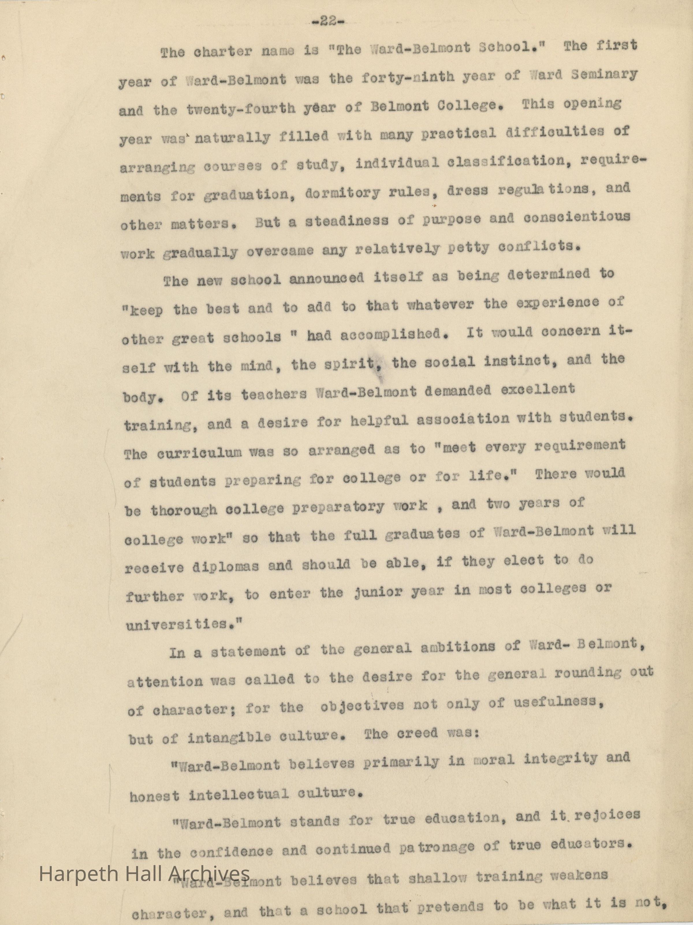 The historical sketch of Ward-Belmont School. The essay was to be completed by September 1st, 1935. The essay was submitted to the Southern Association of Colleges for Women.Collection